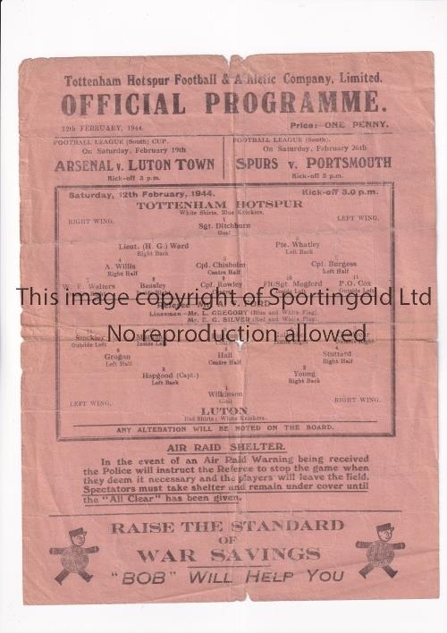 TOTTENHAM HOTSPUR Single sheet programme for the FL South League match v Luton Town 12/2/1944, folded in four, worn and minor tears.. Fair