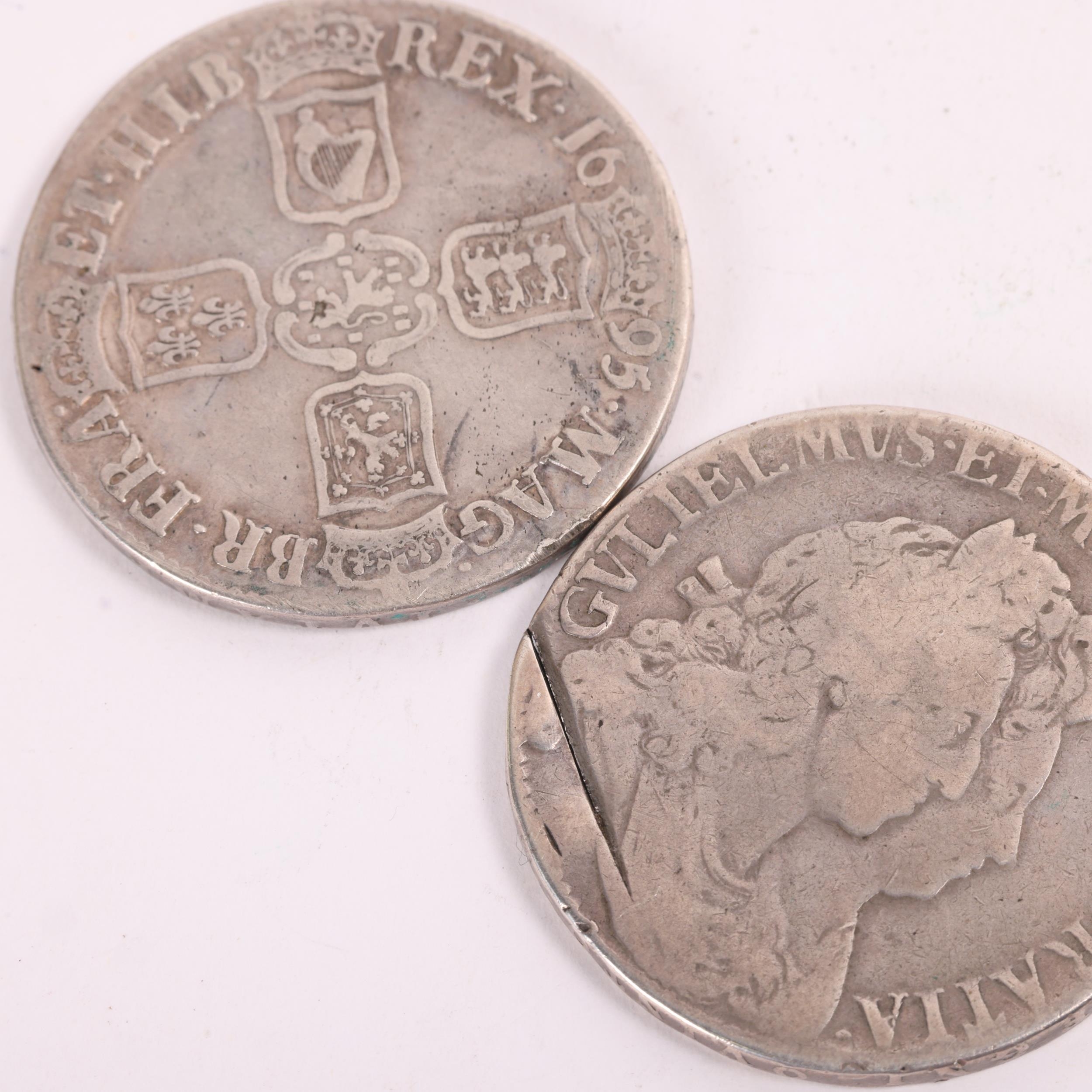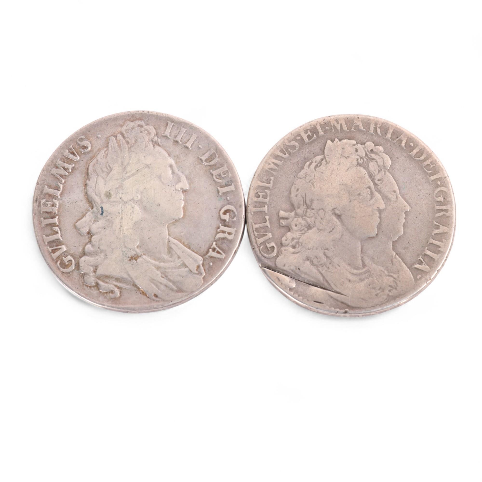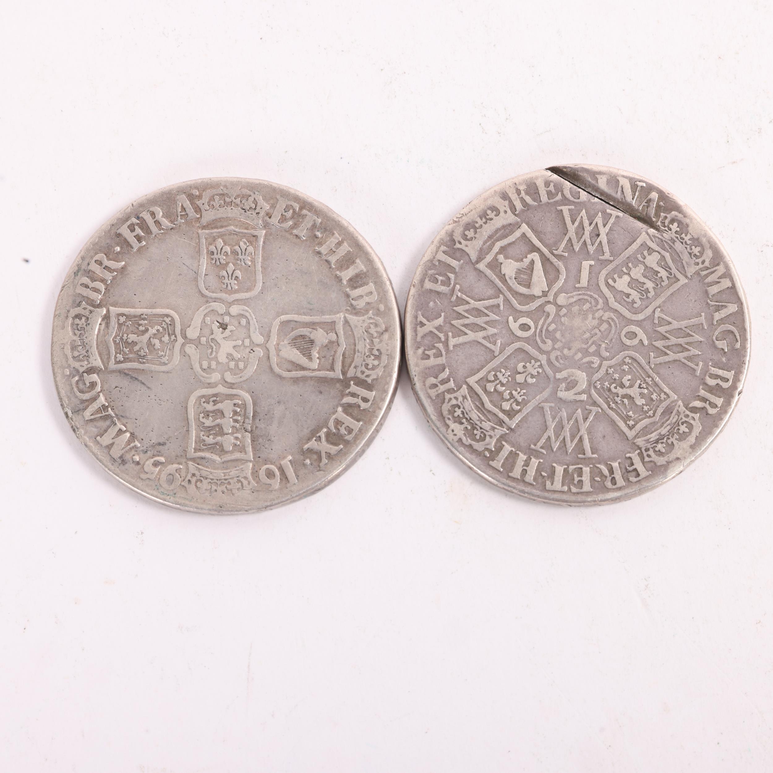 Two English Silver Crown coins, William and Mary 1662, 29.4g, dia 39mm, William III 1695, 29.3g, 39mm