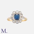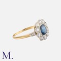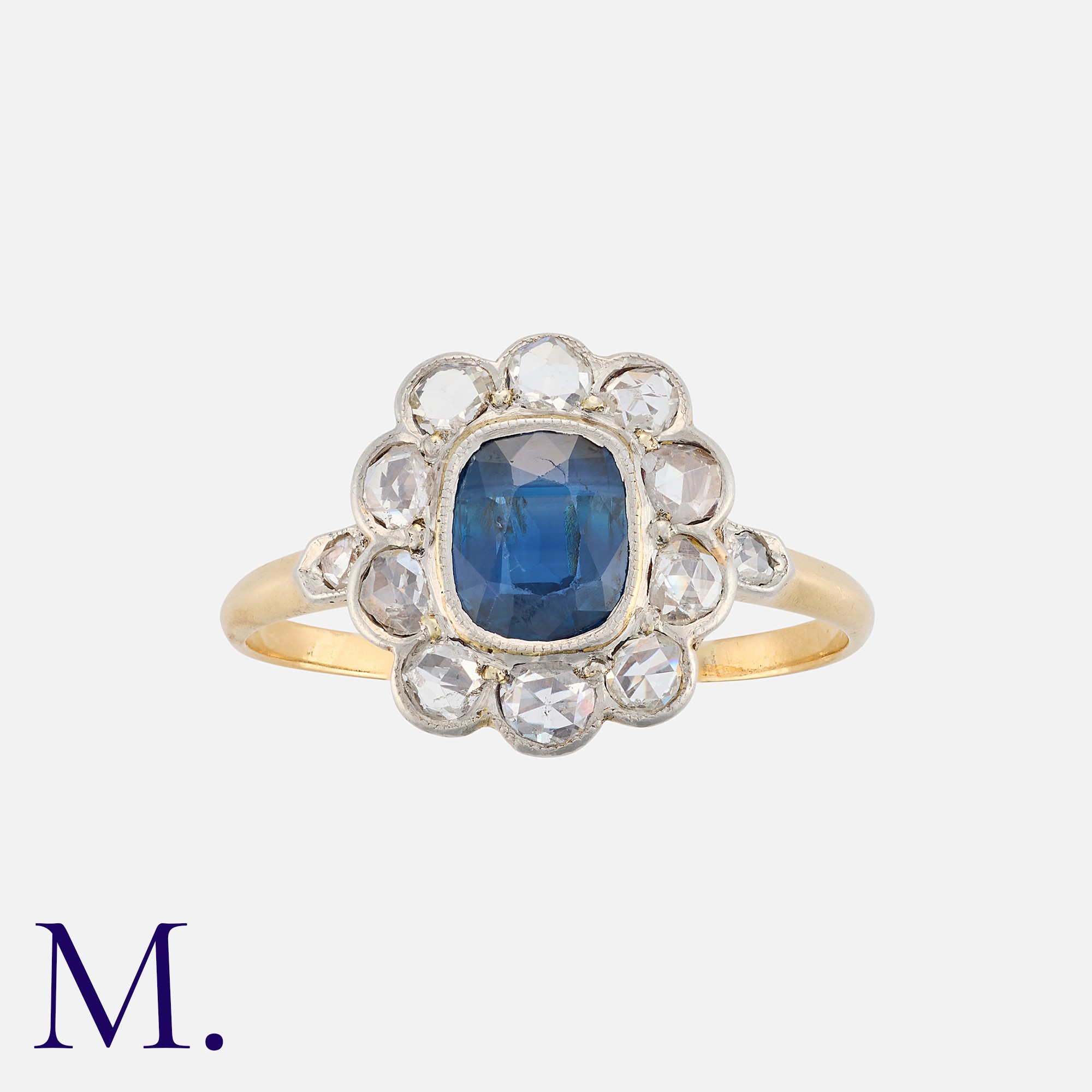 A Sapphire and Diamond Cluster Ring in yellow gold, set with an oval cut blue sapphire to the centre (approx. 6x5mm) with rose cut diamonds in surround. Unmarked, tests indicate 18ct gold with platinum setting.