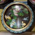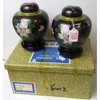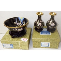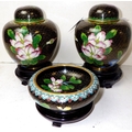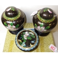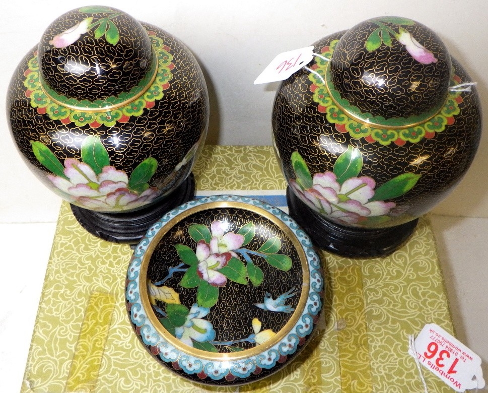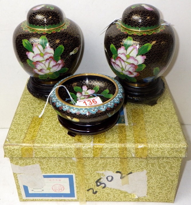 A pair of cloisonné floral ginger jars, 17cm tall, and matching bowl