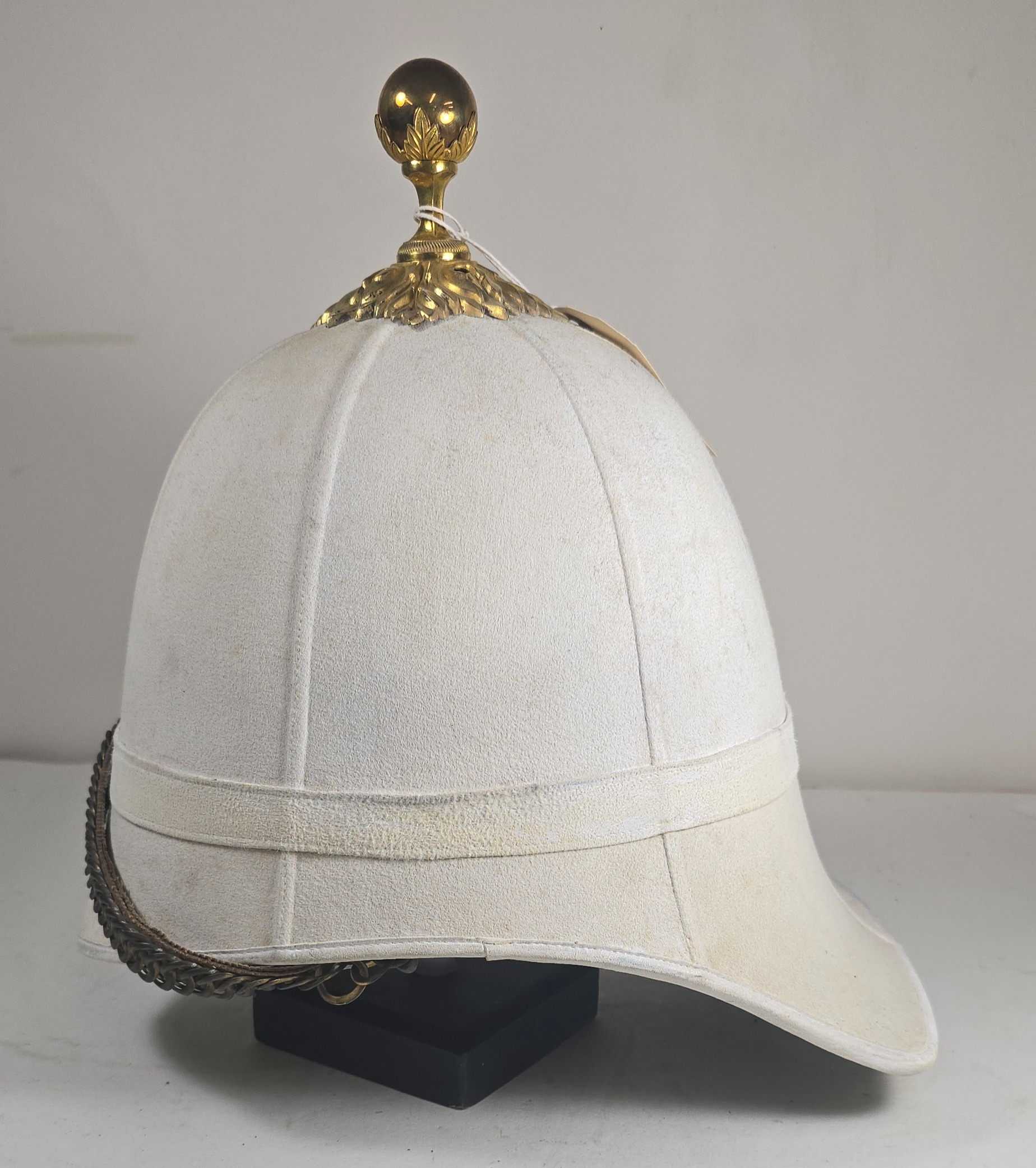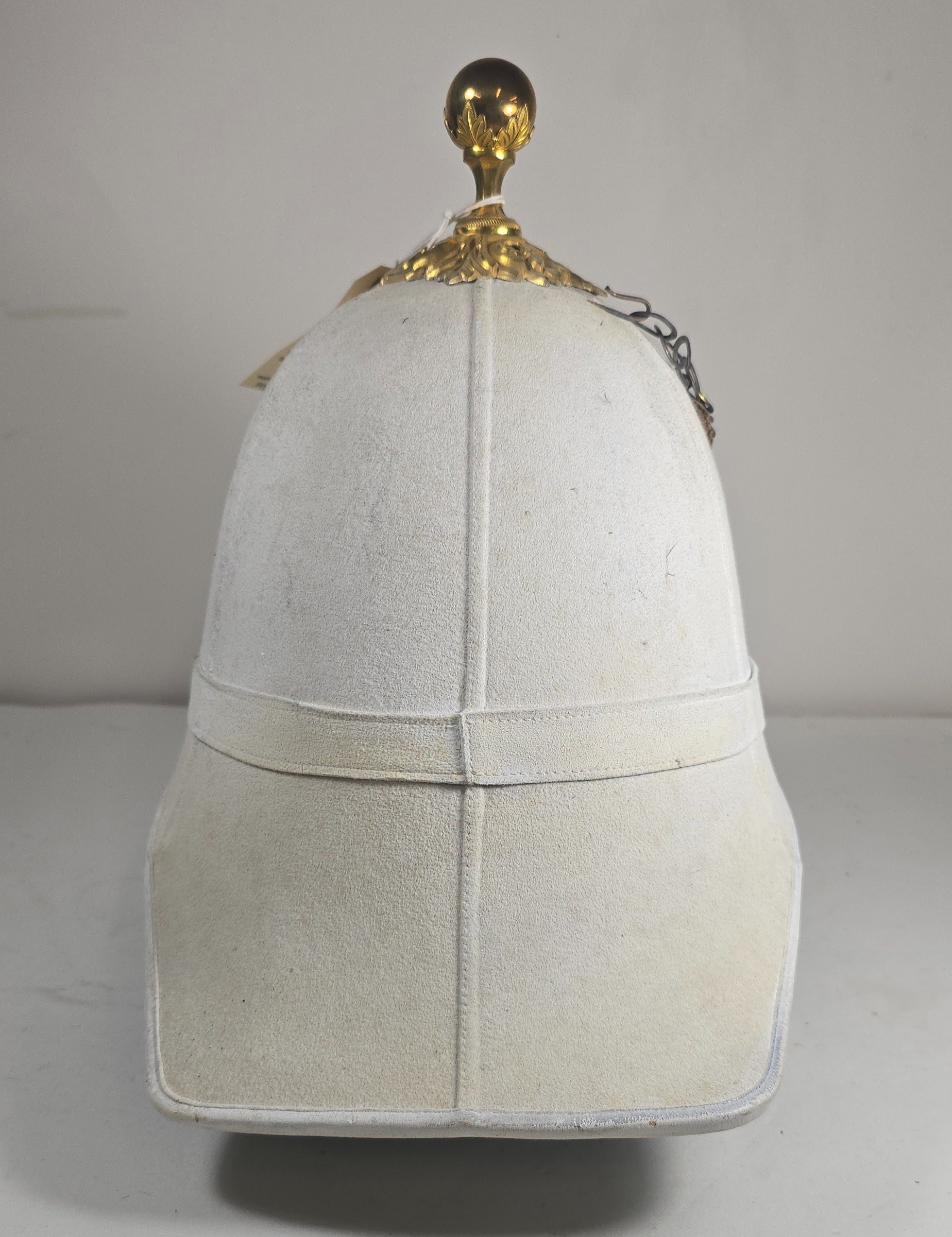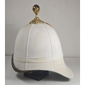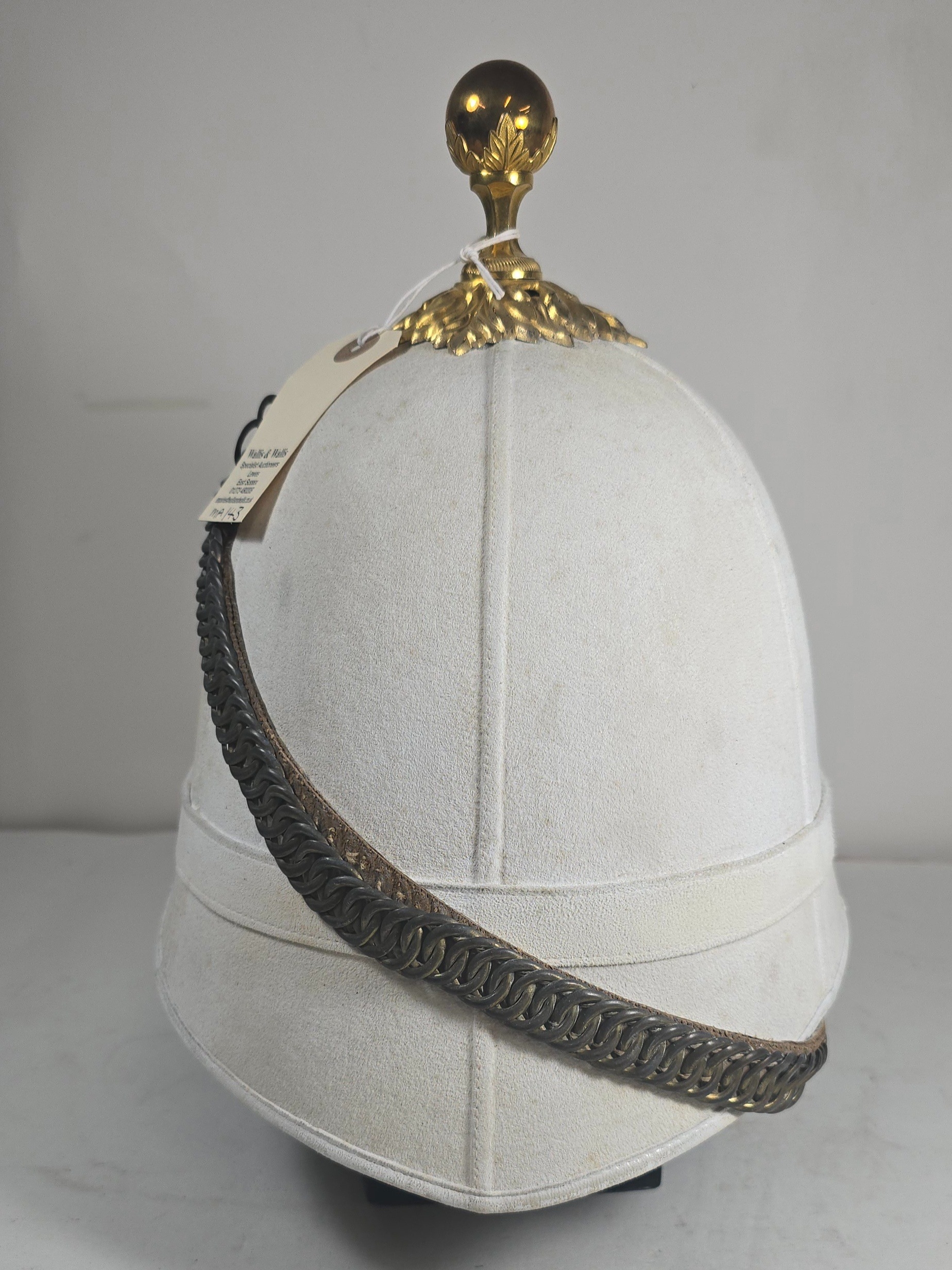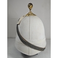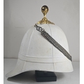 A very scarce Royal Field Artillery Officers foreign service helmet C1890, white cloth with gilt acanthus base and ball mount, chin chain and top hook. Leather sweat band, silk inner lining, inside marked "Hawkes & Co. Picadilly". GC (very slight moth nips to peak lining)