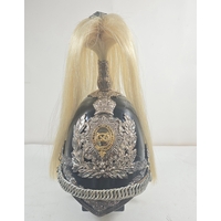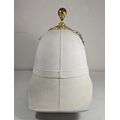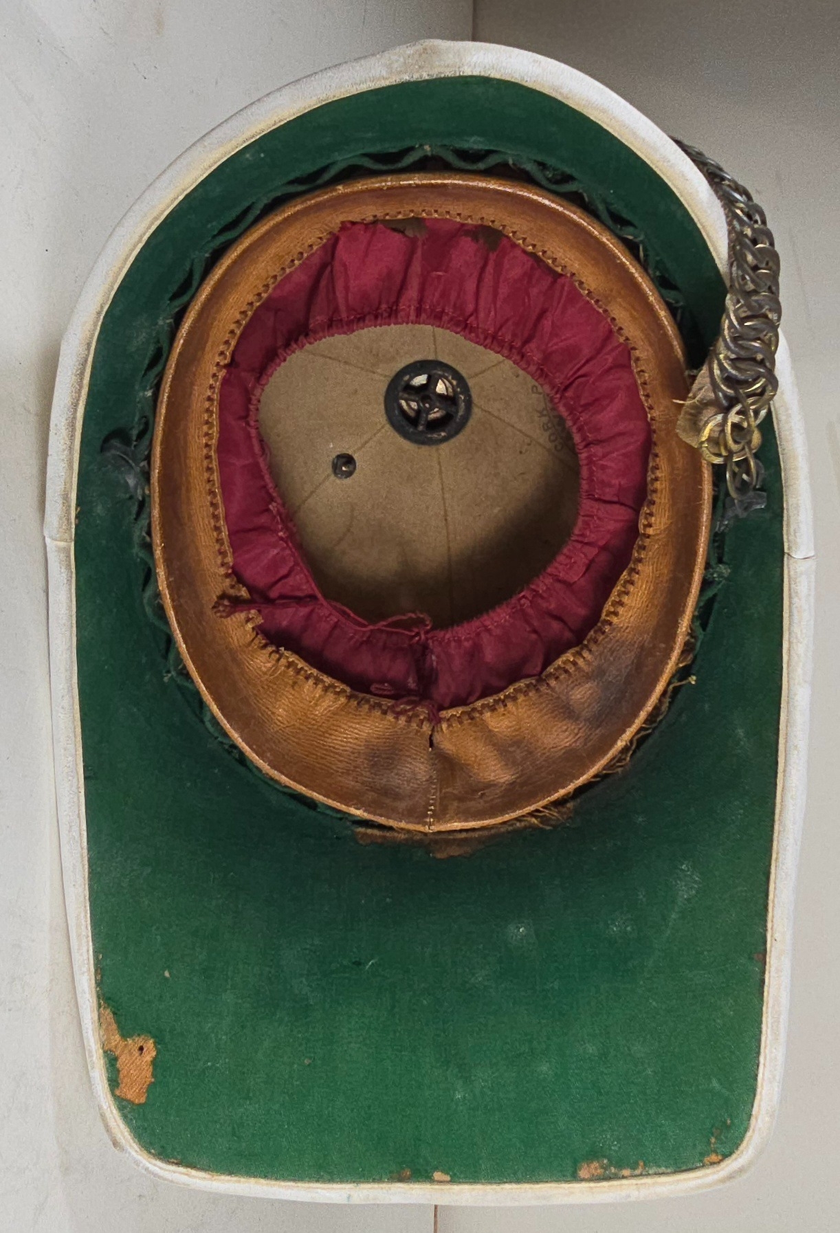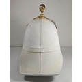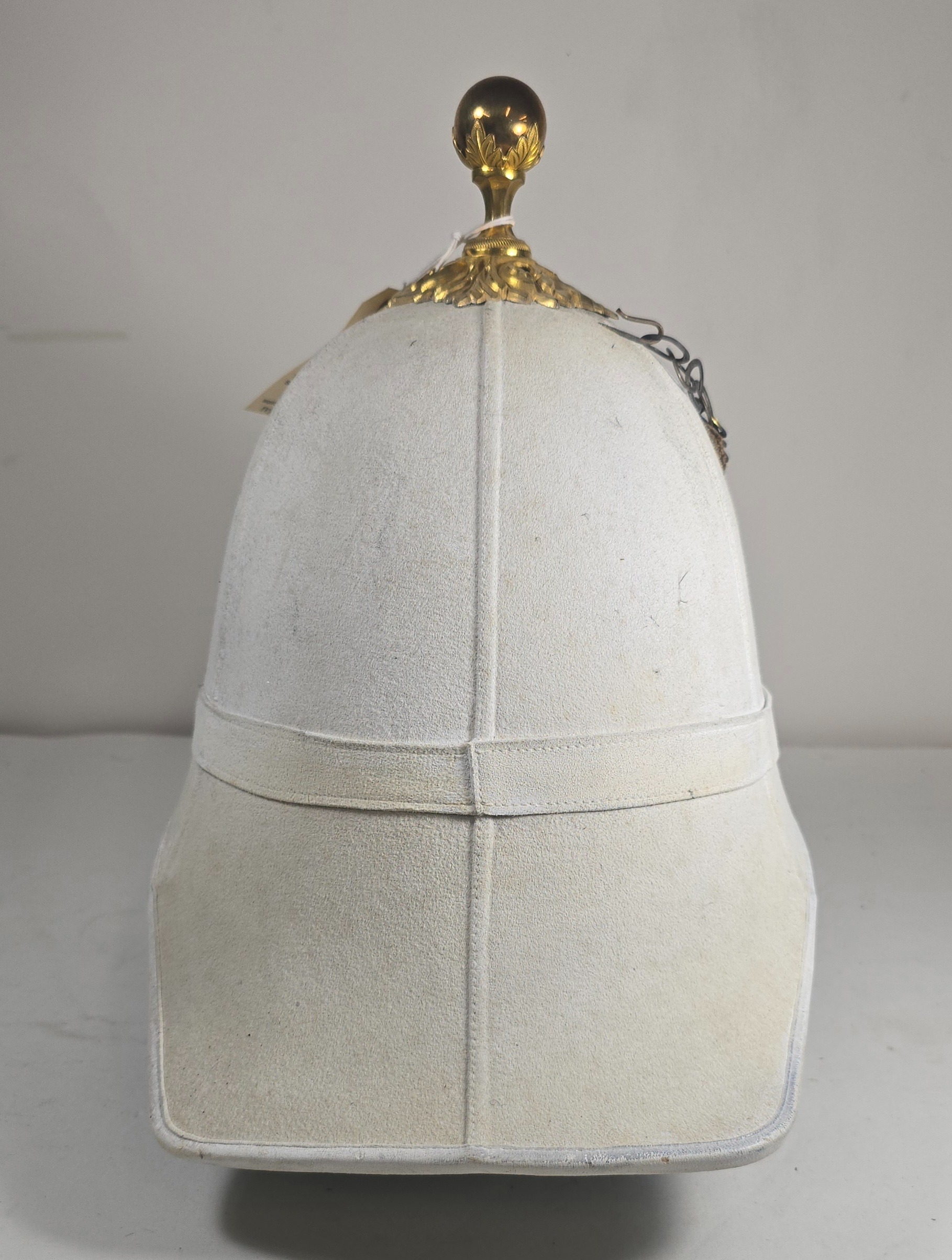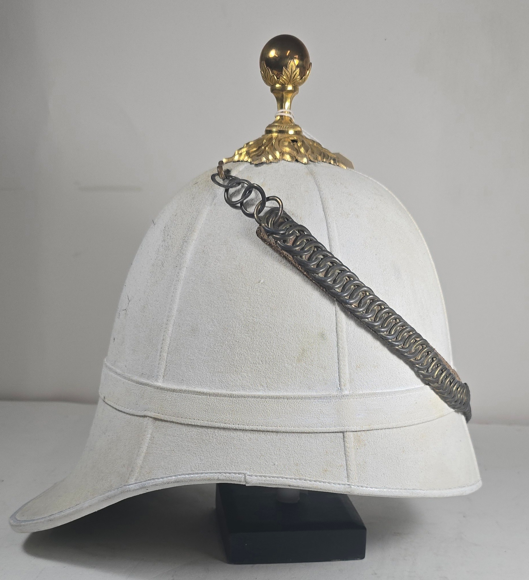 A very scarce Royal Field Artillery Officers foreign service helmet C1890, white cloth with gilt acanthus base and ball mount, chin chain and top hook. Leather sweat band, silk inner lining, inside marked "Hawkes & Co. Picadilly". GC (very slight moth nips to peak lining)