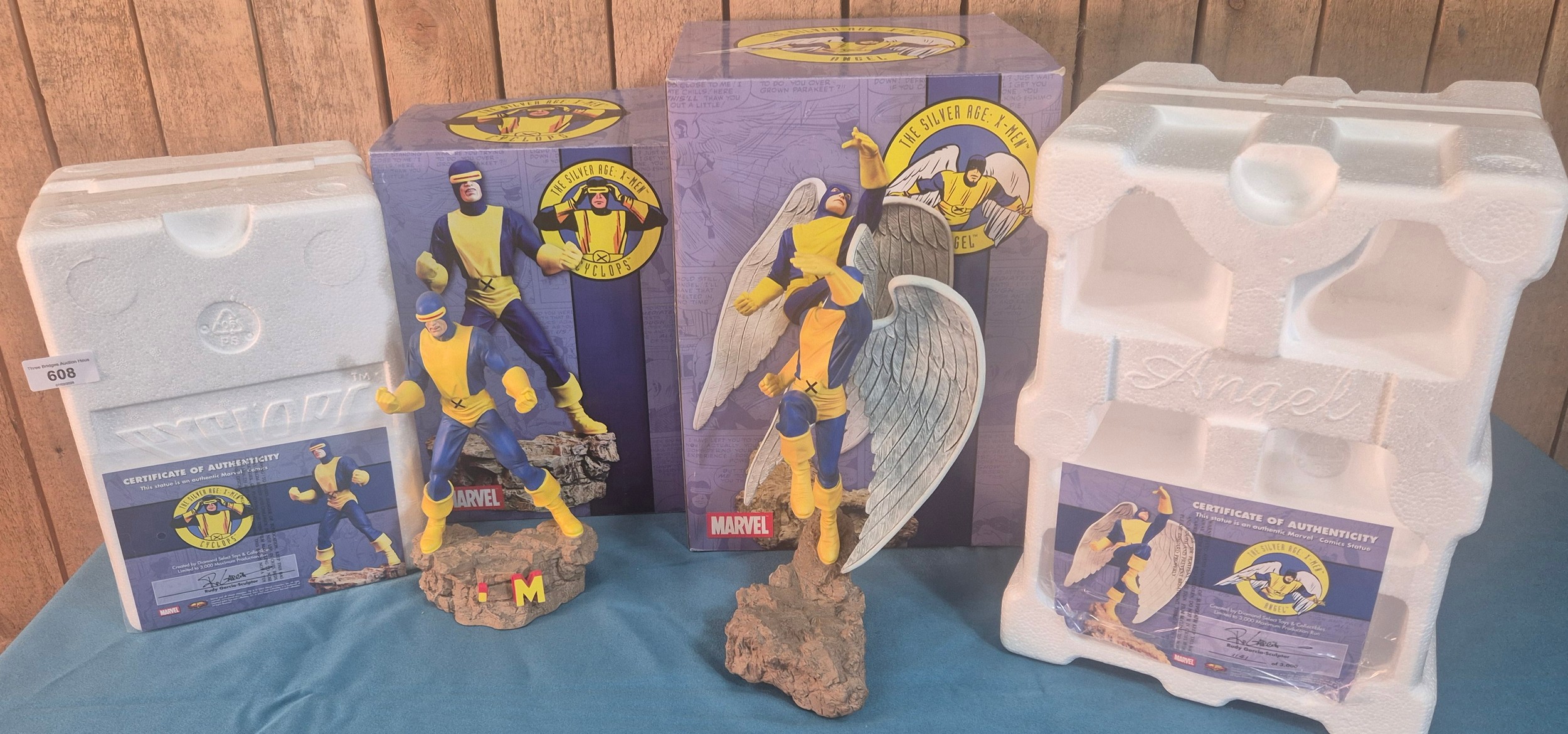 Two Diamond Select Marvel Figures; Limited Edition Cyclops figure with box and certificate, Limited Edition Angel figure with box and certificate.