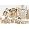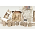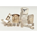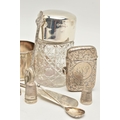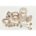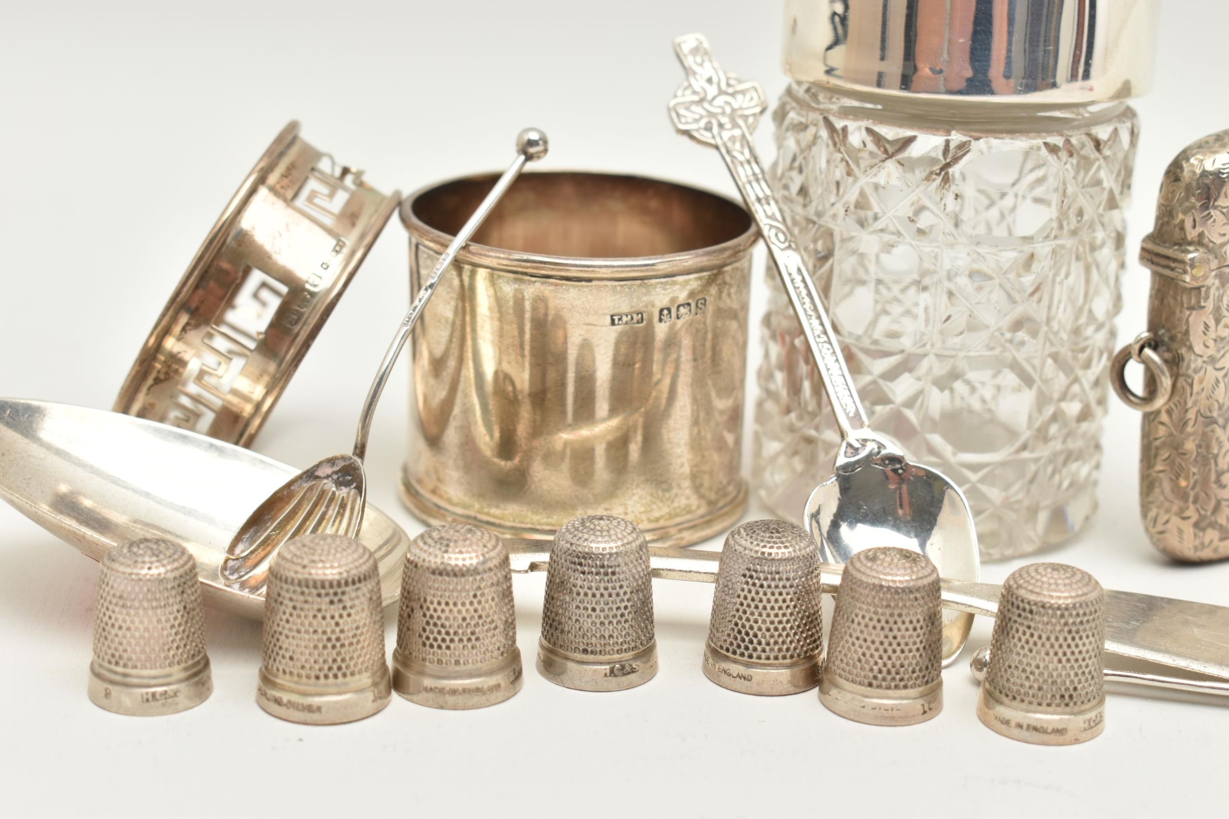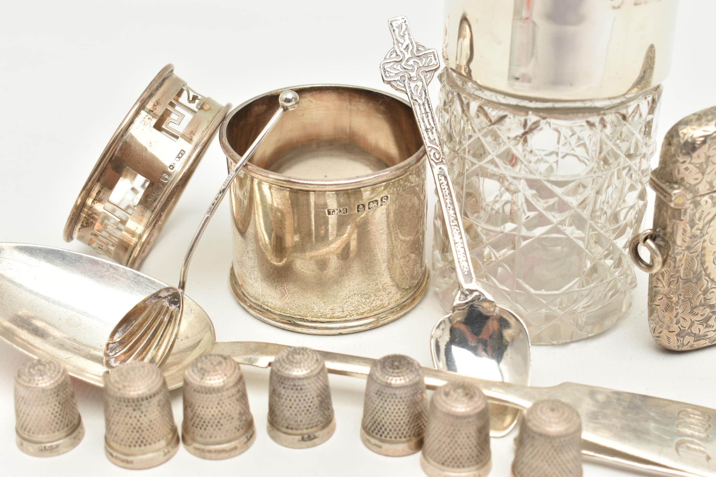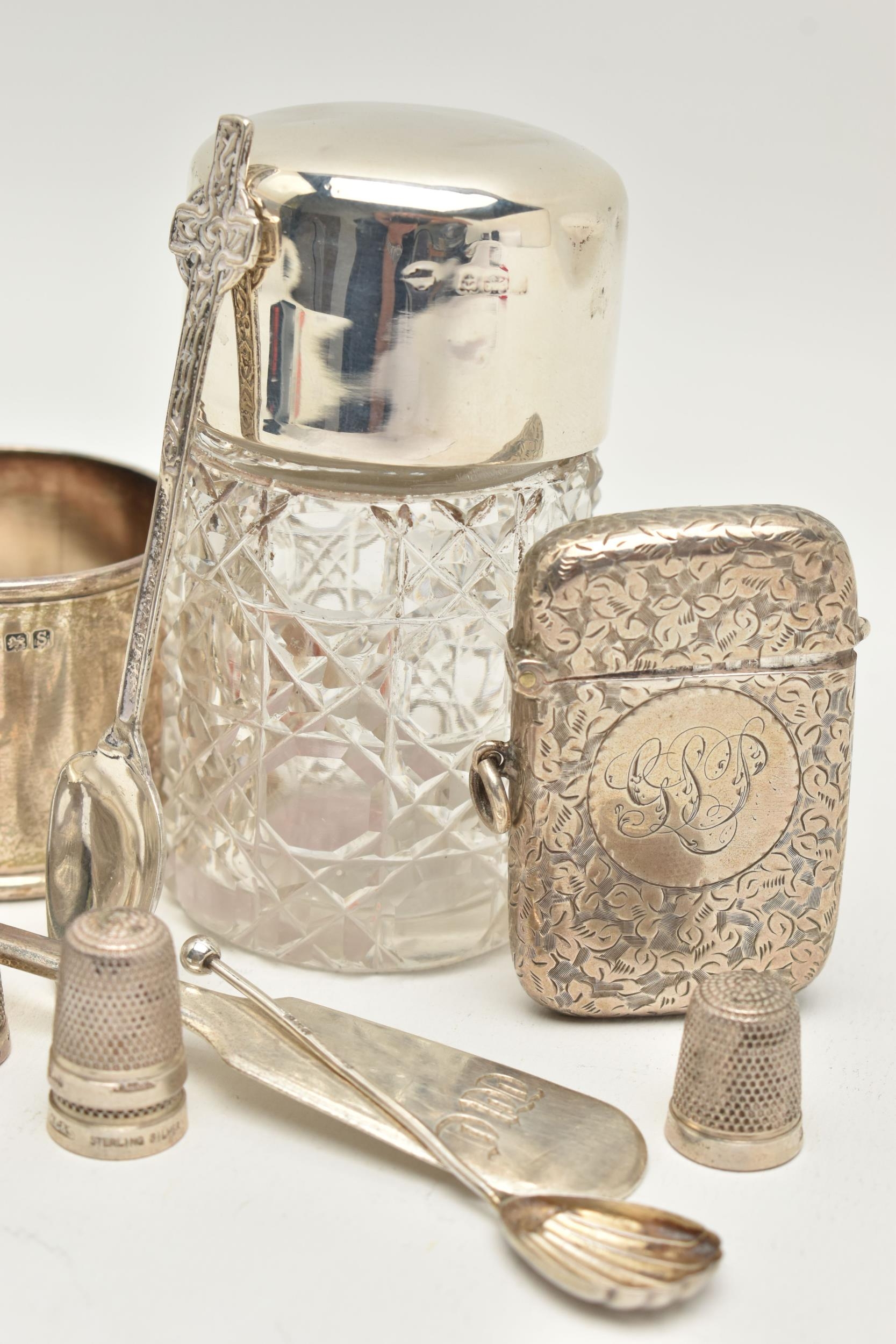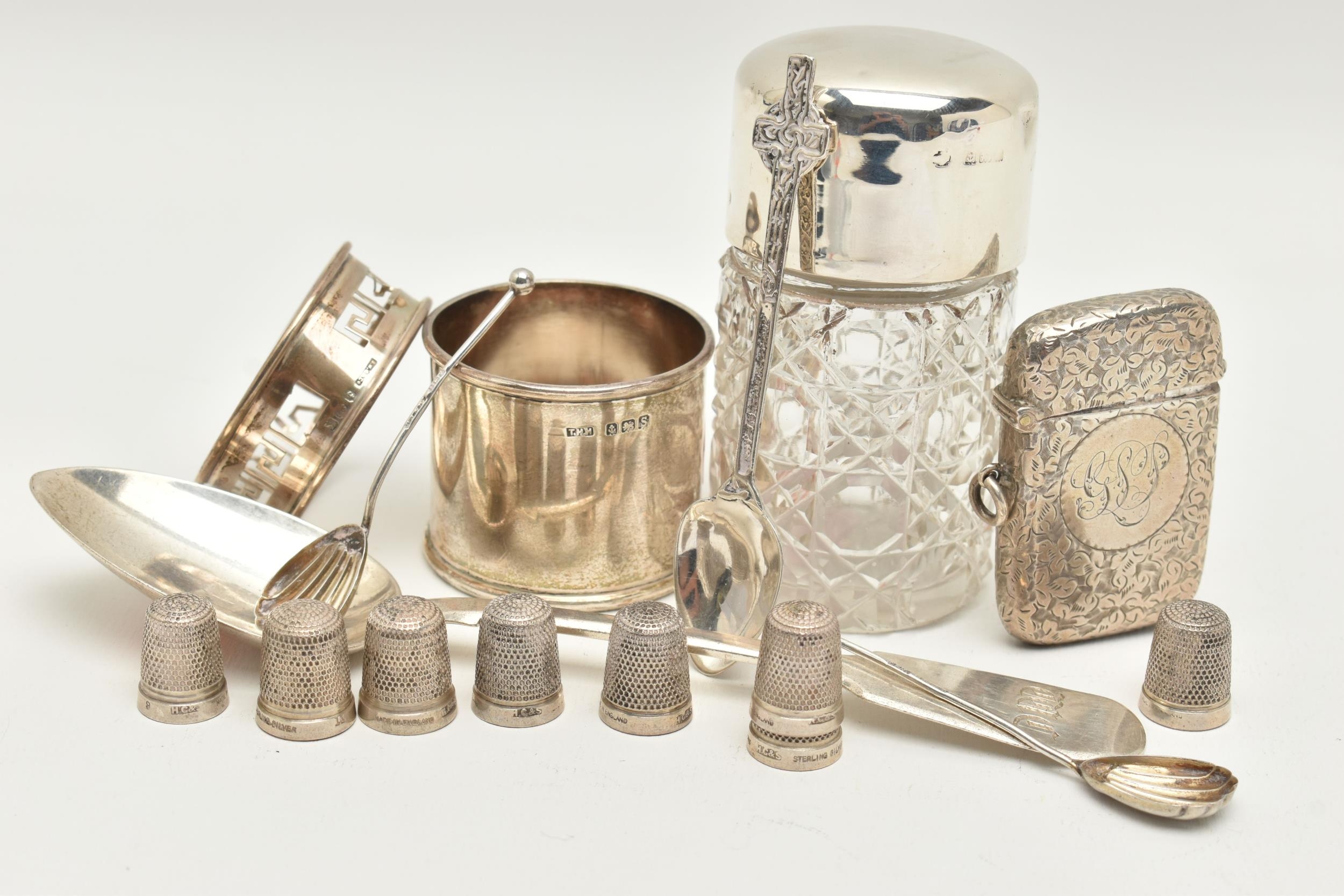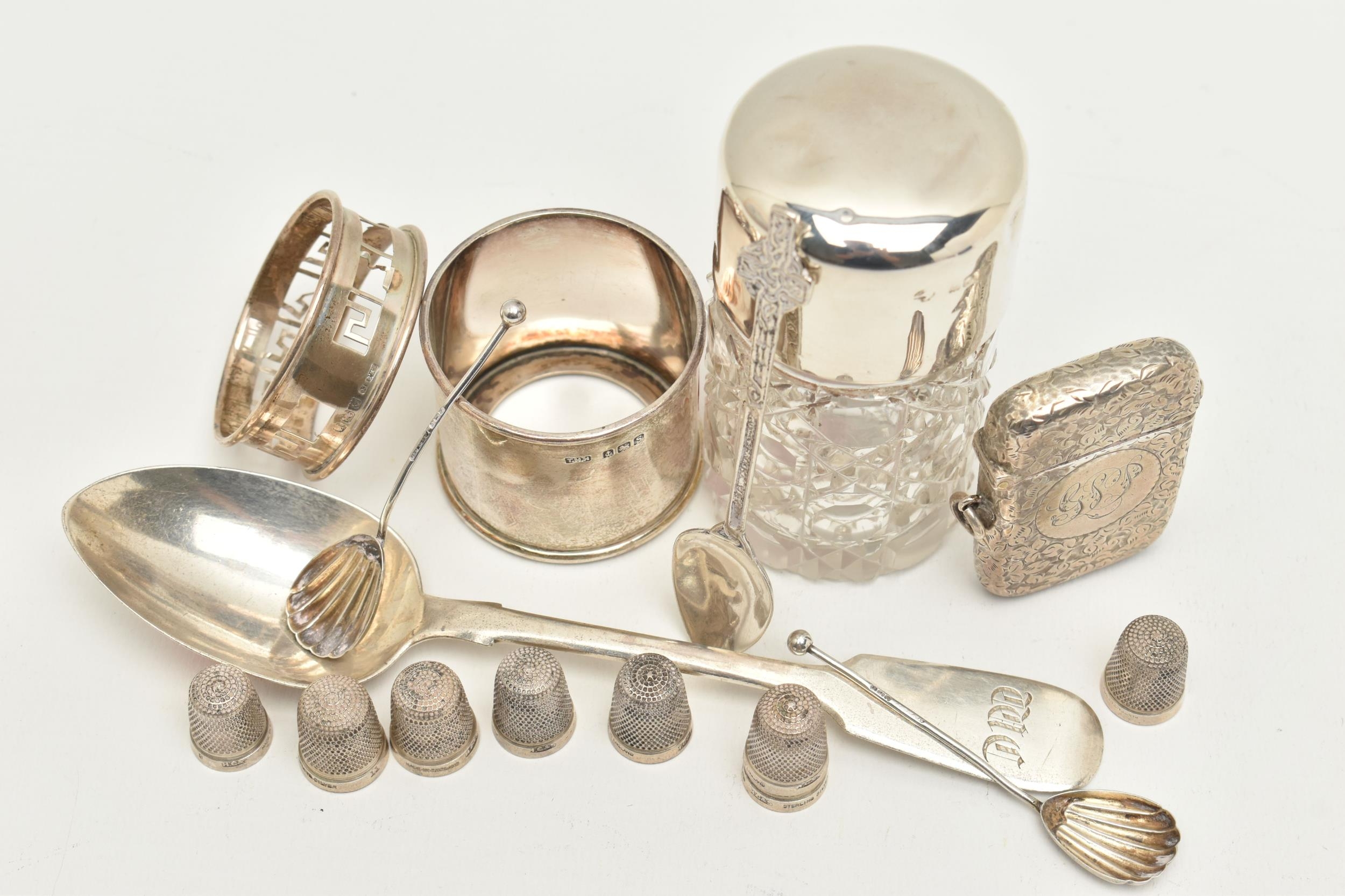 AN ASSORTMENT OF SILVER, to include a silver vesta, two silver salt spoons, a silver coffee spoon, a silver napkin ring, a silver desert spoon, a silver lidded cut glass vanity jar, a silver jar base (jar missing) all with British hallmarks, approximate gross weight 129.8 grams, 4.17 ozt, together with eight white metal thimbles, stamped sterling silver, approximate gross weight 15.7 grams, 0.50 ozt (condition report: general moderate wear, rubbing to hallmarks some indenting to items, napkin ring damaged, overall condition good)