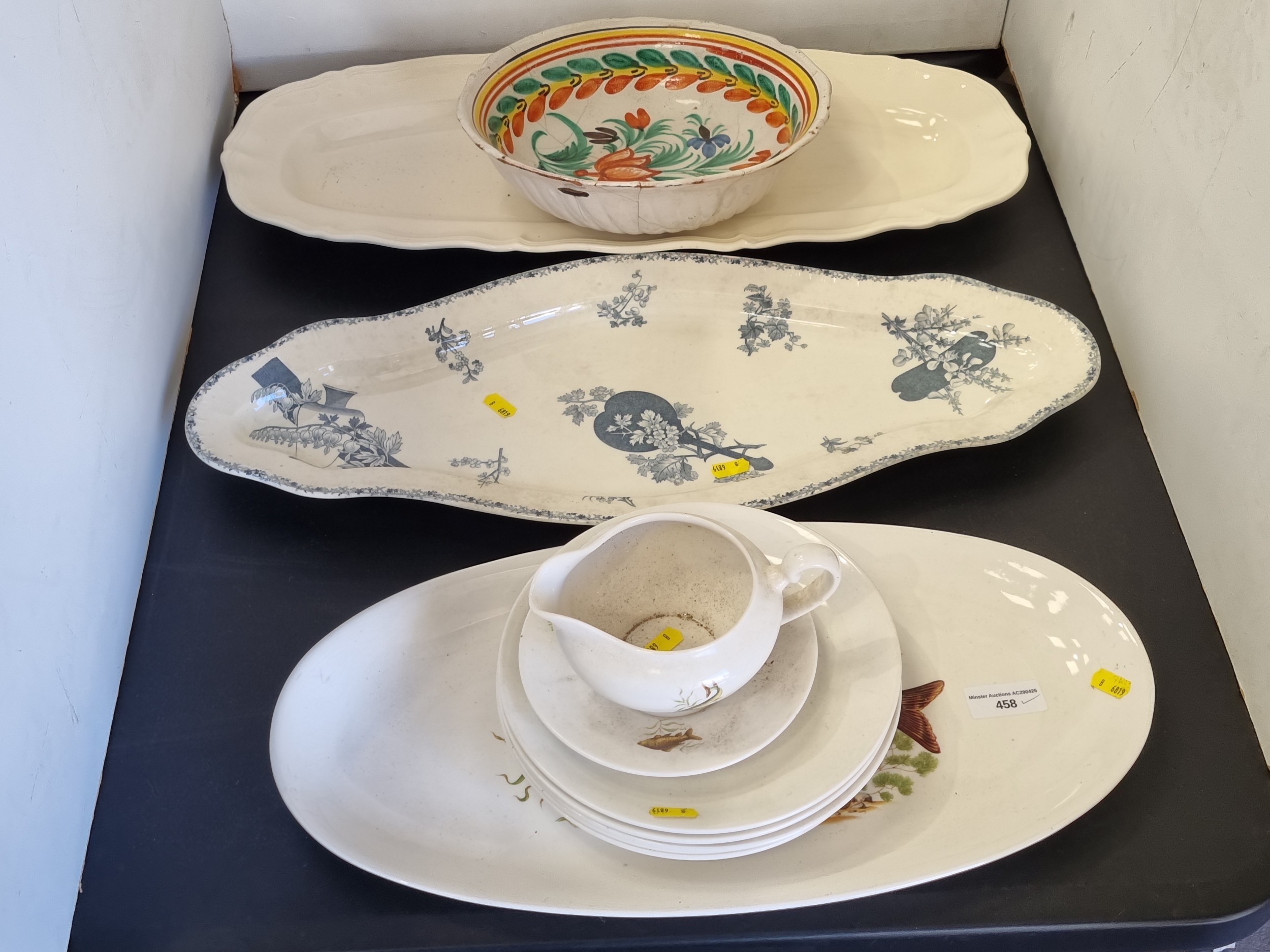 A French Regence oval Dish, a Crown Devon oval Dish decorated fish, another fish Dish, and a Continental faience type Bowl, A/F, (R5)