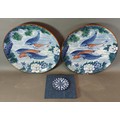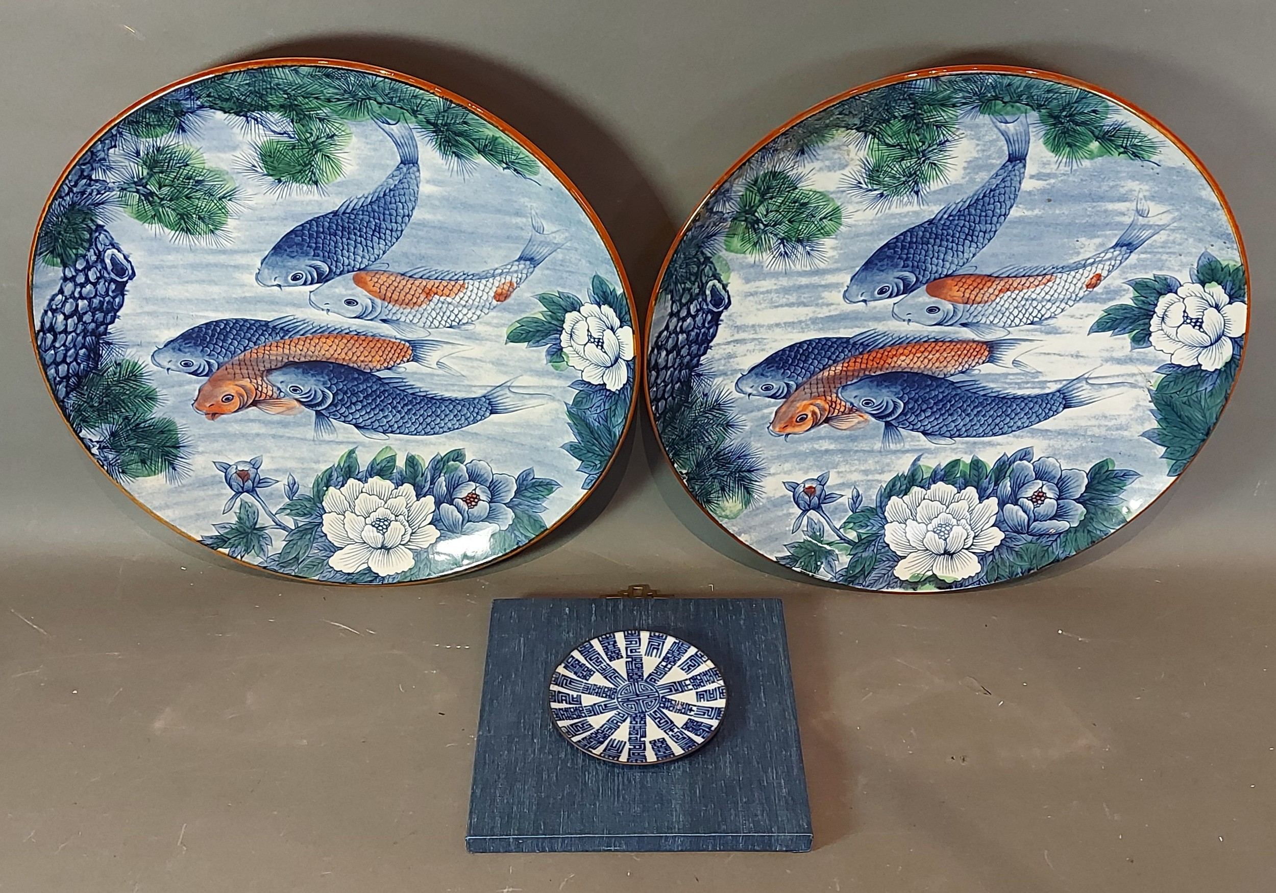 A pair of Japanese chargers decorated with Carp amongst foliage, 35cms diameter together with a small Chinese mounted dish