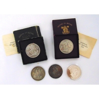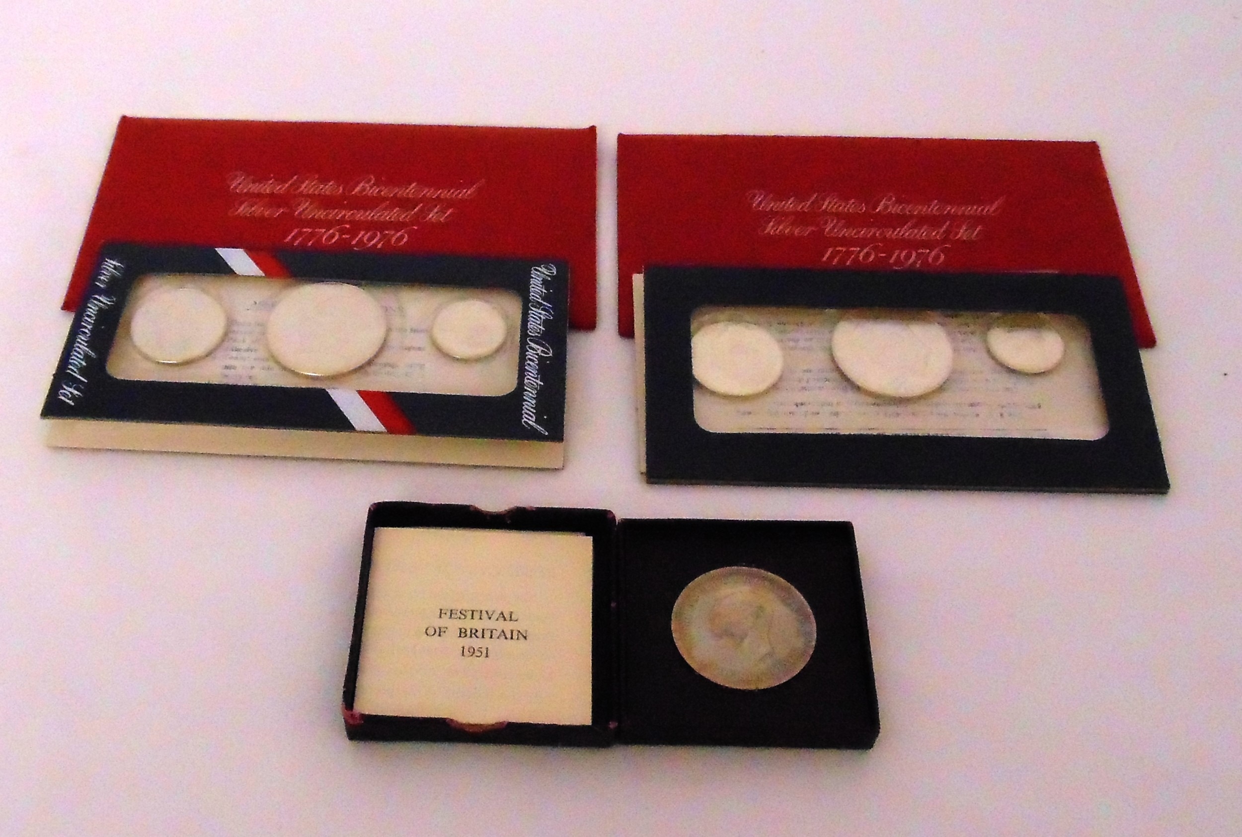 1951 Festival of Britain silver crown in original fitted case and documents and two sets of United States Bicentennial silver coins, uncirculated sets 1776-1976 with documentation