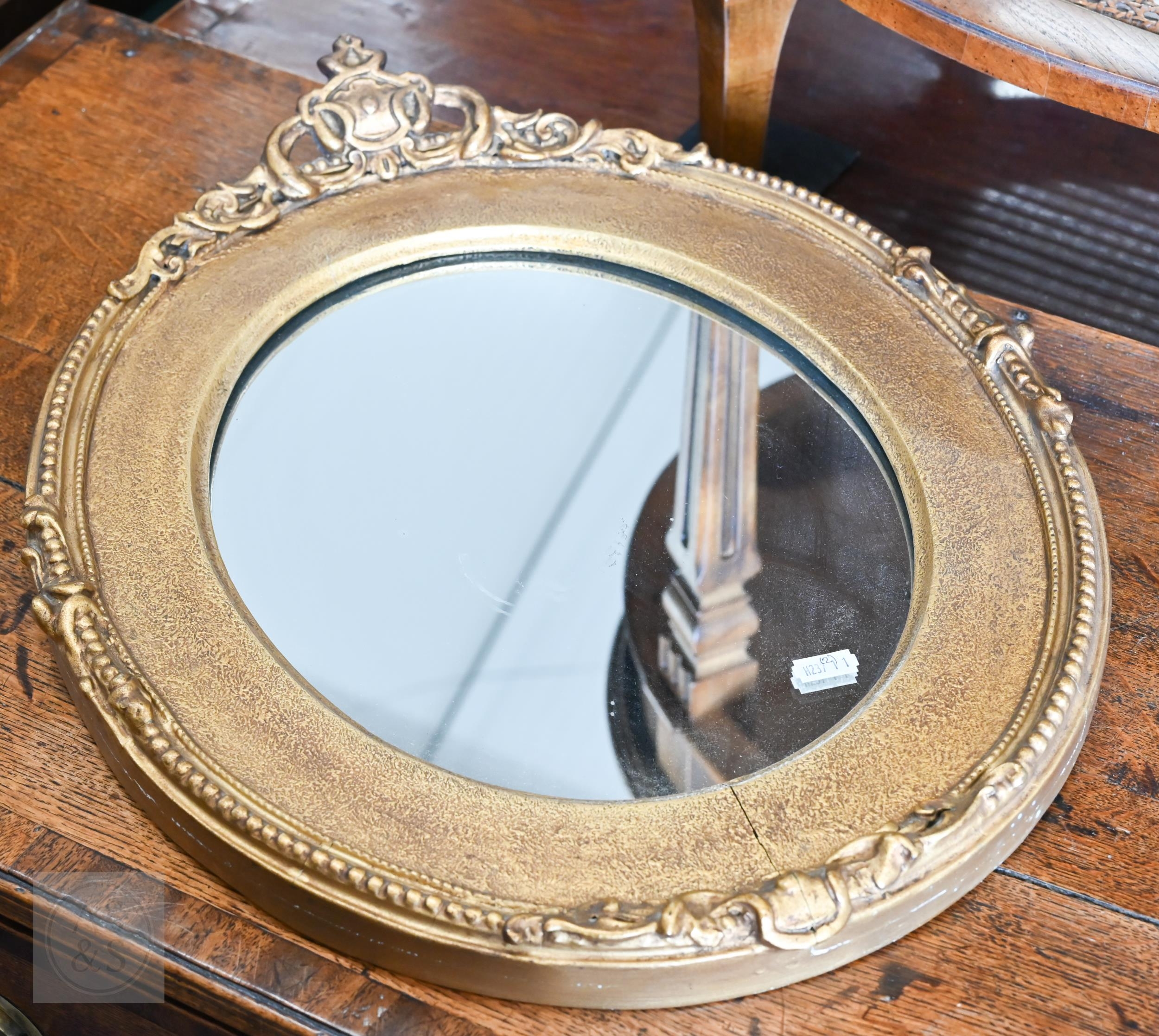 A 19th century mahogany toilet mirror on three drawer platform base to/w antique oval mirror in gilt gesso frame, 50 x 40 cm (2)