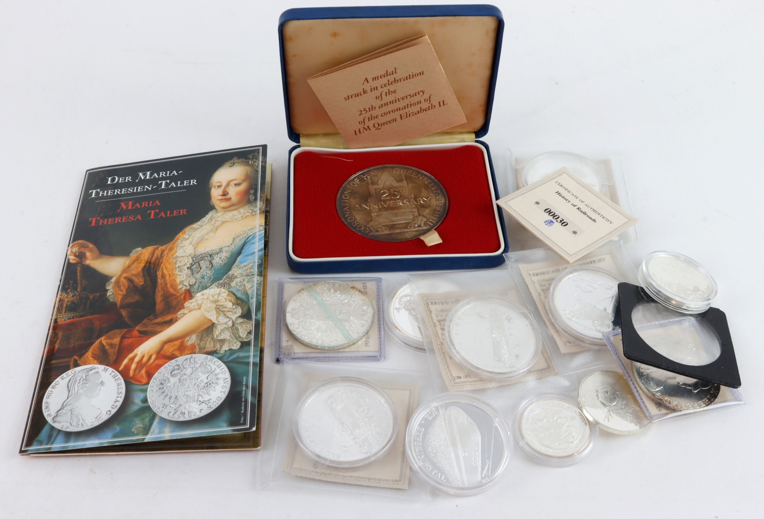 World Silver Medals (10 and 3x Maria Theresa restrikes) noted Royal Mint QEII Jubilee 1977 medal EF cased with cert. Total actual silver weight= 9.6 troy oz.