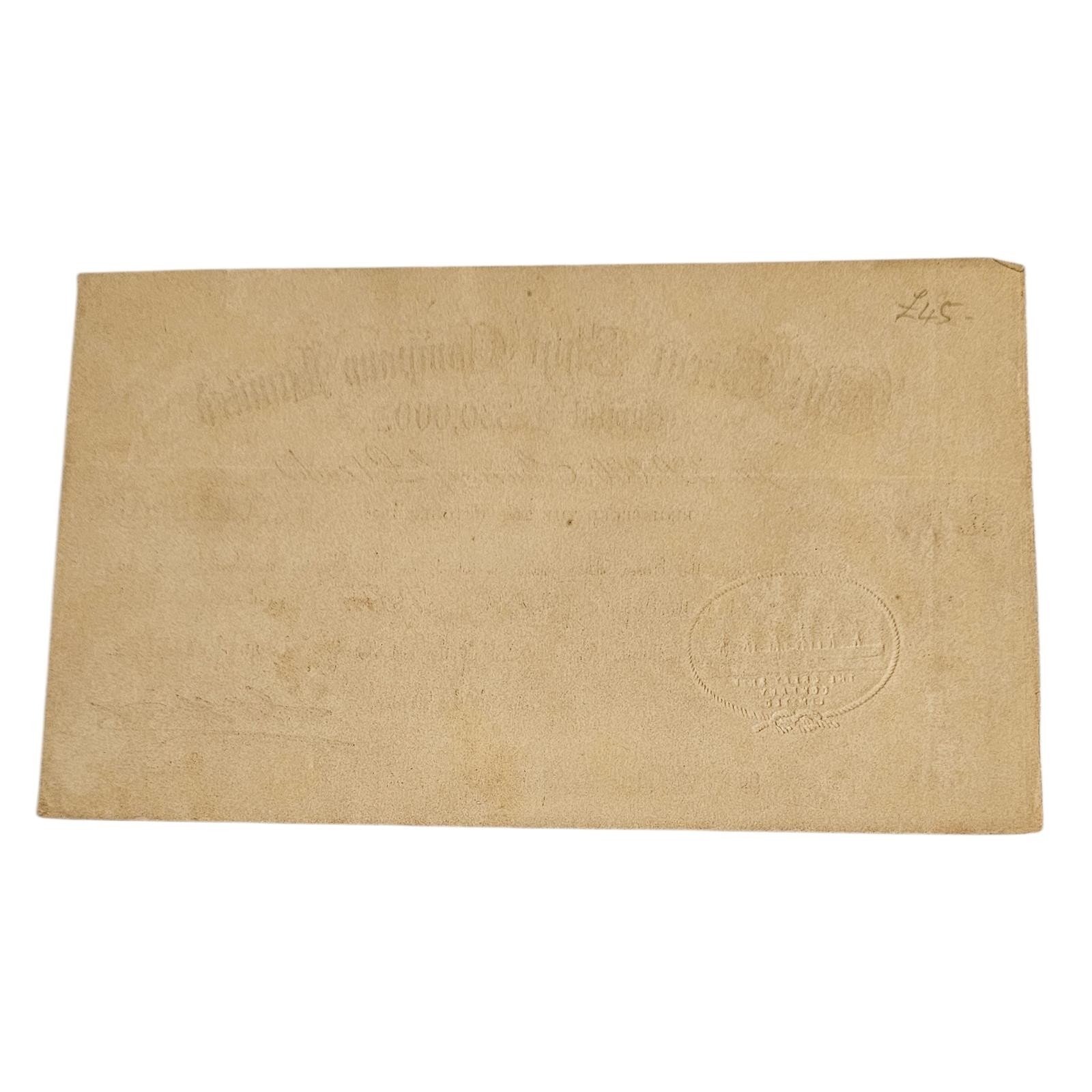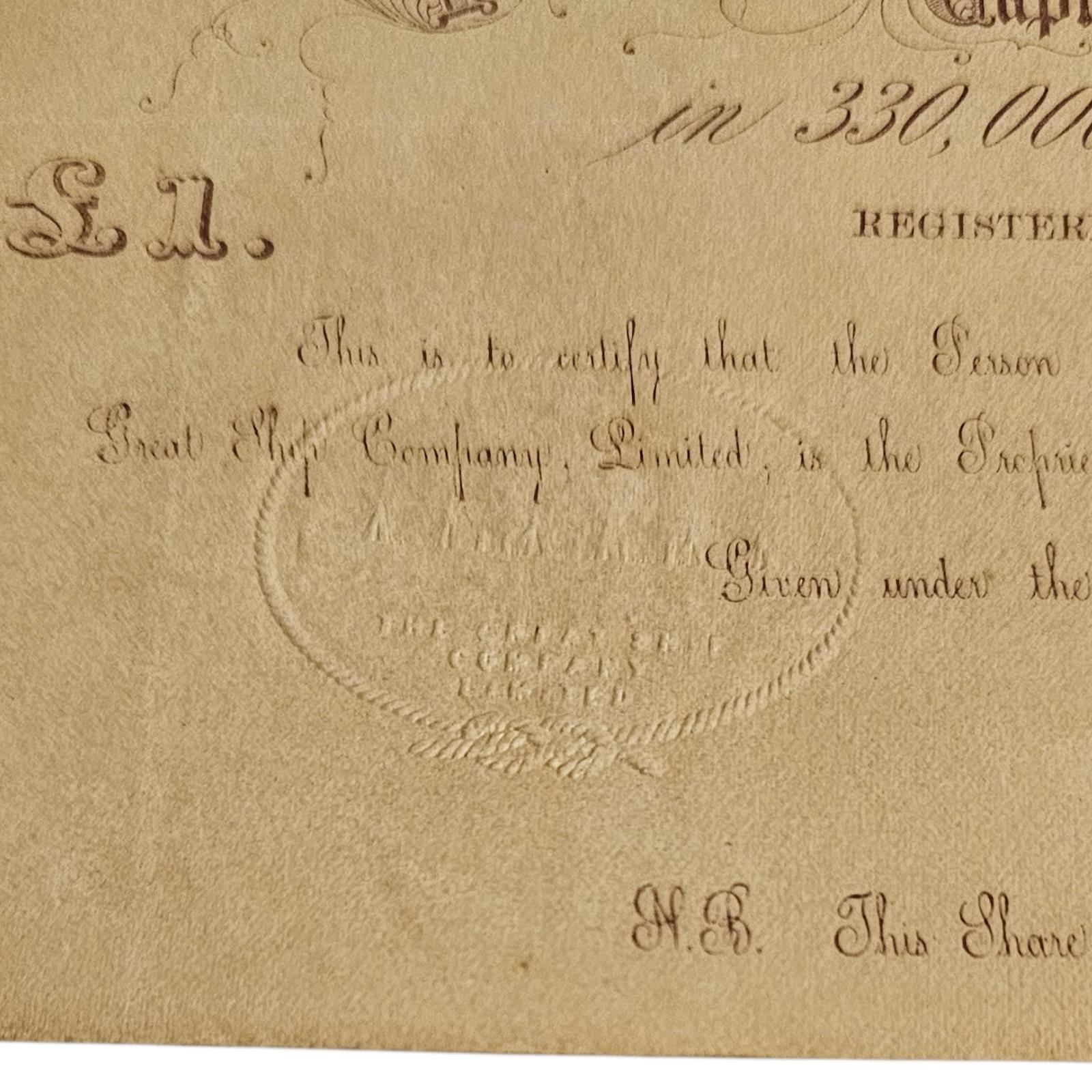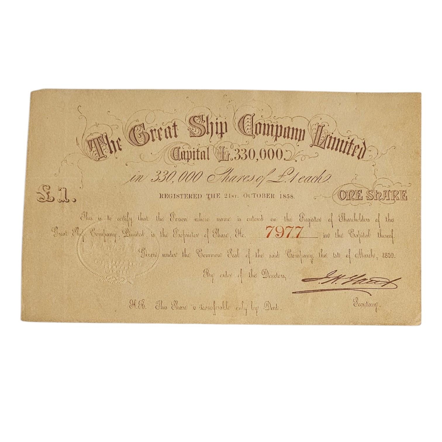 An original Victorian share certificate for the SS Great Eastern, dated 1st March 1859. Representing one share of £1, this document features a fine embossed oval company seal depicting Isambard Kingdom Brunel’s iron-hulled ‘Great Babe’, issued by the successor company formed to complete the vessel's.