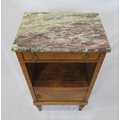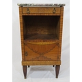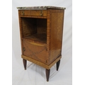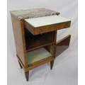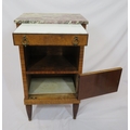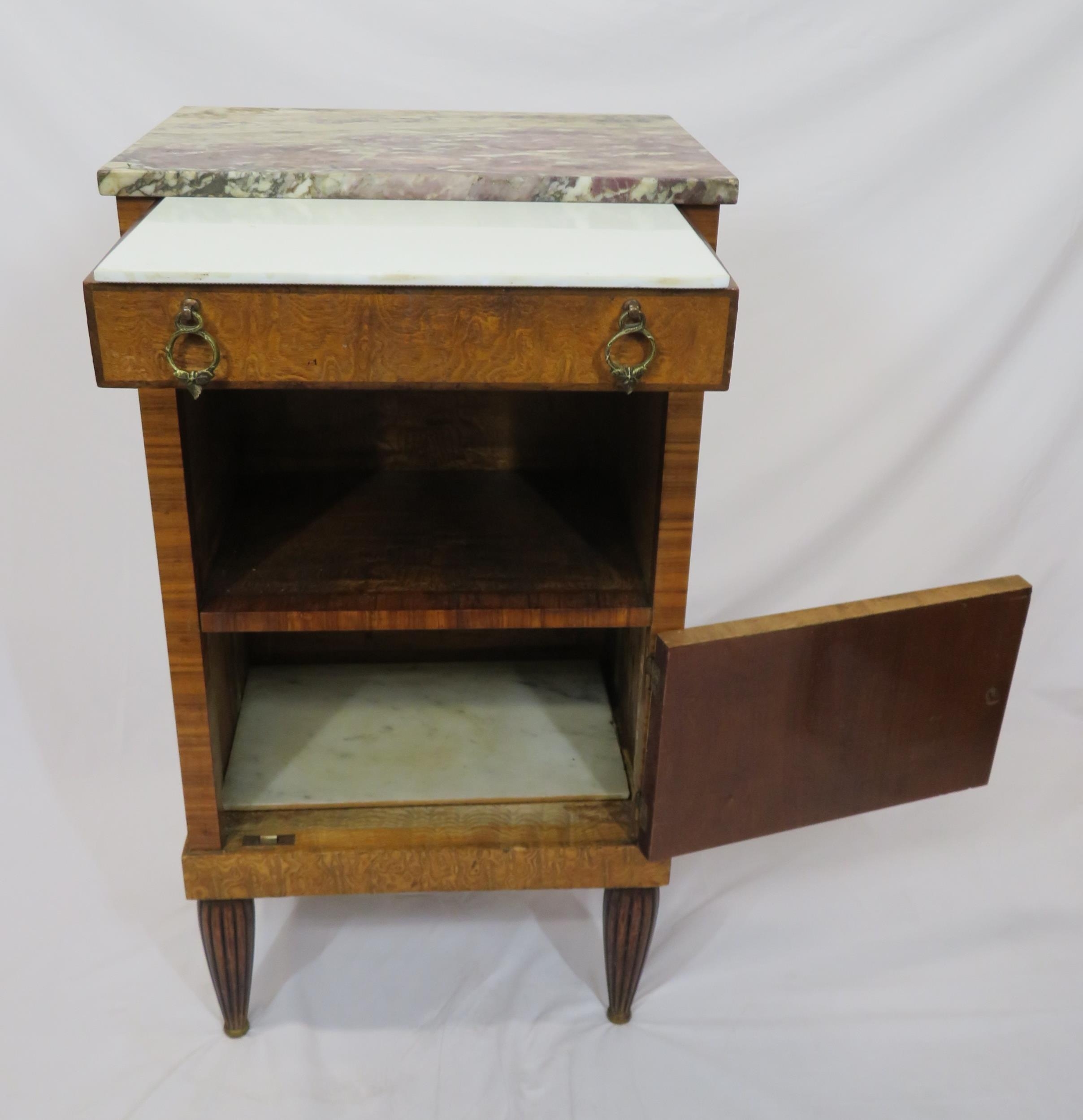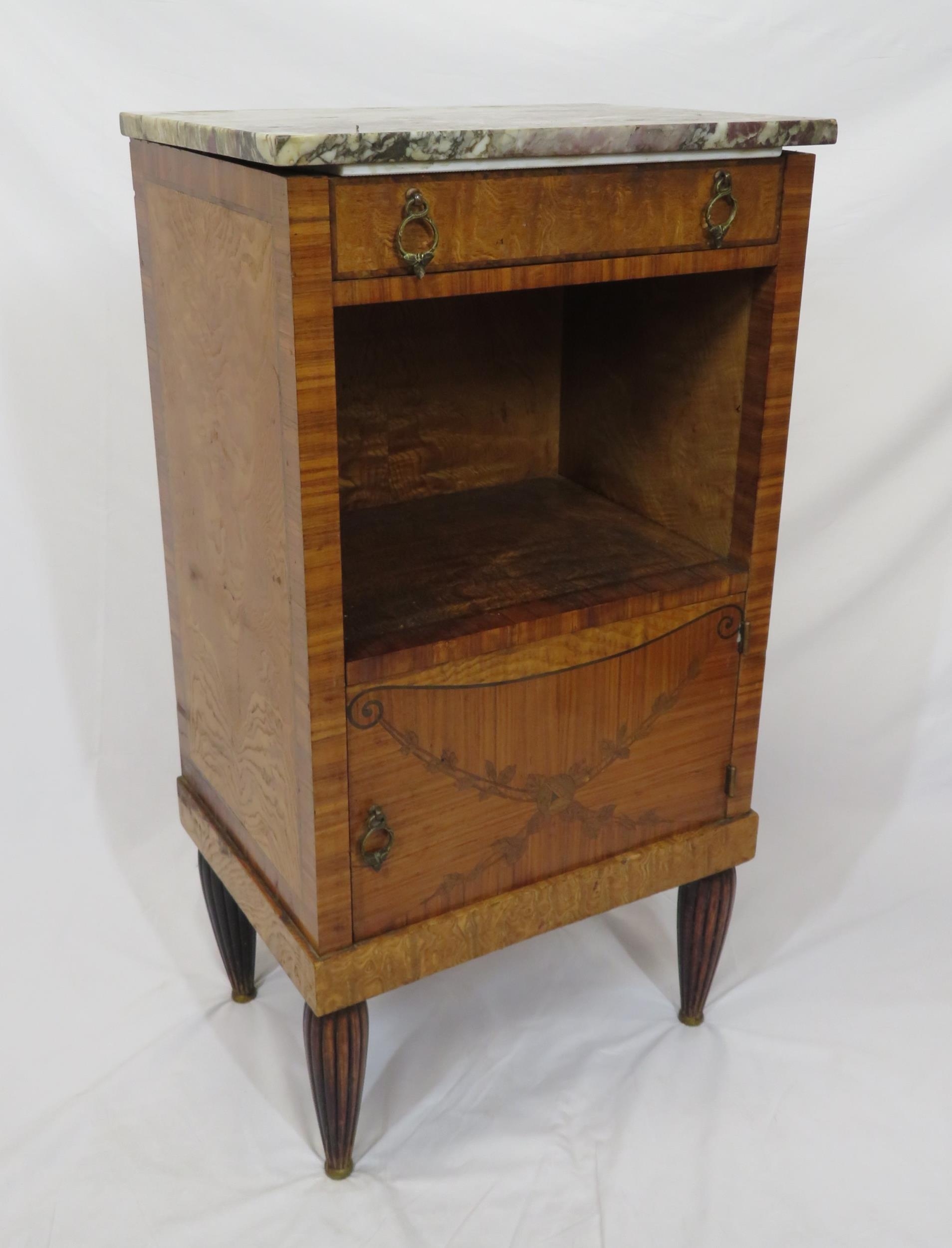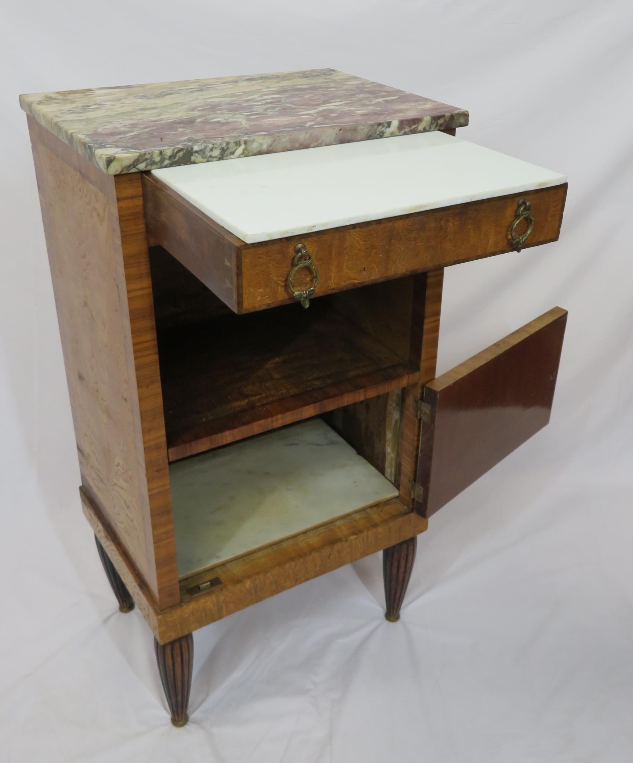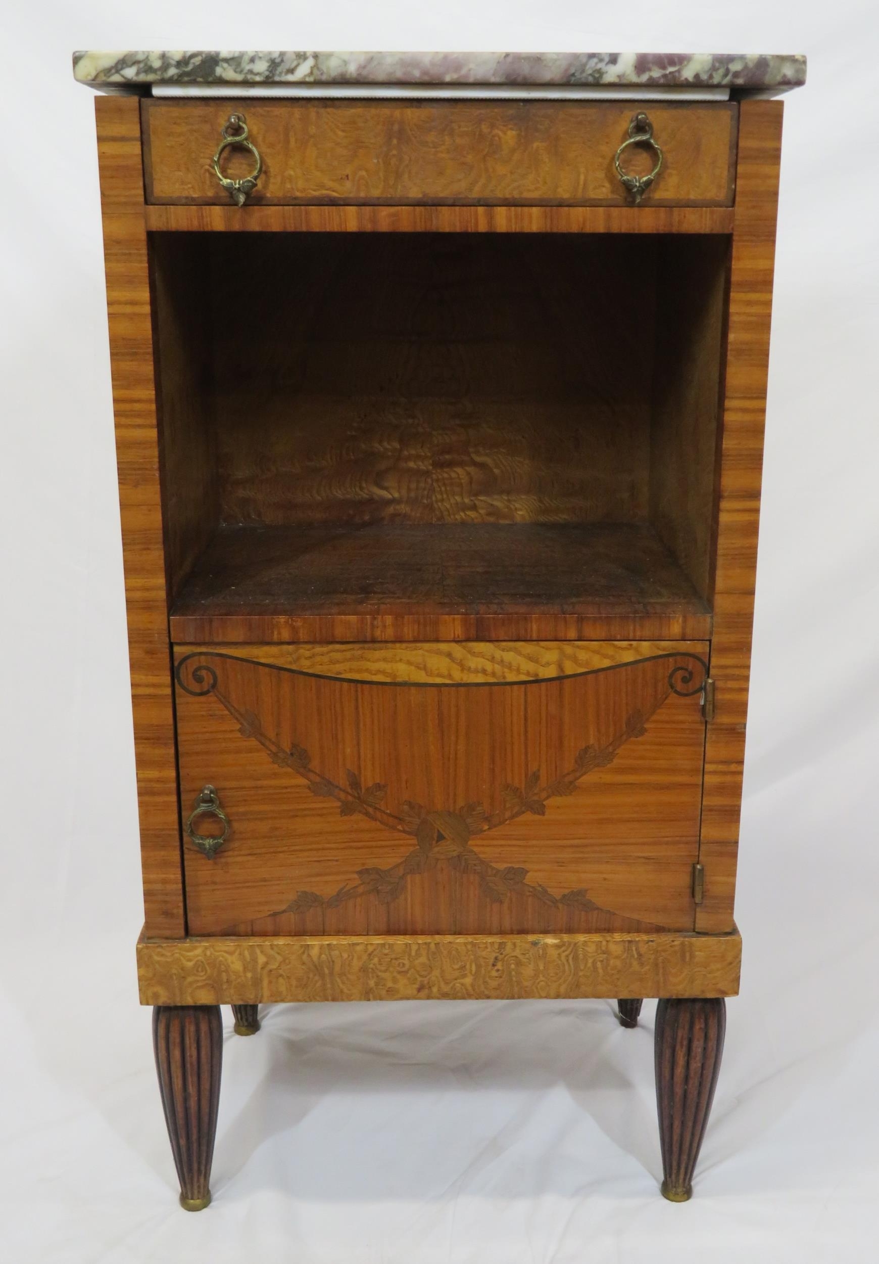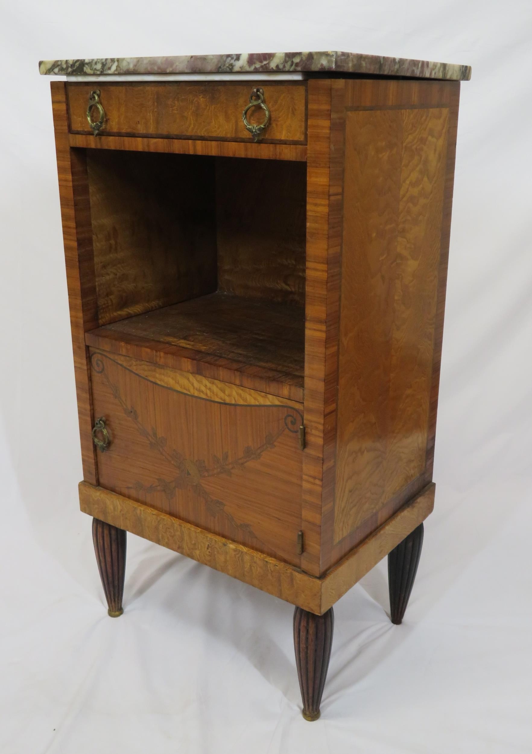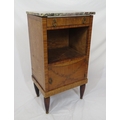 Victorian walnut and rosewood locker with marble top, frieze drawer, press under, ornate brass drop handles, on turned tapering reeded legs