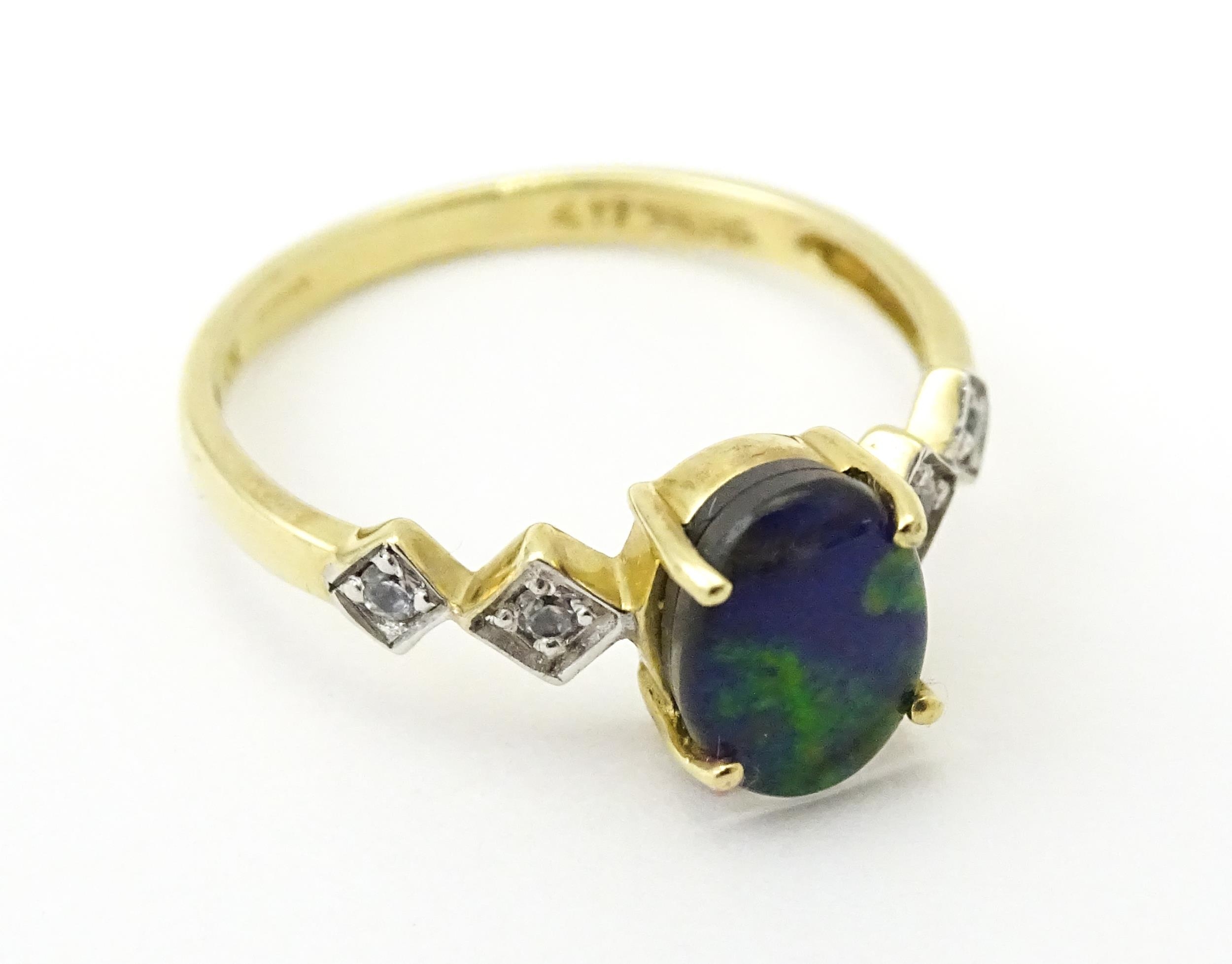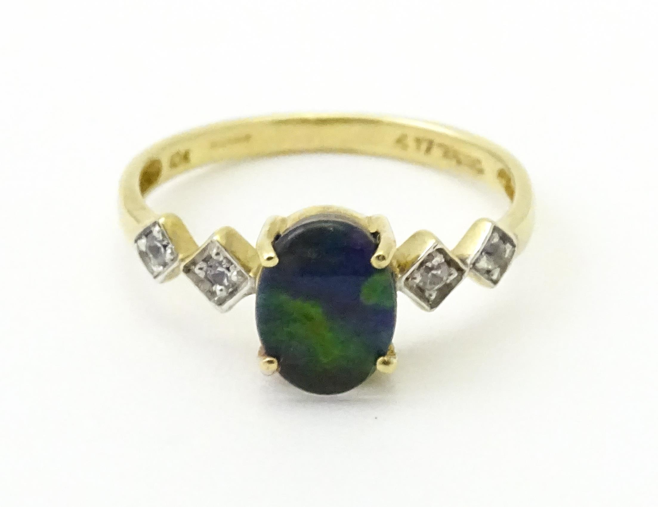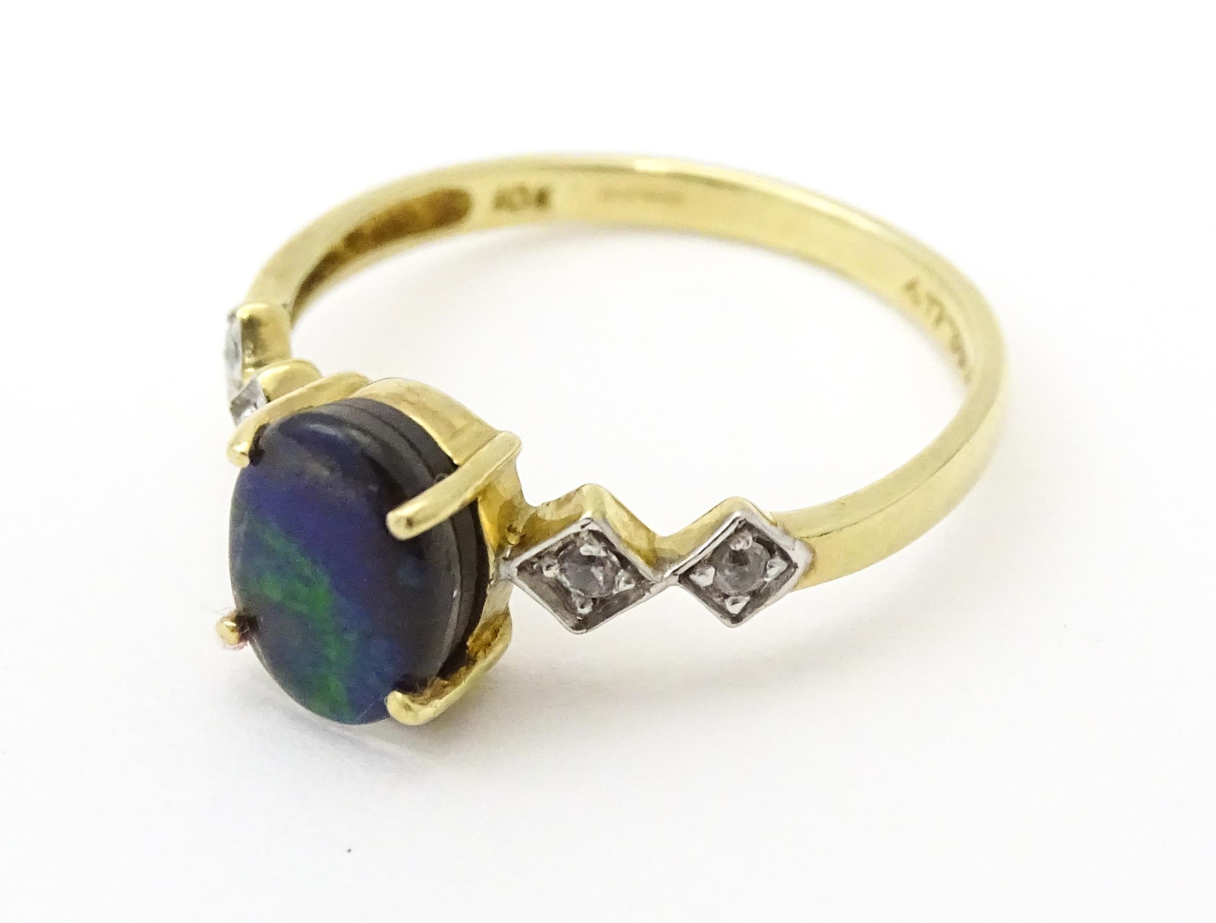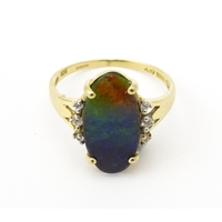 A 9ct gold ring set with central ammolite flanked by white stones. Ring size approx. L