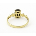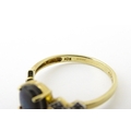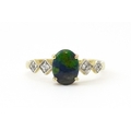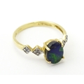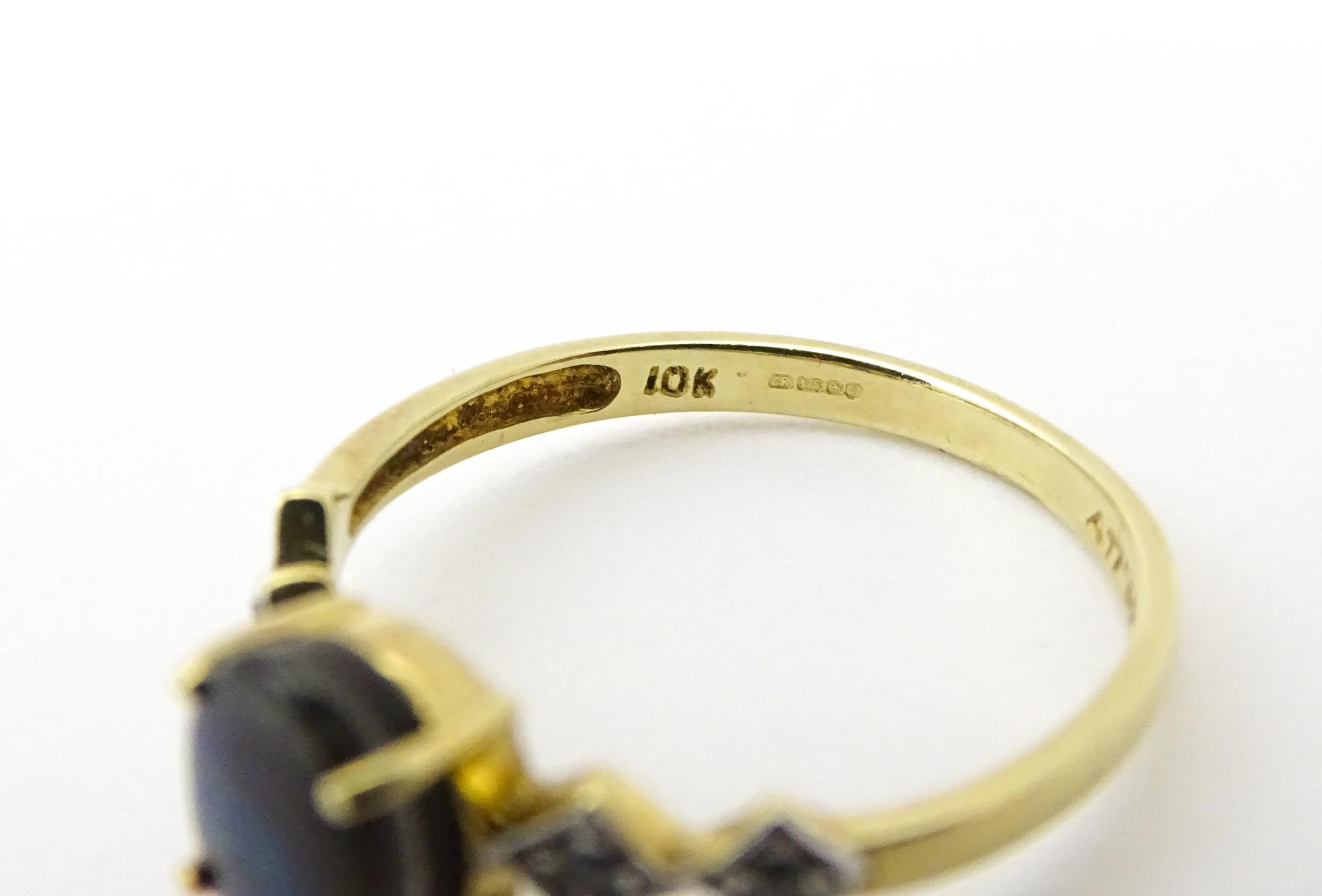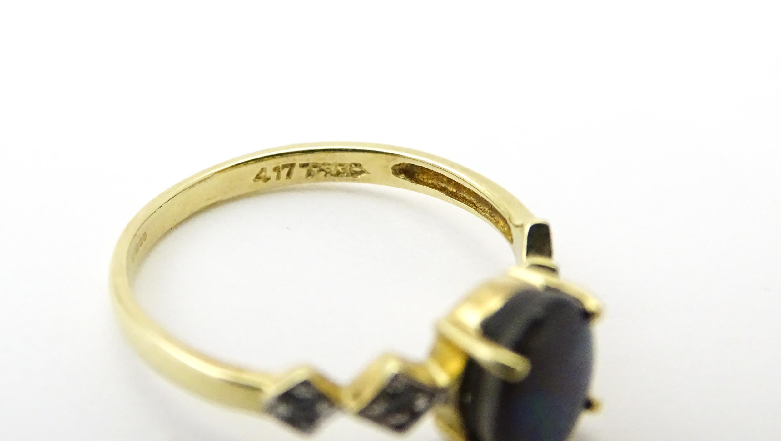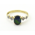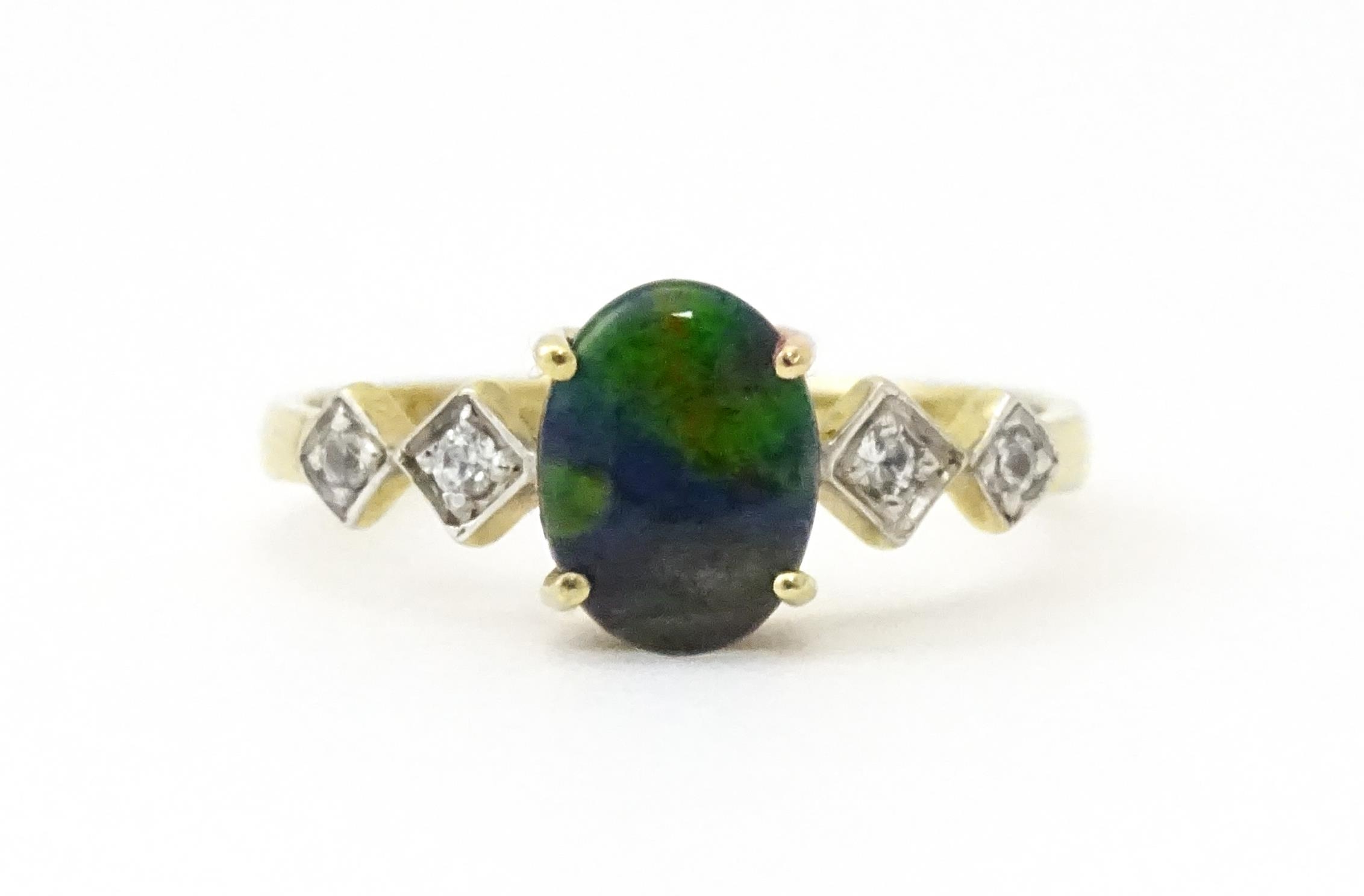 A 9ct gold ring set with central ammolite flanked by white stones. Ring size approx. L