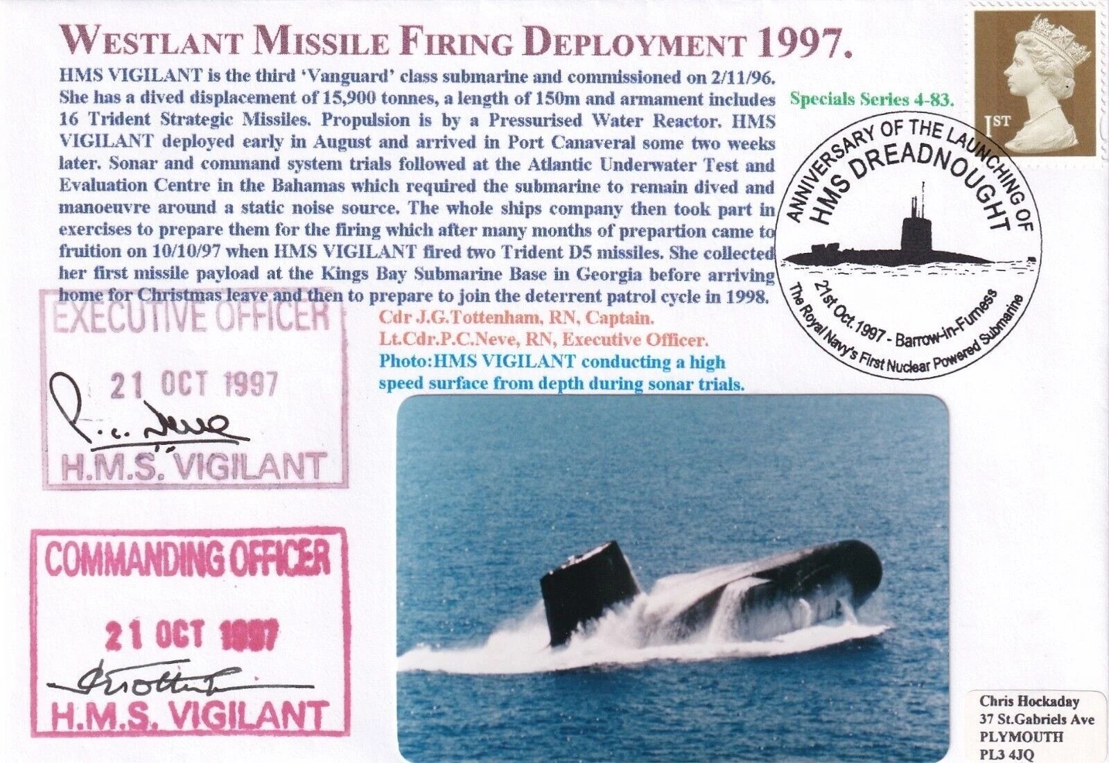 HMS Vigilant, Westlant Missile Firing Deployment 1997 Double Signed. 21st Oct 1997 Barrow in Furness Special Postmark. Westlant Missile Firing Deployment 1997. Personally Signed Cdr J G Tottenham RN. Captain and Lt Cdr P C Neve RN Executive Officer. Photo HMS Vigilant conducting a high speed device from depth during sonar trials. Special Series 4 -83. Certified Cover no 74 of 75. Single Vendor RAF cover collection. Good condition. All autographs come with a Certificate of Authenticity. We combine postage on multiple winning lots and can ship worldwide. UK postage from £5.99, EU from £7.99, Rest of World from £9.99