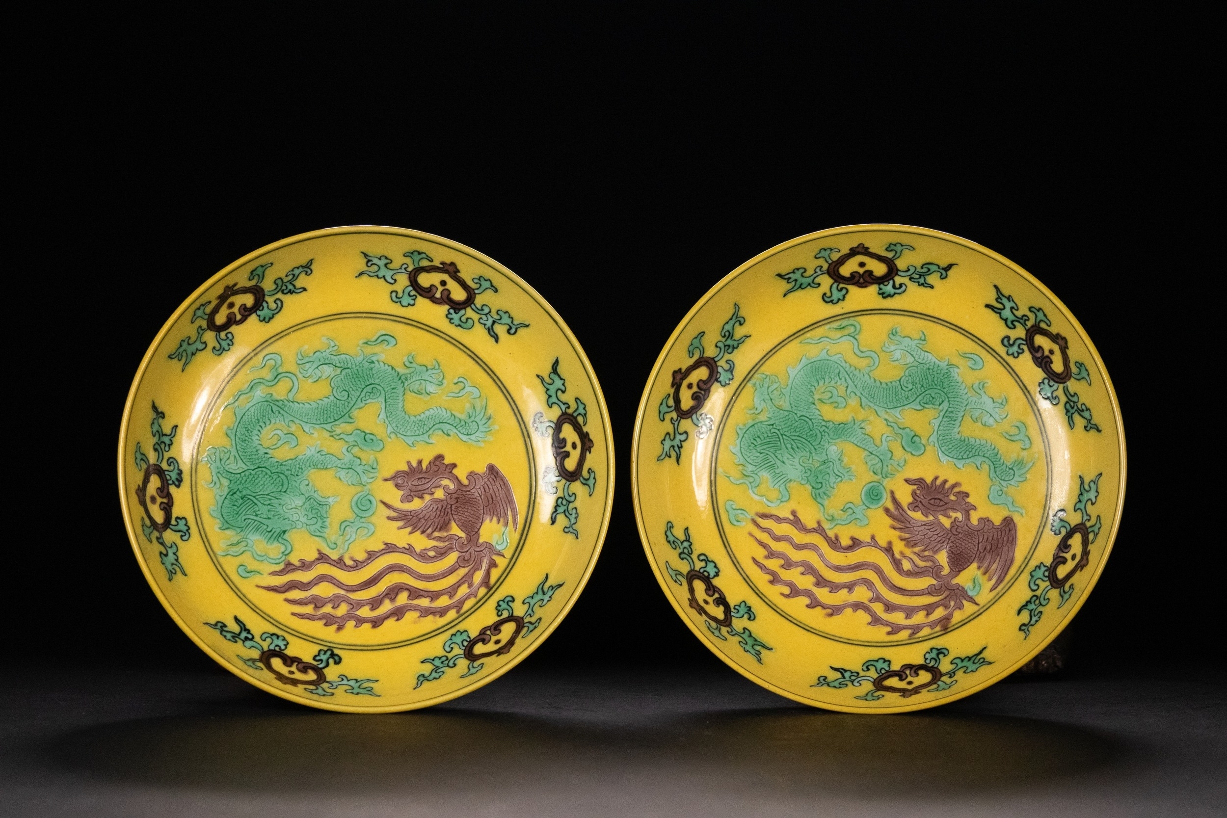 Each dish boldly enamelled in famille verte palette on a rich yellow ground, featuring a green dragon and a red phoenix amidst stylized clouds. The rim is adorned with bat and ruyi motifs in vibrant tones. The underside bears a six-character Guangxu mark in underglaze blue. Possibly of the Guangxu period (1875–1908).