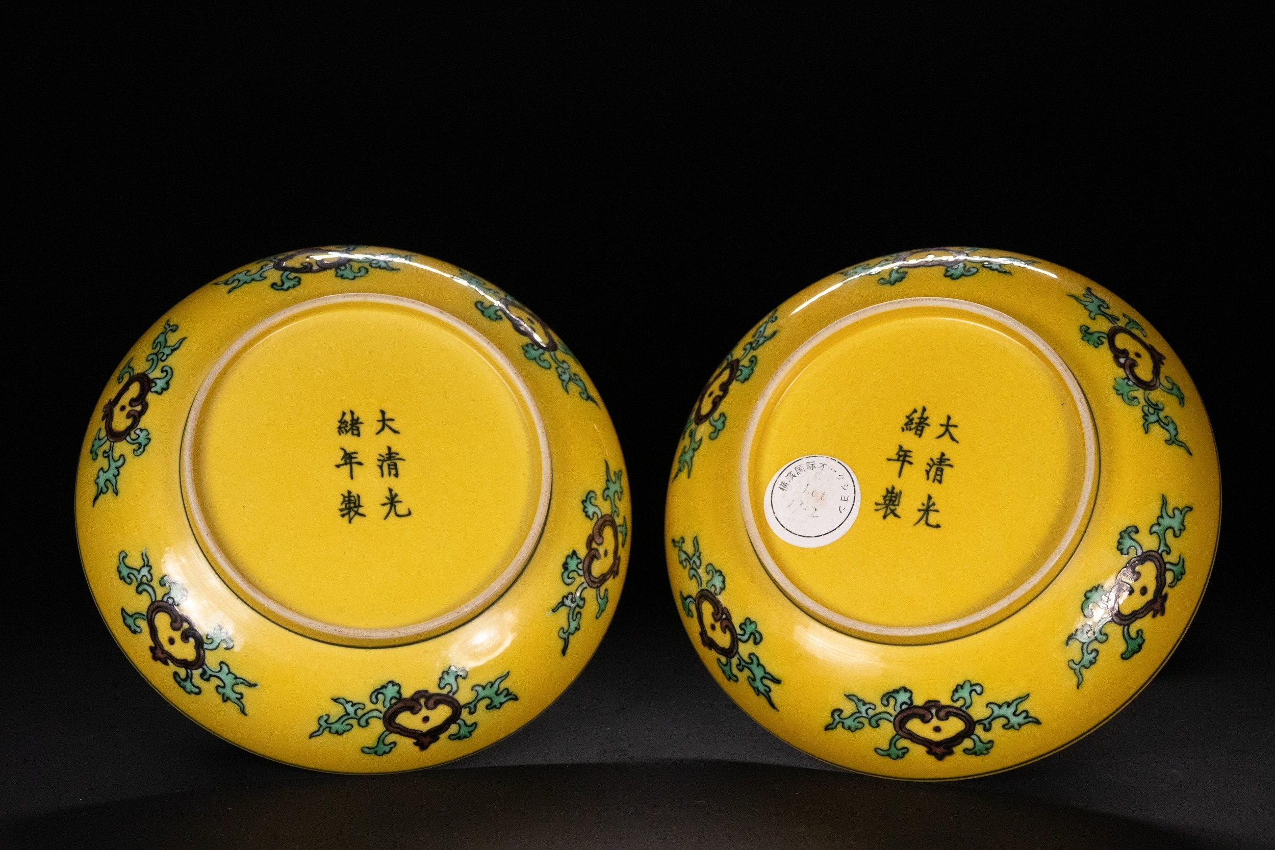 A Pair of Chinese Yellow Ground Dragon and Phoenix Dishes with Guangxu Mark to the Base.