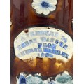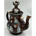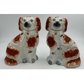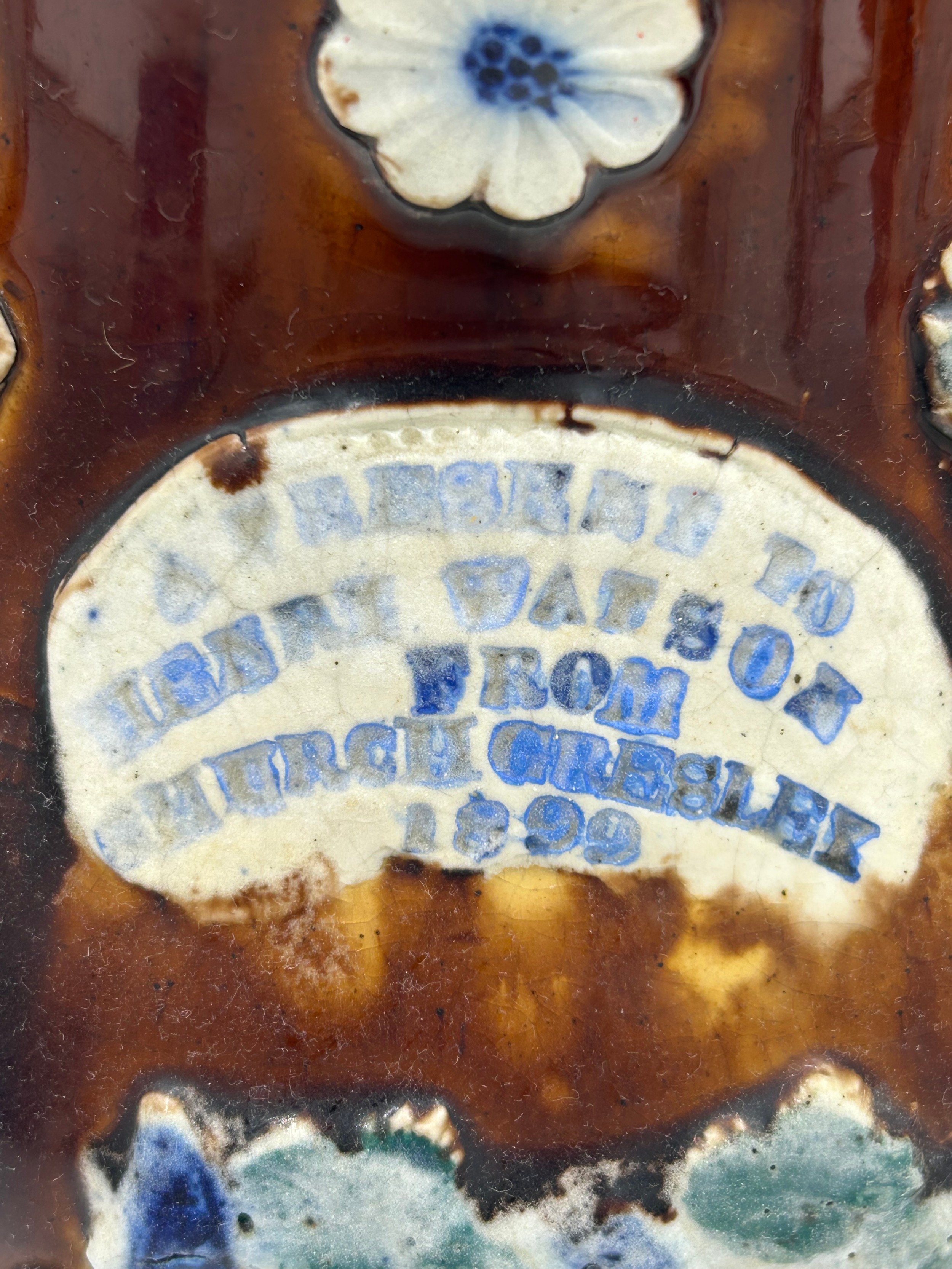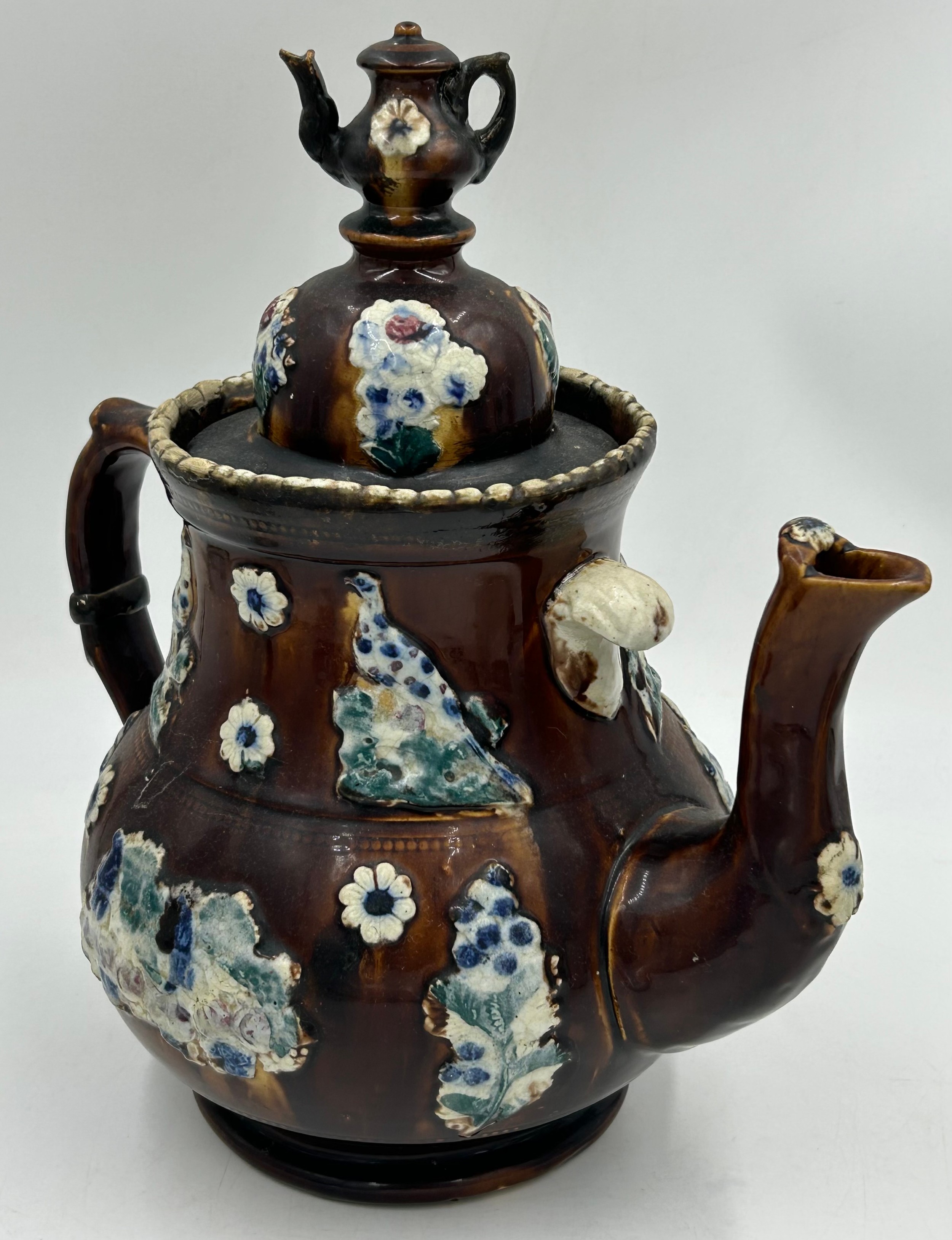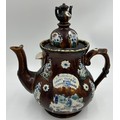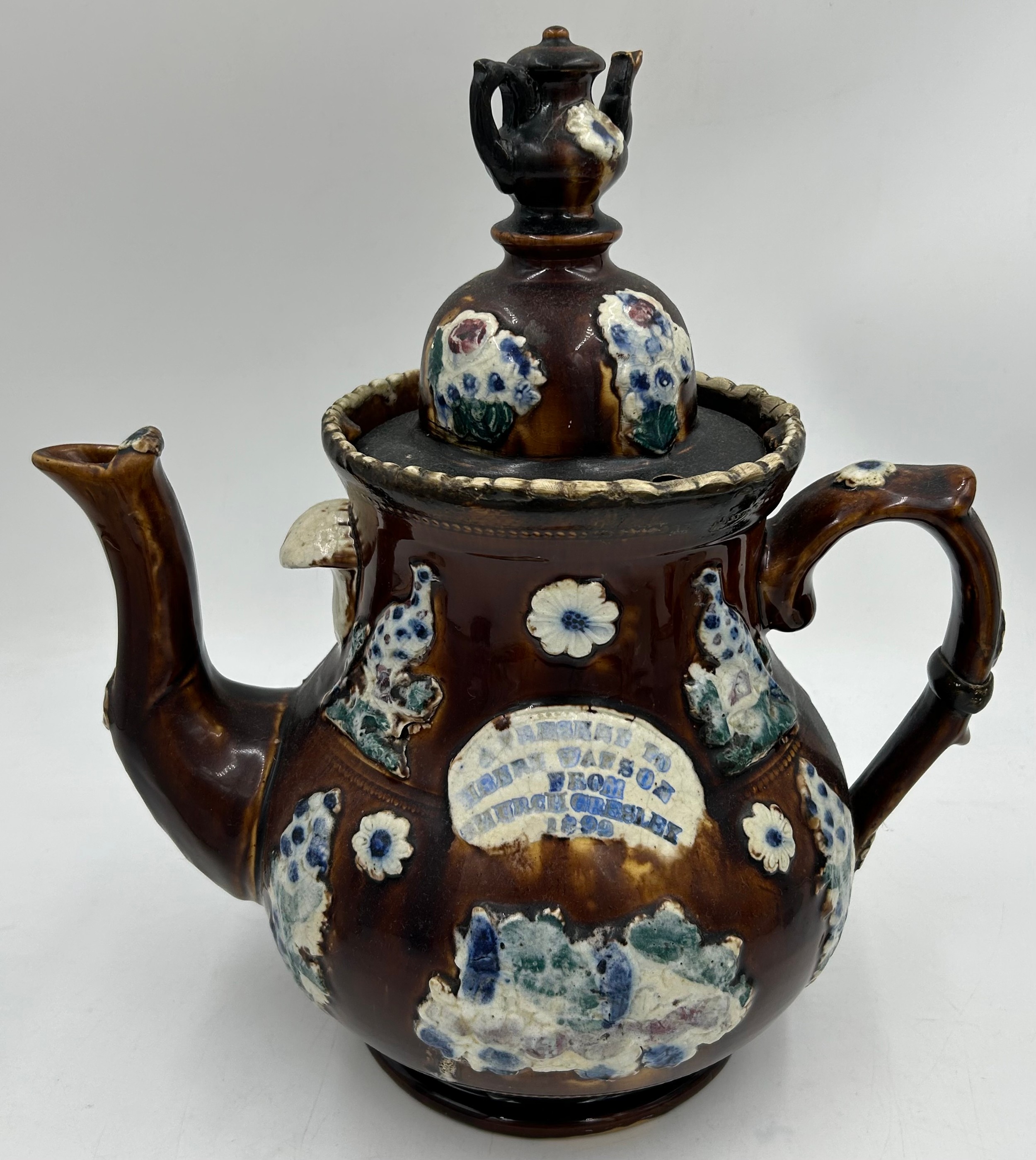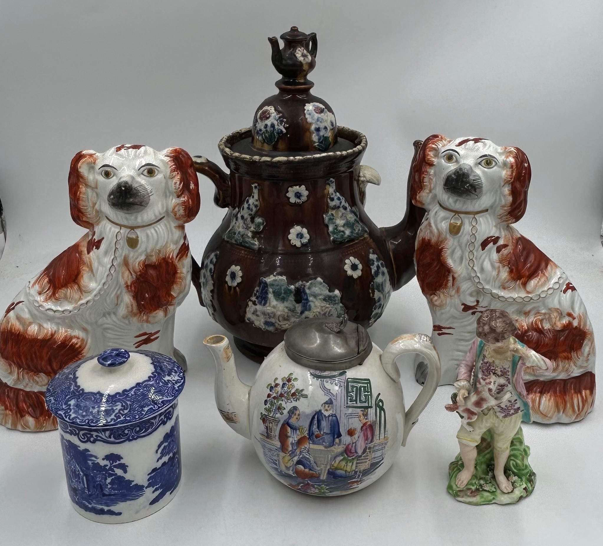 A collection of 19thC English ceramics to include a large Measham bargeware teapot decorated with flowers and birds, in relief 'A present to Henry Watson from Church Gresley 1899', together with a pair of brown and white Staffordshire Spaniels, a lidded jam pot by G. Jones & Sons, etc. (6).