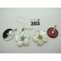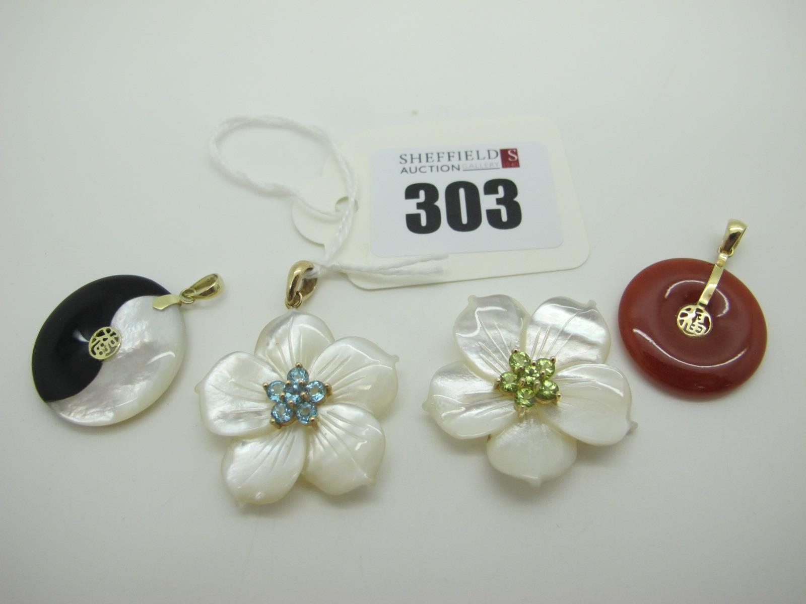 A Modern QVC 9ct Gold Shell Flowerhead Pendant, with claw set highlights; together with another similar (lacking bail); two modern Chinese pendants (one stamped "585").