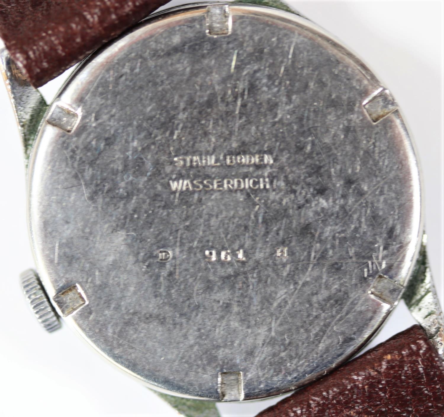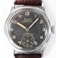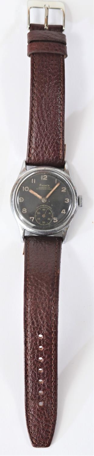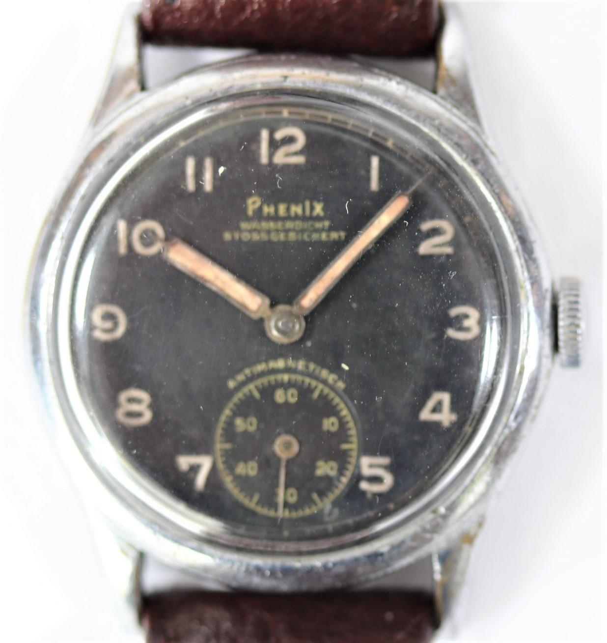 DH marked Phenix wristwatch. Serial D 961 H. Bright plated case, some wear to plating, 33mm without crown. Fixed bars. Screw caseback marked CB internally. Black dial in good condition, signed Phenix, wasserdicht, stossgesichert, no luminous material on numerals, hands appear original. Unsigned AS 1130 movement, running condition. Movement retaining ring present. VGC