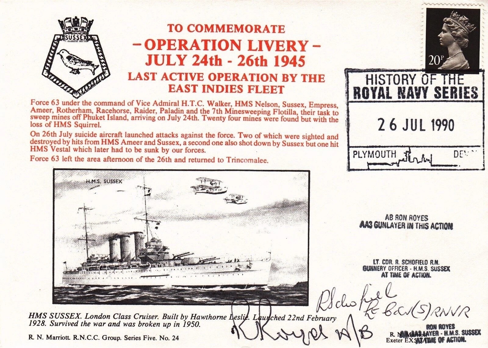 5RNCC24e Operation Livery last active operation by East Indies Fleet Signed 2. 26 Jul 90 Plymouth To commemorate Operation Livery last active operation by the East Indies Fleet. Personally Signed by AB Ron Royes, AA3 Gunlayer in this action and Dave Frith aboard HMS Express Operation Livery at time of action also Signed Lt Cdr R Schofield RN Gunnery Officer HMS Susses at time of action. Certified Copy No 38 of 52 . Single Vendor RAF cover collection. Good condition. All autographs come with a Certificate of Authenticity. We combine postage on multiple winning lots and can ship worldwide. UK postage from £5.99, EU from £7.99, Rest of World from £9.99
