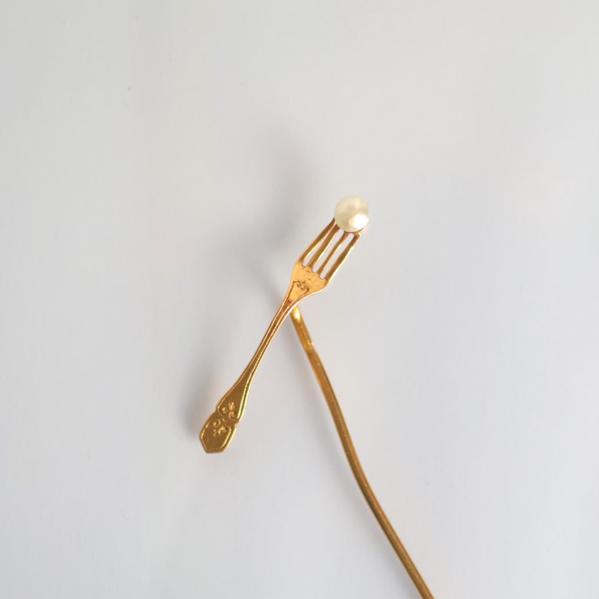 A French novelty stick pin, the terminal modelled as a fork with seed pearl ‘morsel’ stamped with eagles head, 8.5cm long, 1.6gms
