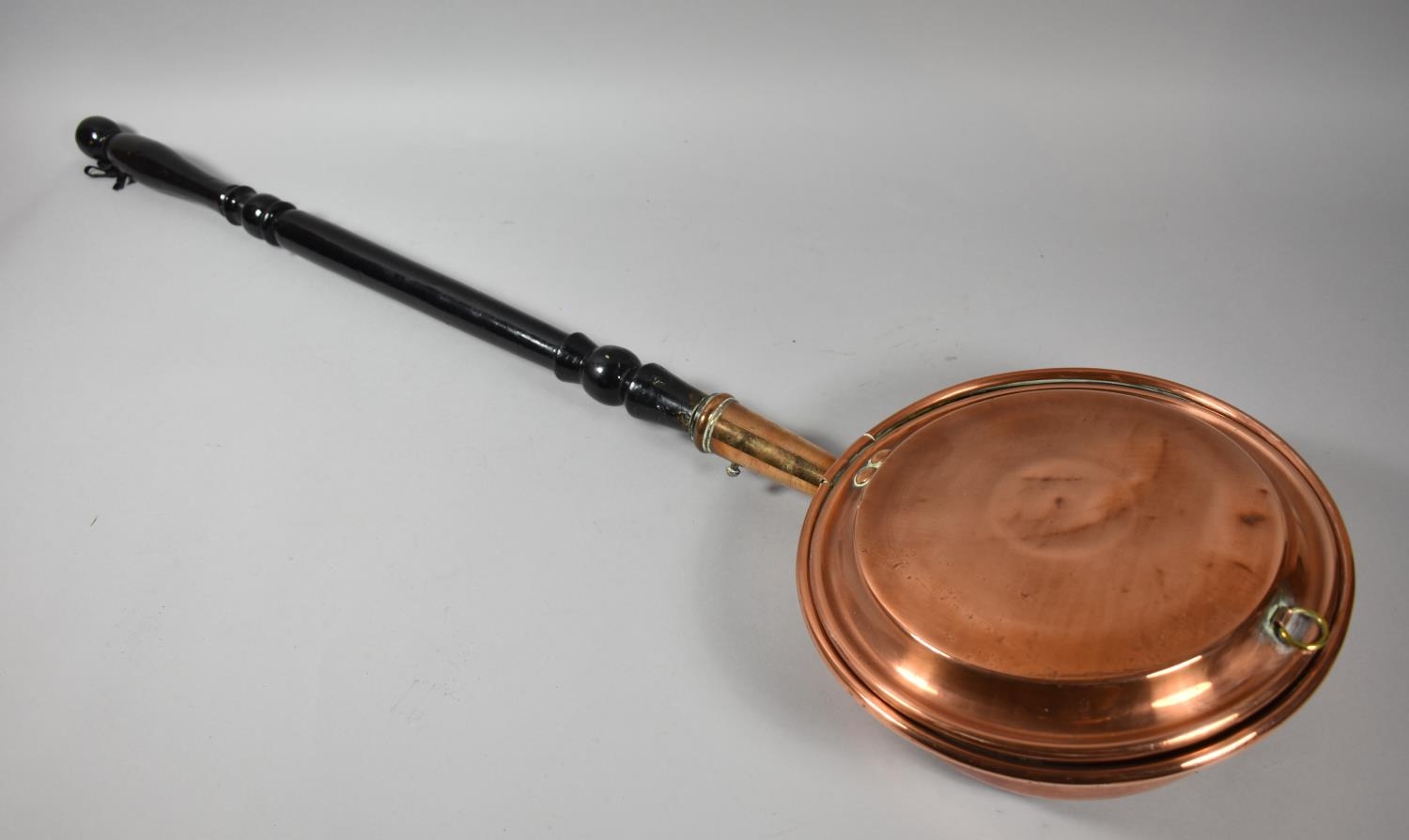 A Copper Bed Warming Pan with Turned Ebonised Handle
