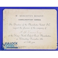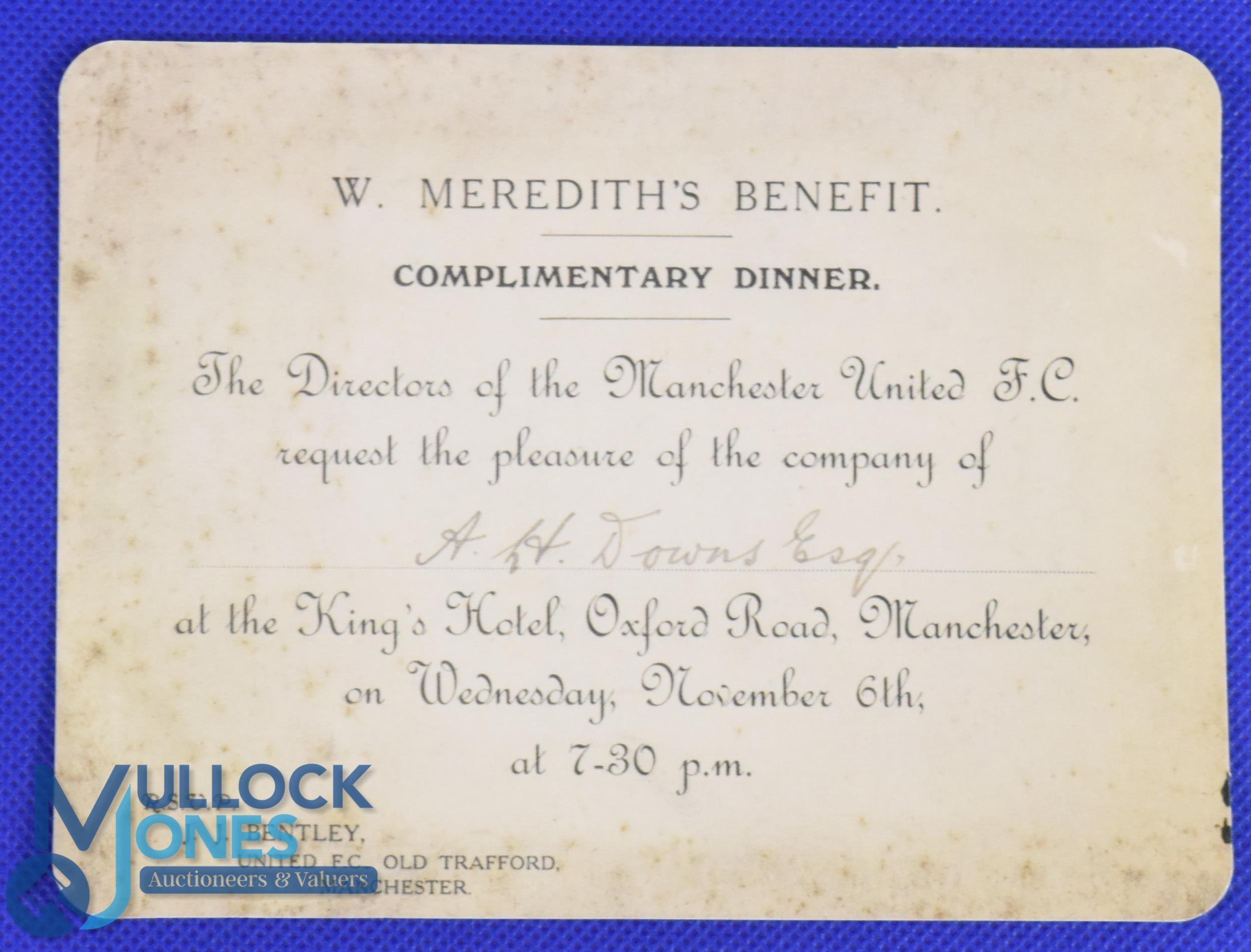 1912 Billy Meredith's Benefit complimentary dinner invitation organised by the directors of Manchester United FC and requesting the company of A J Downs Esq. The event to be at the King's Hotel, Oxford Road, Manchester on Wednesday 6 November 1912 at 7.30 pm rsvp J. J. Bentley, United FC Old Trafford; single card, blank reverse. (1)