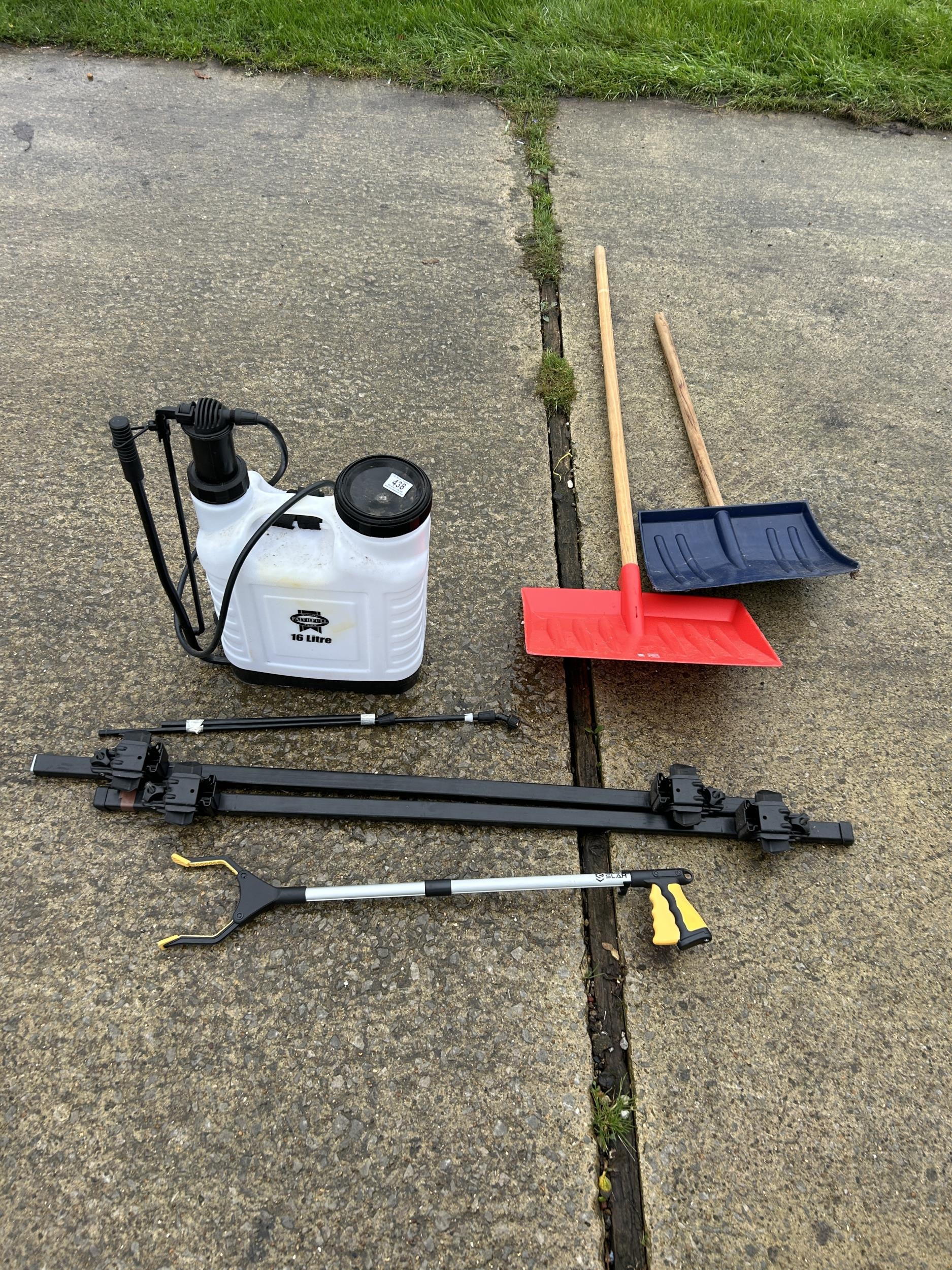 Knapsack sprayer, two snow shovel, roof bars and grabber
