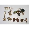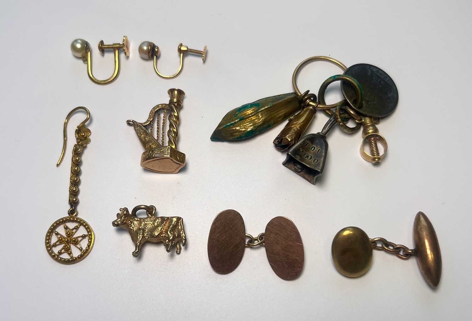 A small selection of various gold and yellow metal jewellery, to include a pair imitation pearl earrings, stamped 18ct, two single cufflinks, both with 9ct hallmarks, two charms, one with 9ct hallmark, a single drop earring, stamped 18, total weight 12.5g, together with a keyring of charms
