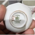 Three late 18th century English porcelain teacups decorated in the famille rose pallette, a composite Coalport porcelain part dinner and coffee service, 19th/20th century, printed green marks including sugar bowls and covers, two shaped oval dishes, four coffee cans, assorted saucers, plates and other items, a Spode miniature porcelain sparrowbeak jug, early 19th century, a Crown Staffordshire miniature ewer and basin and other items