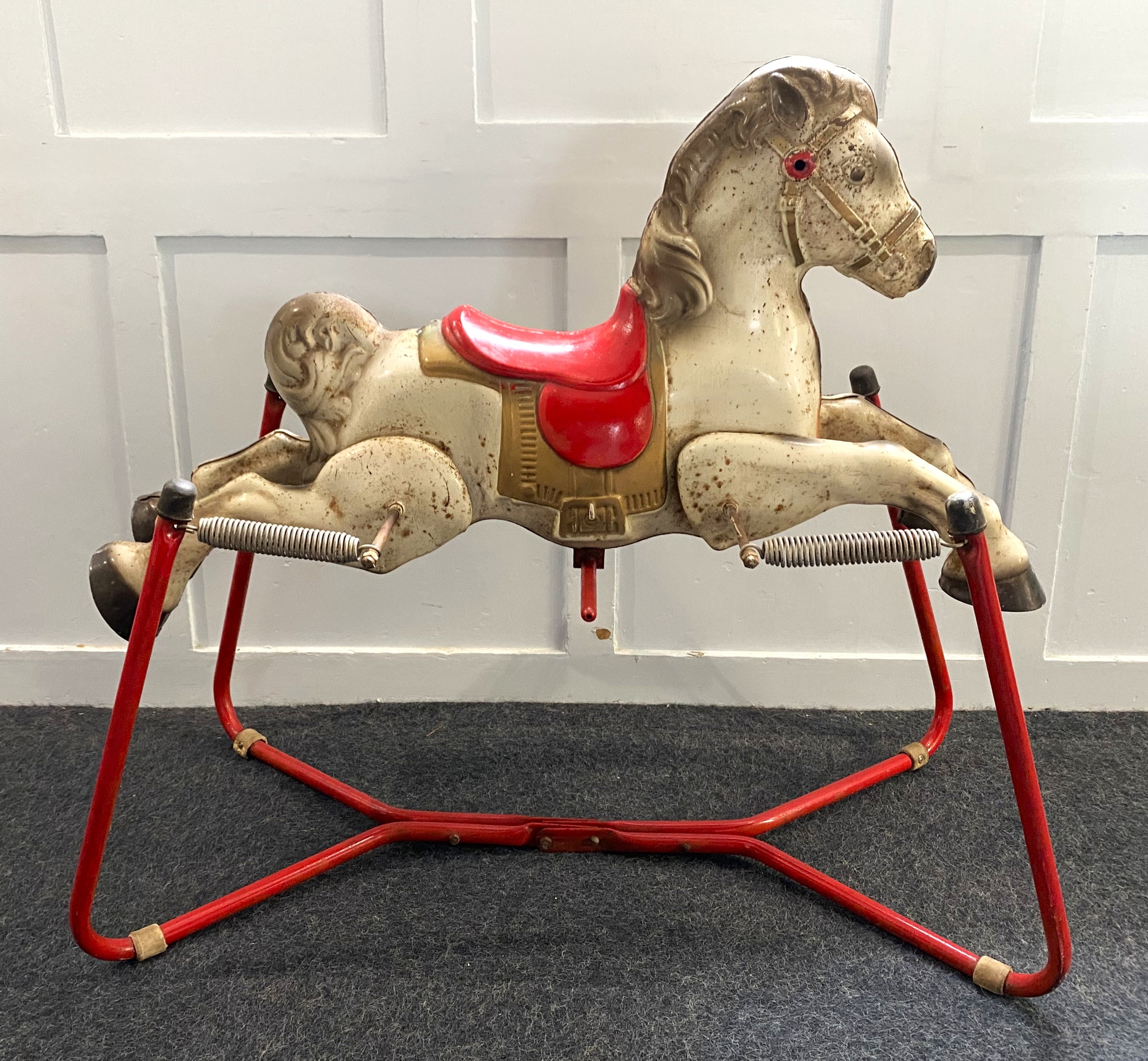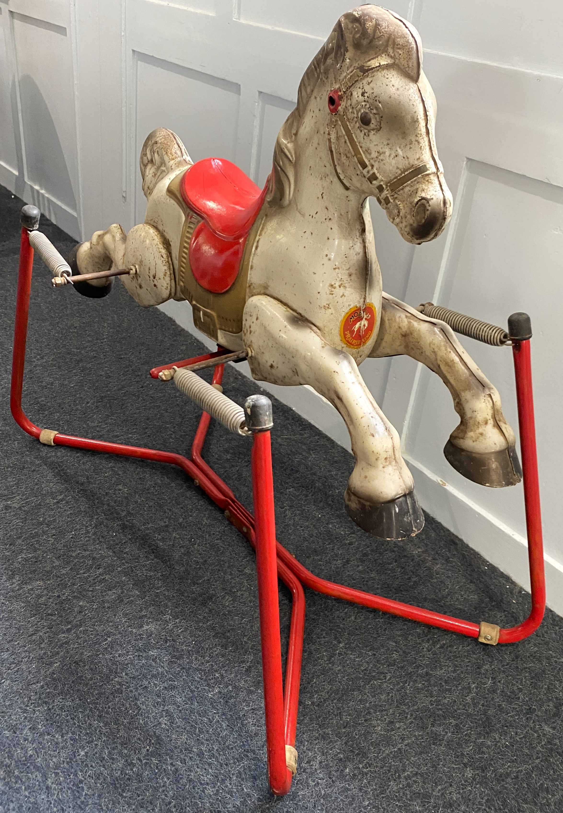 A Mobo 'Praire King' spring rocking horse, mid 20th century, bearing makers label to front, on stand, length approximately 100cm