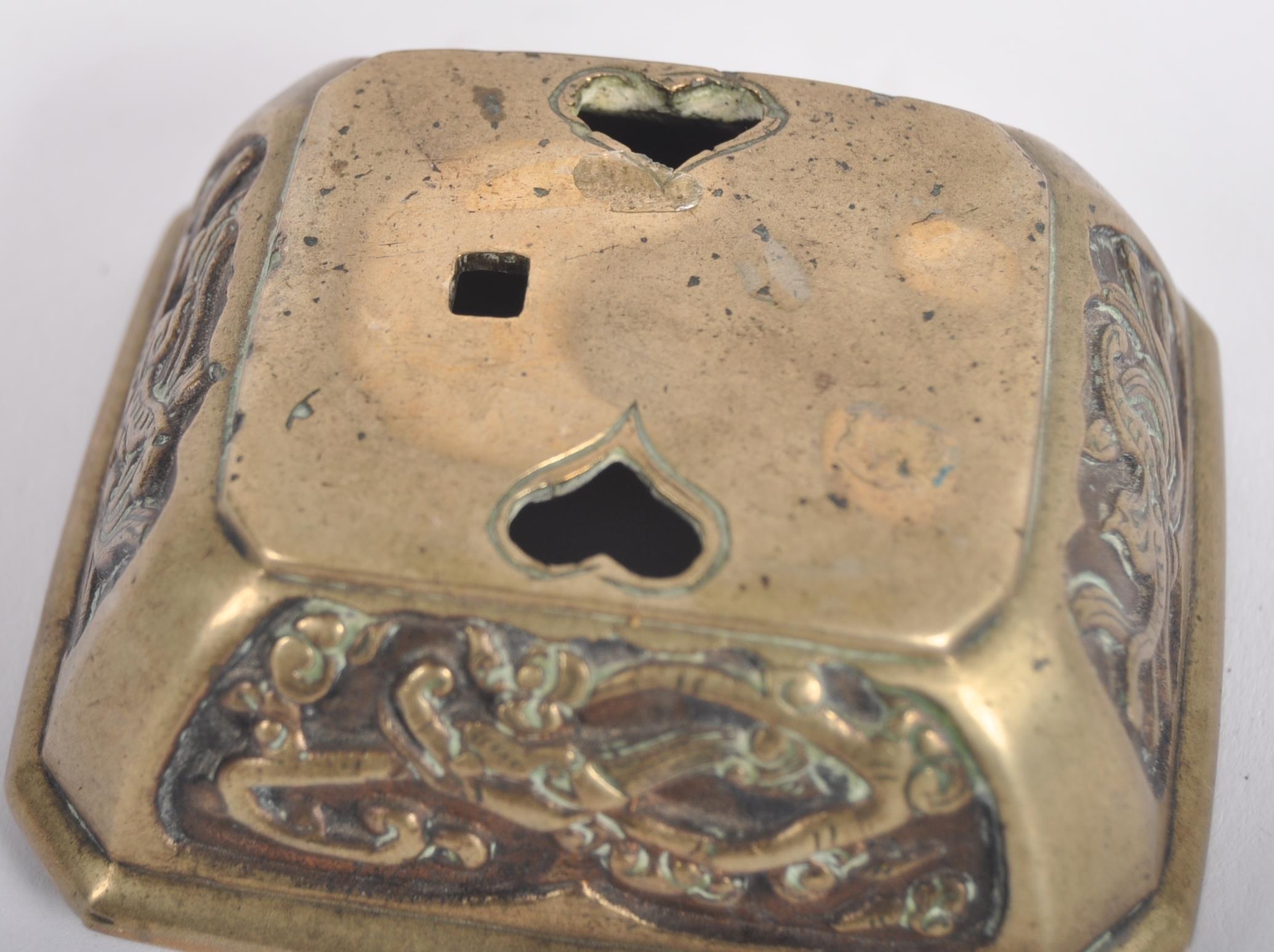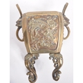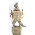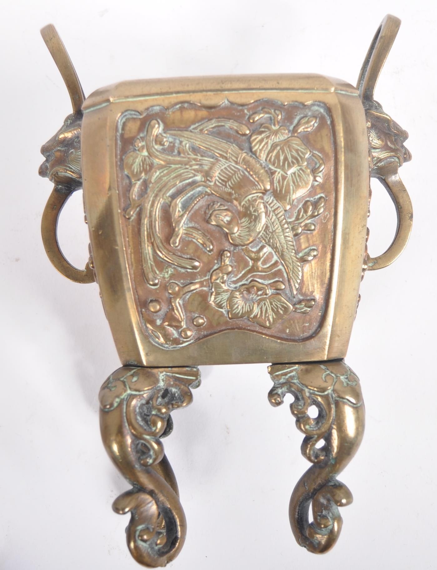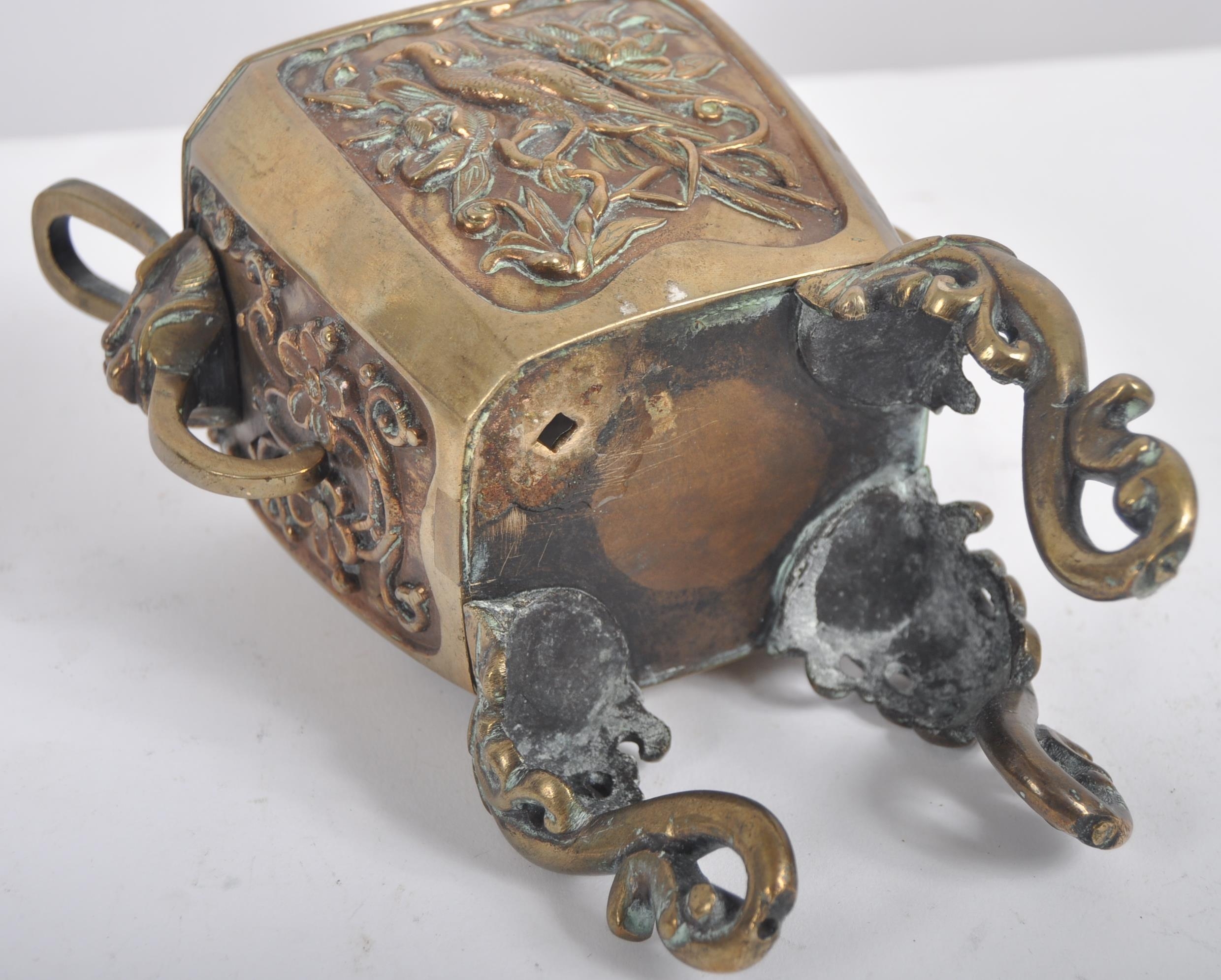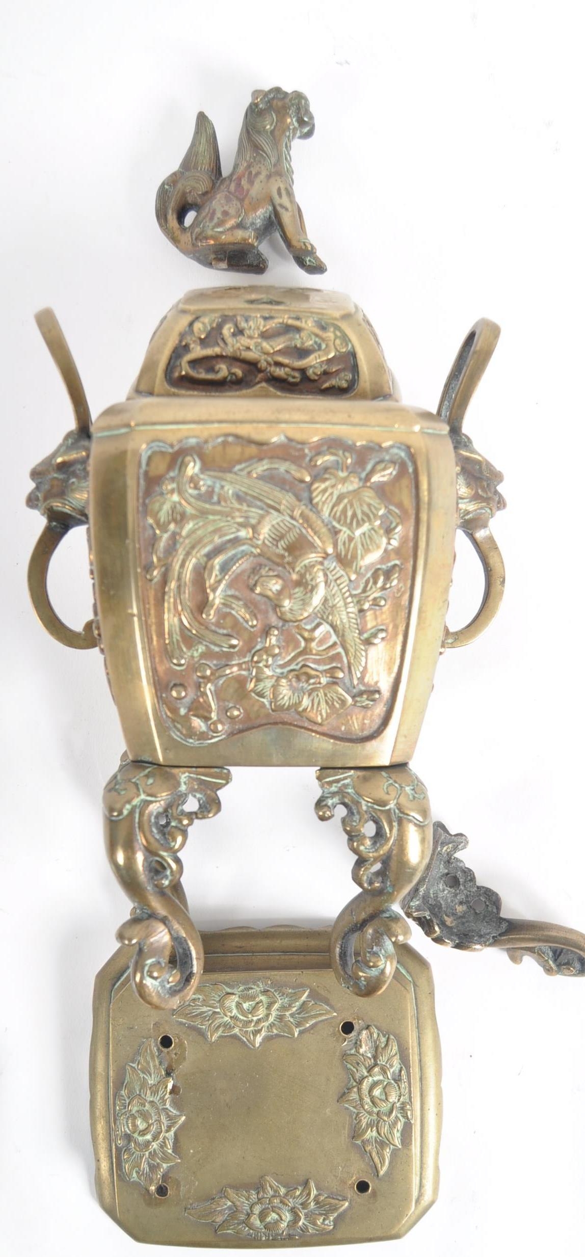 An early 20th century Chinese bronze censer. A highly decorated censer depicting a phoenix on both panels with repeated floral patterns and motifs, the lid with mounted posed dragon foo dog . Mounted on a raised plinth. Approximately 33cm tall.