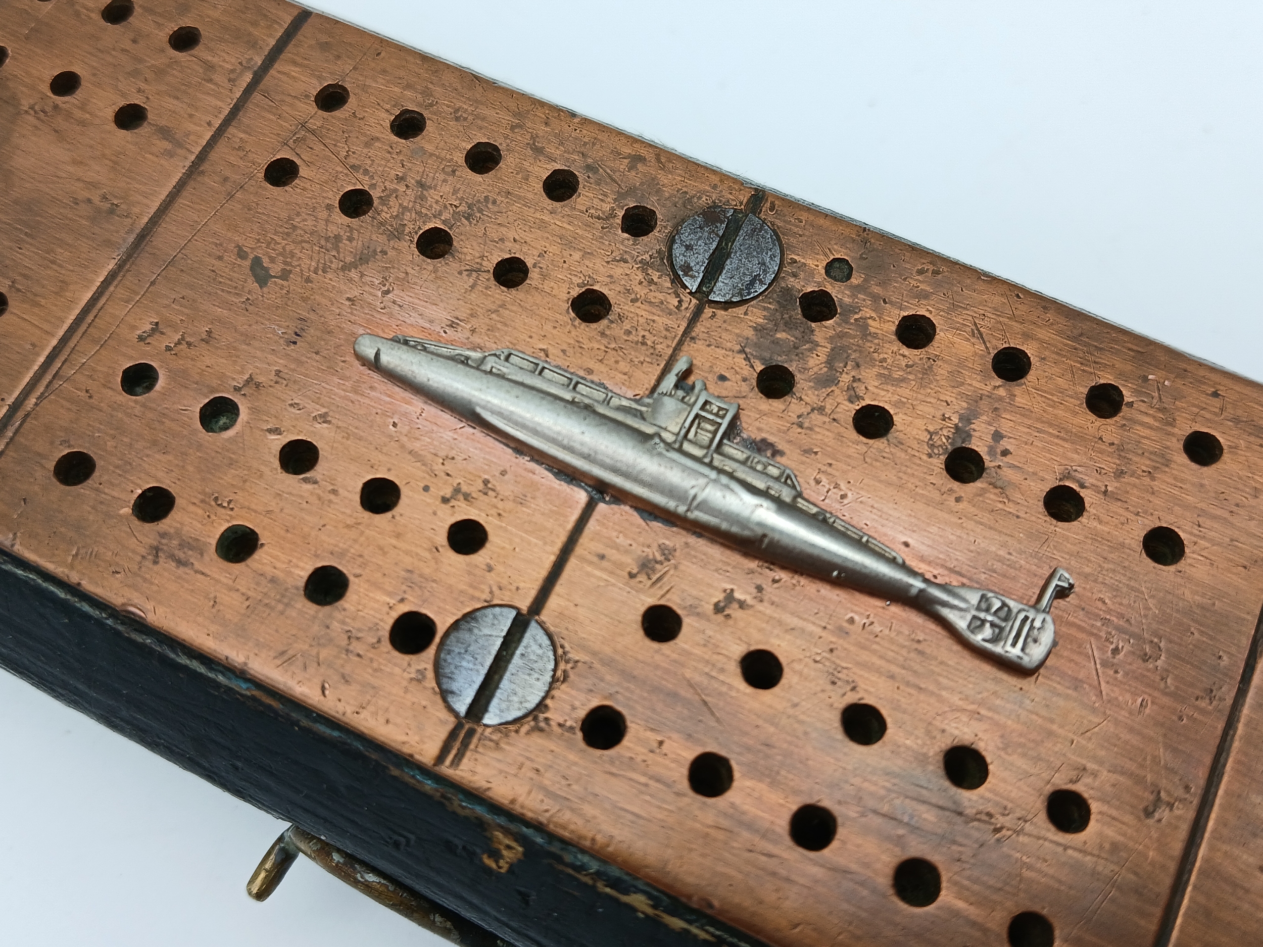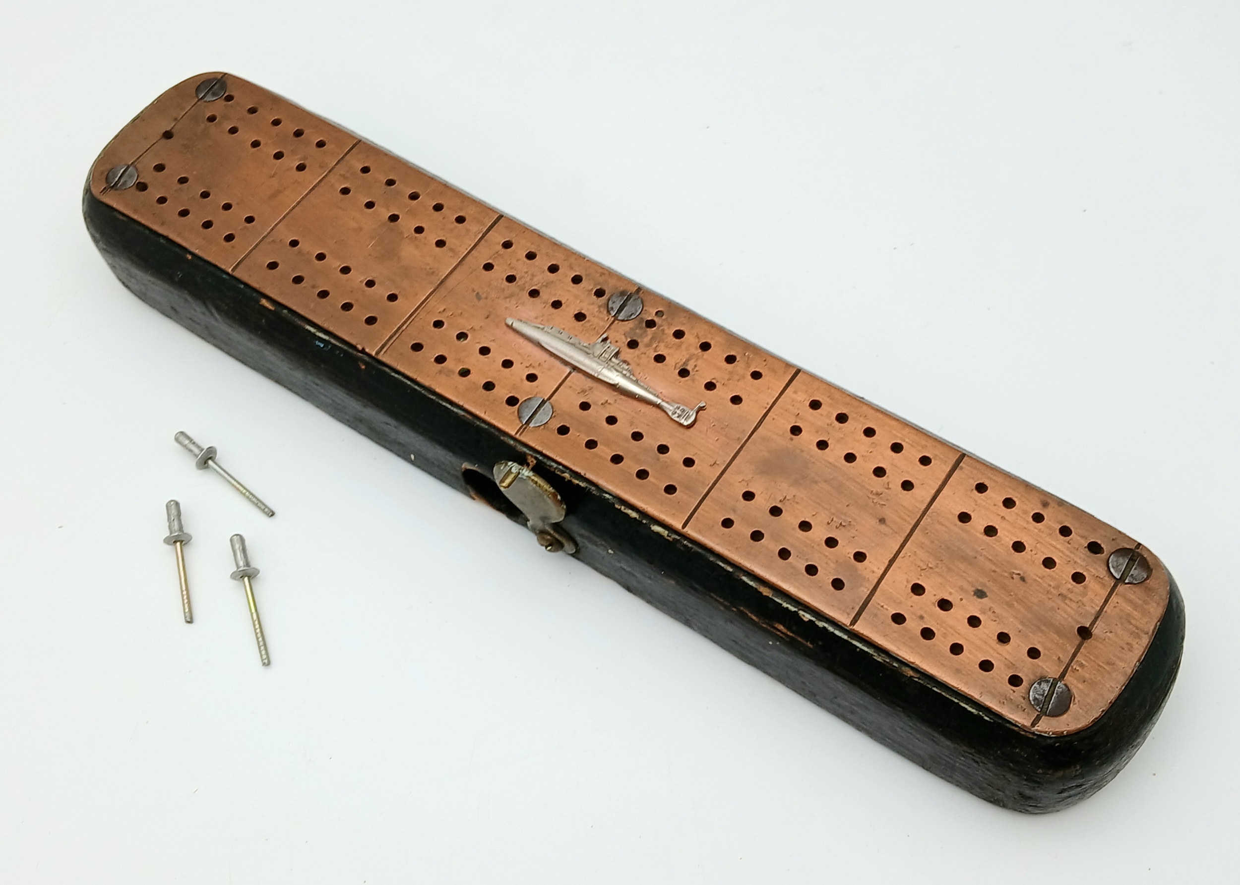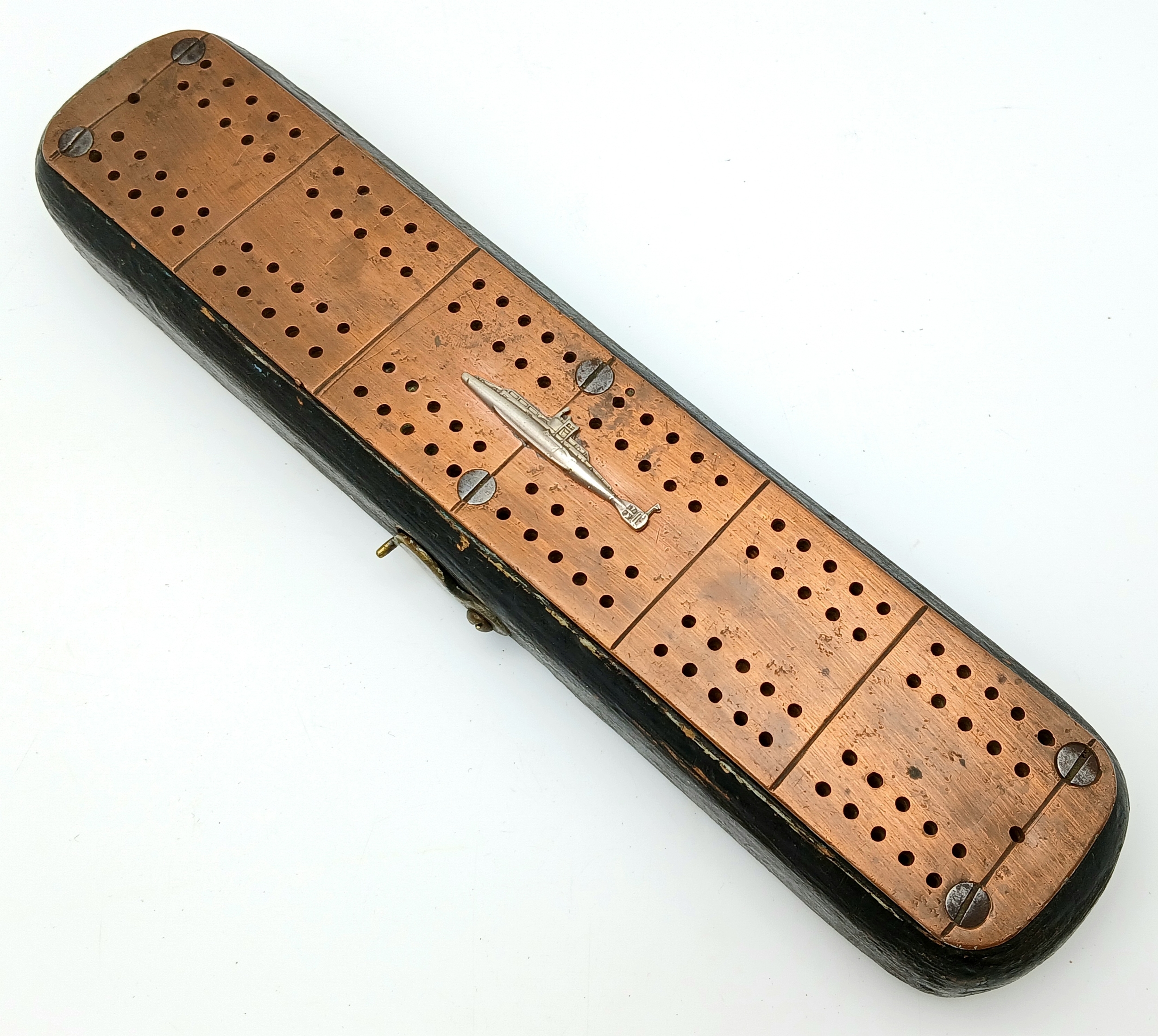 WW1 British WW1 Submariners Home Made Crib Board with a silver submarine sweethearts brooch soldered onto the copper strip. The name “Lawson” has been branded on the back.