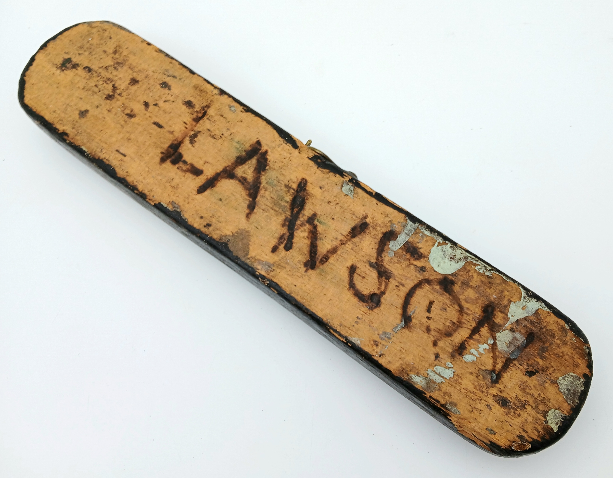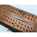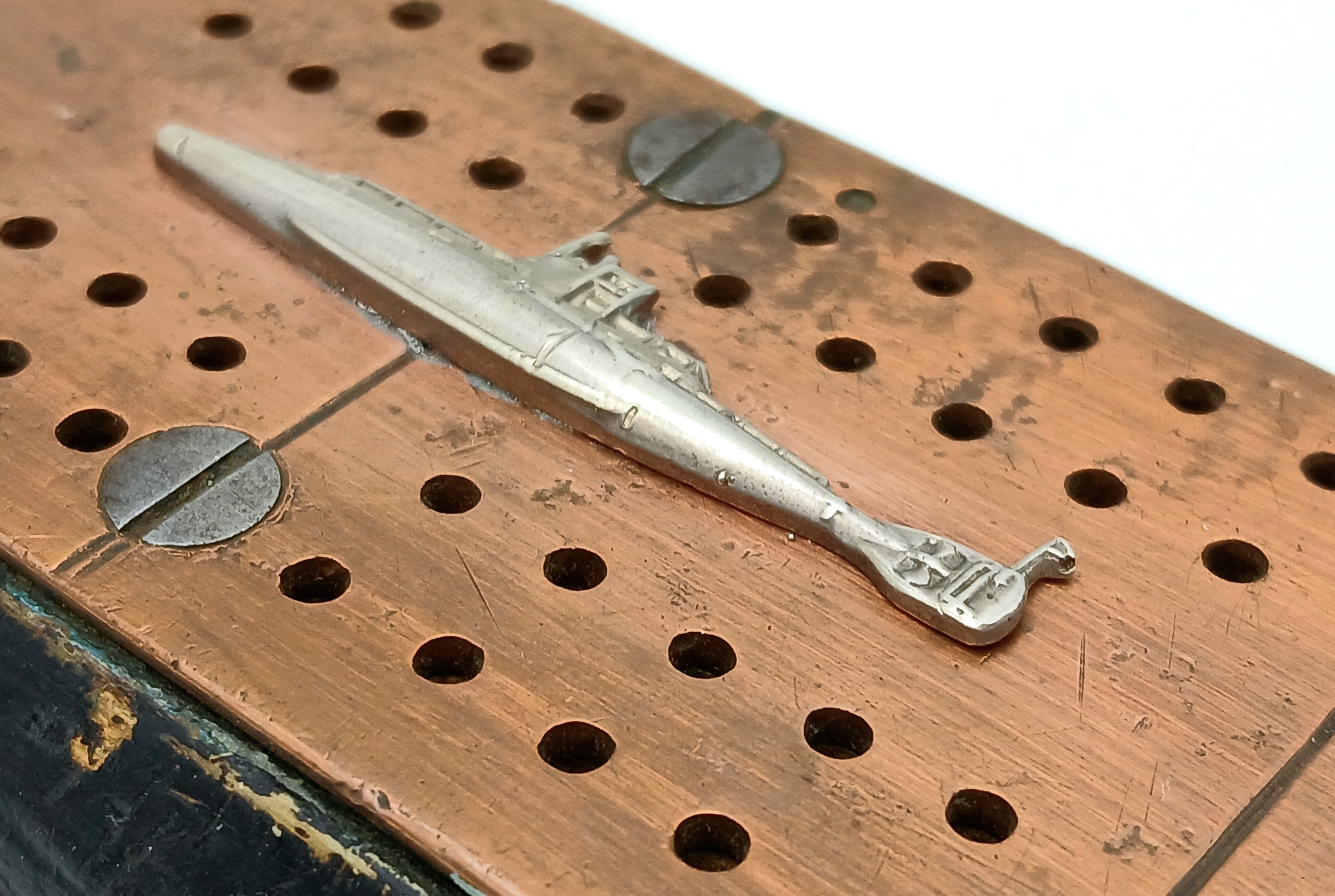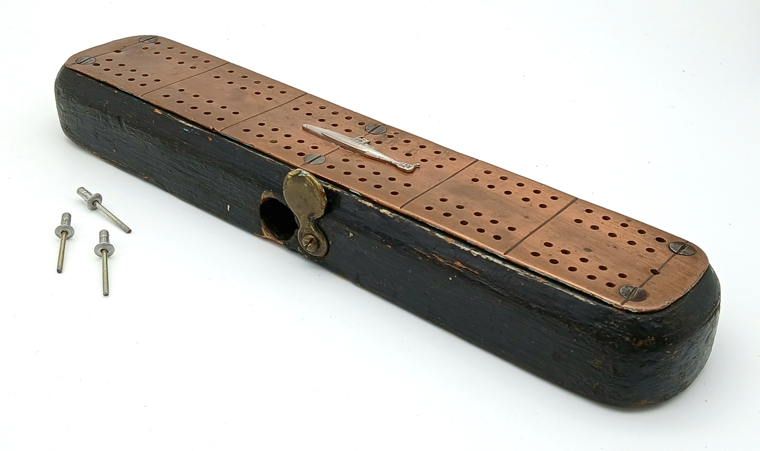 WW1 British WW1 Submariners Home Made Crib Board with a silver submarine sweethearts brooch soldered onto the copper strip. The name “Lawson” has been branded on the back.