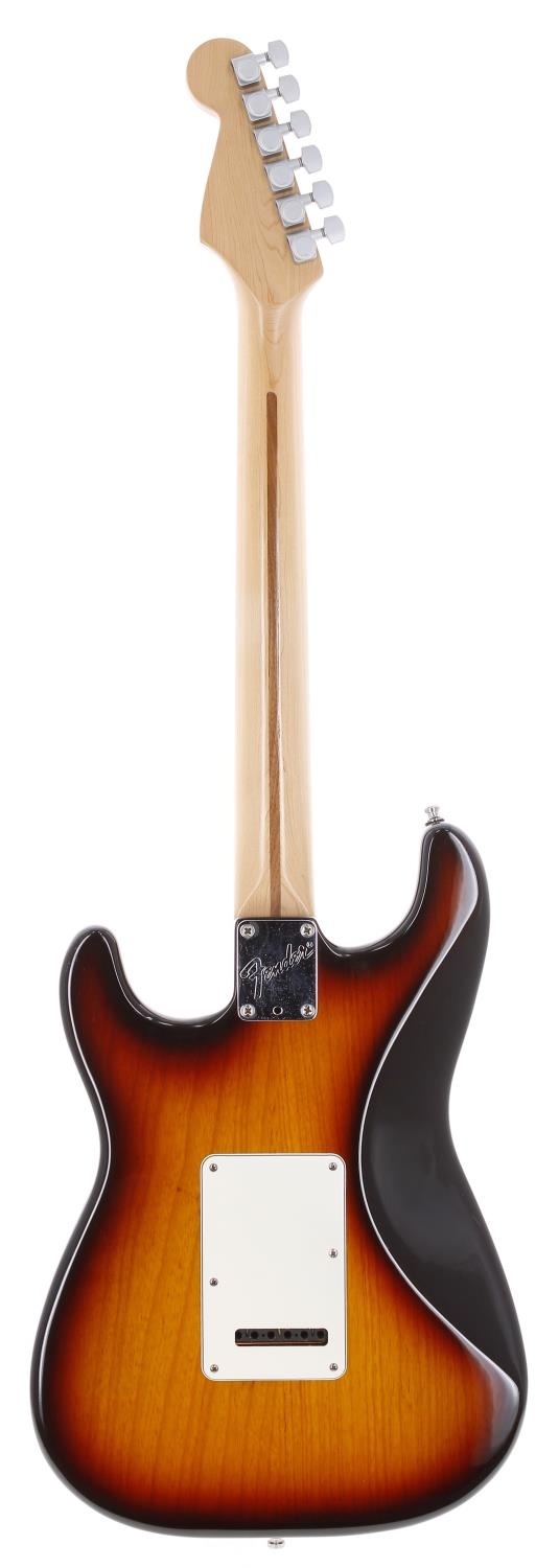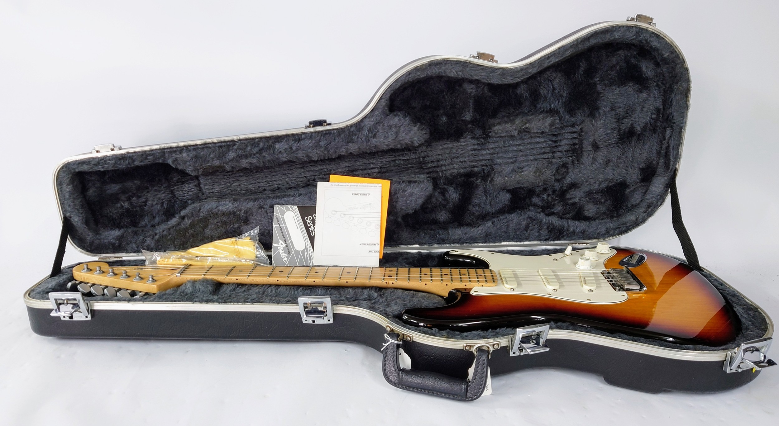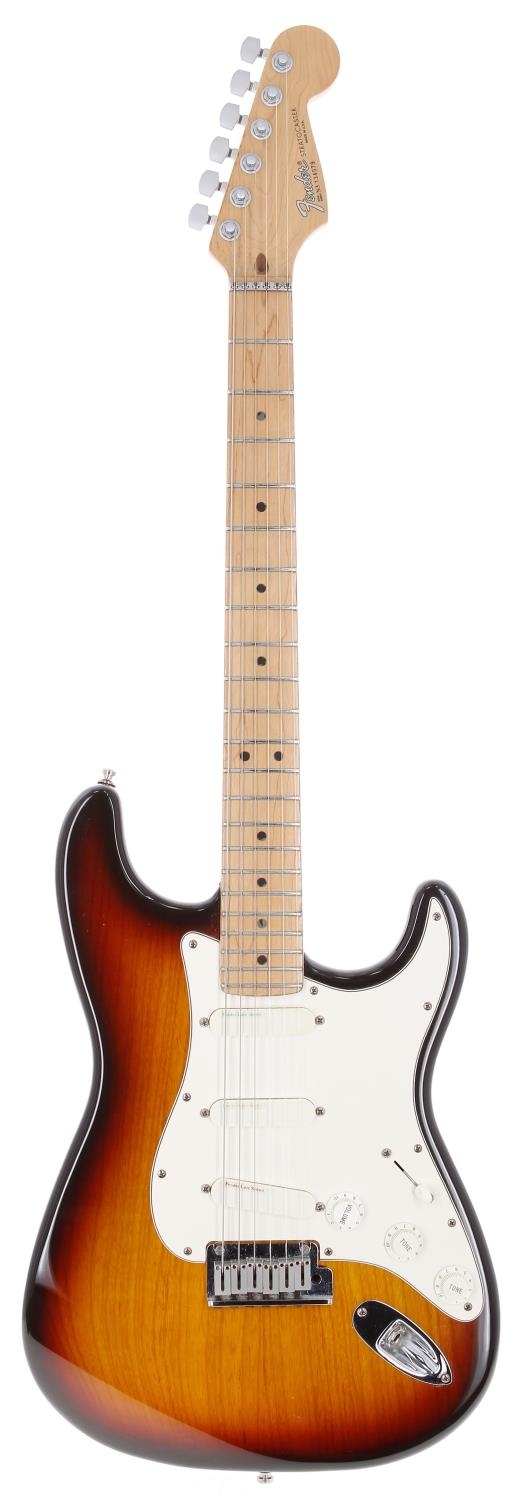 1993 Fender Deluxe Stratocaster Plus electric guitar, made in USA; Body: three-tone sunburst finish, a few light surface marks; Neck: maple; Fretboard: maple; Frets: light wear to first position; Electrics: working; Hardware: good; Case: original hard case; Weight: 3.53kg; Overall condition: very good
