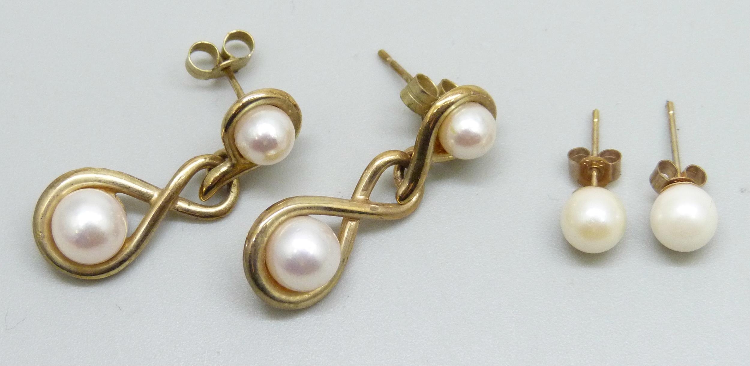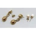 A pair of 9ct gold and pearl drop earrings, and a pair of yellow metal stud earrings, 5.8g total