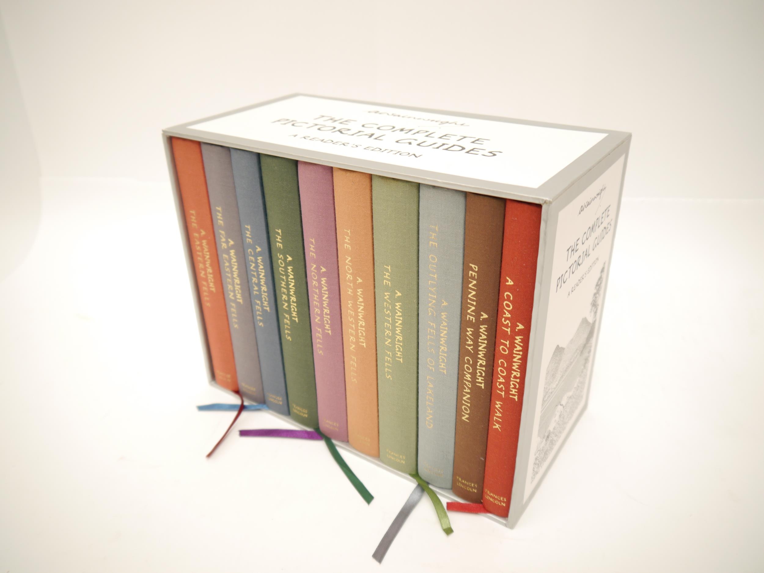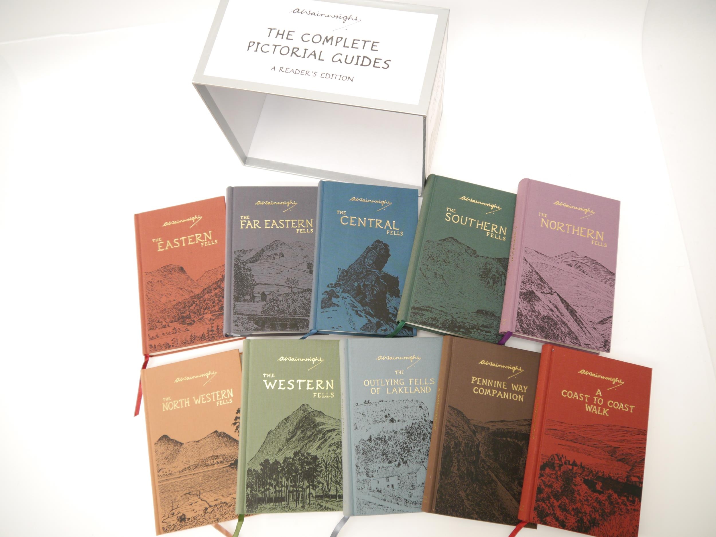 Alfred Wainwright: 'The Complete Pictorial Guides. A Reader's Edition', London, Frances Lincoln, 2009, special edition with enlarged type and images of the 50th Anniversary edition, 10 volumes (8 volumes Lakeland Fells plus Pennine Way Companion and Coast to Coast Walk), each illustrated throughout, original pictorial cloth gilt, original pictorial card box/slip case