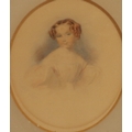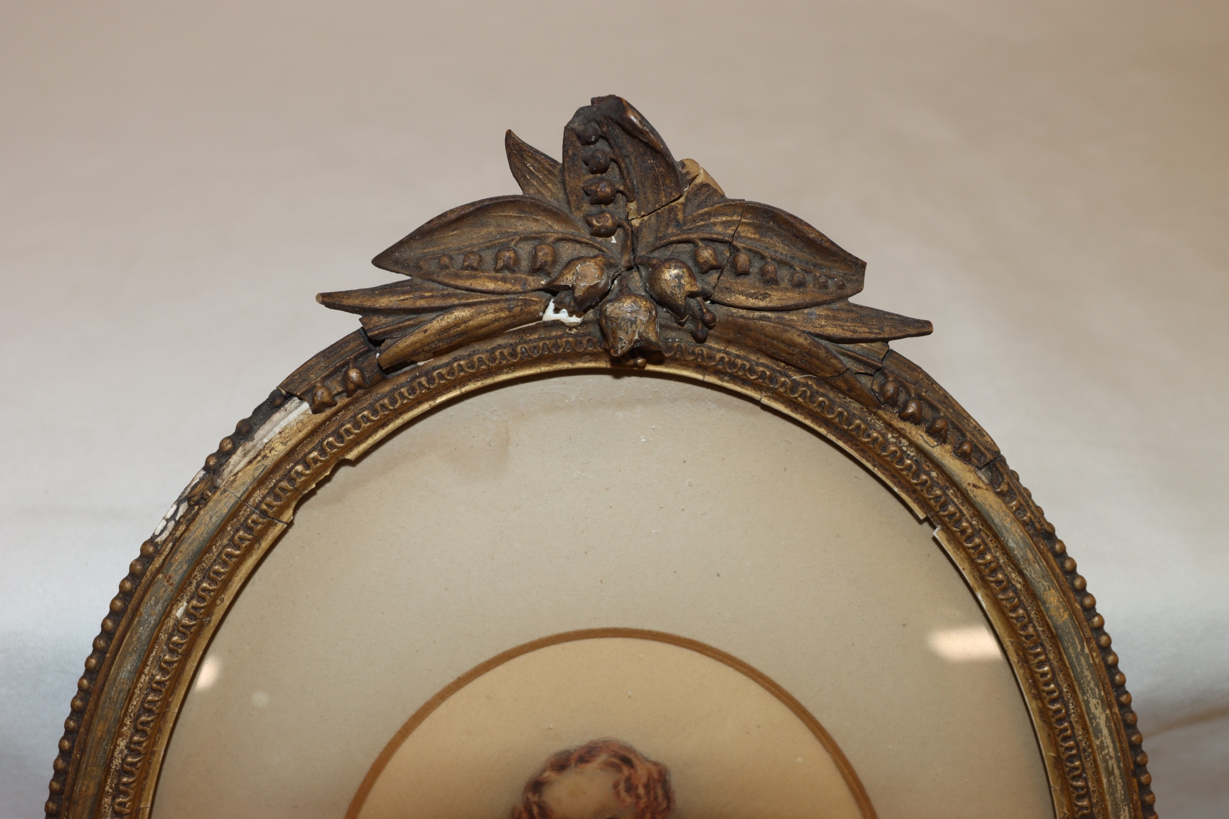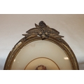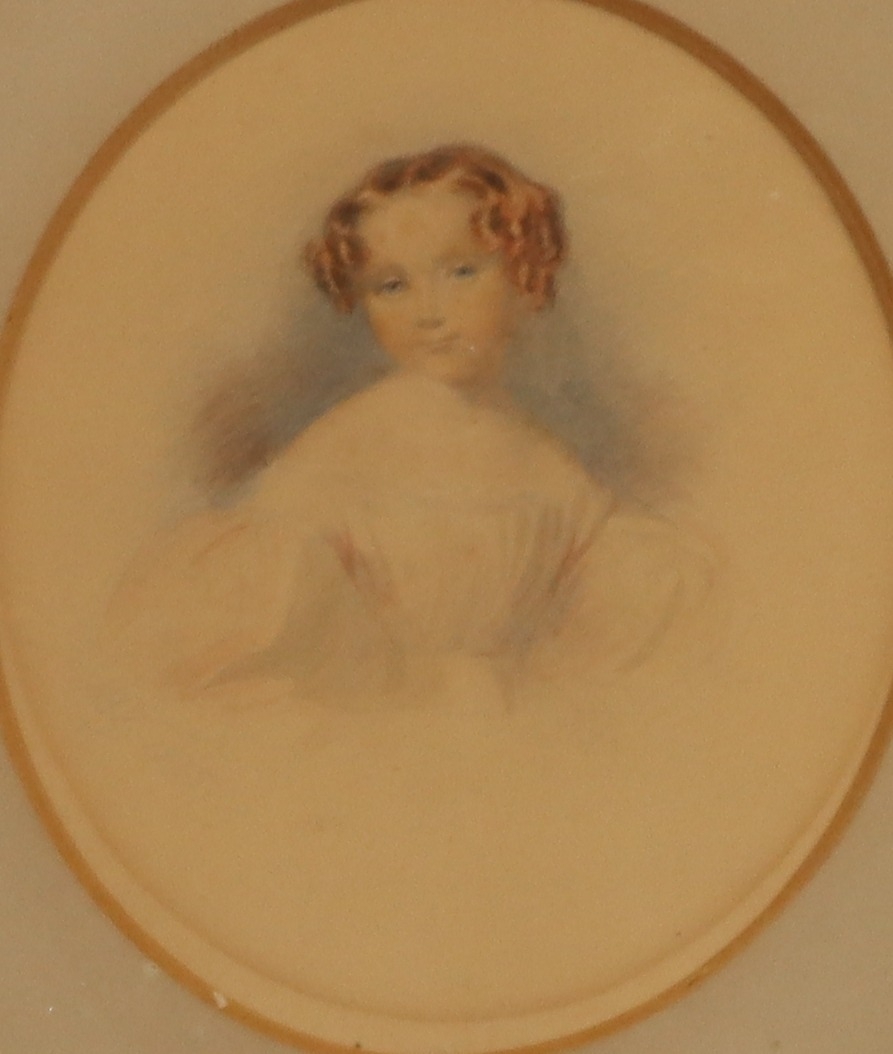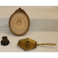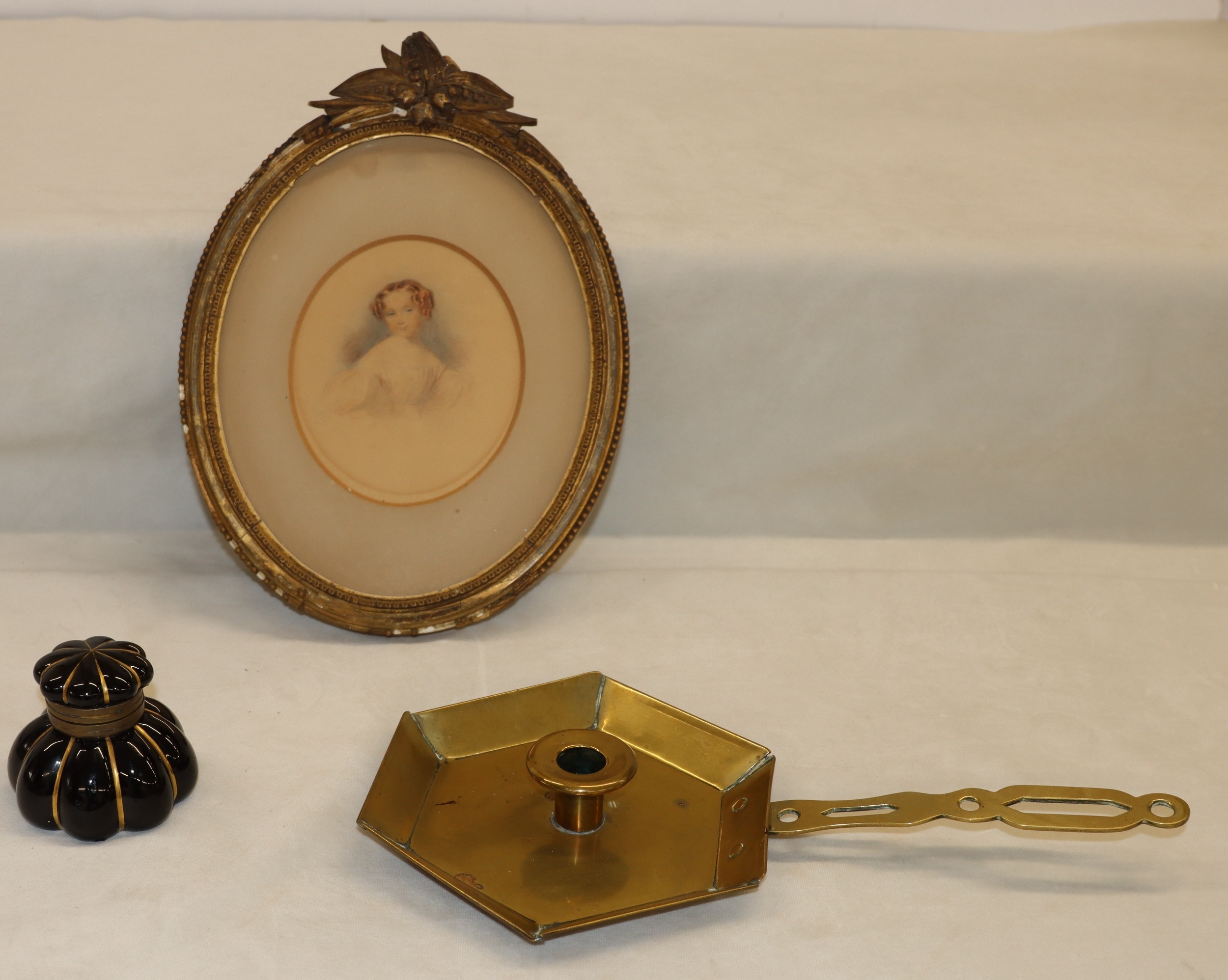 An oval miniature portrait of a young girl, 13.5cm x 12cm, in gilt frame (frame damaged, an inkwell (top loose) and a brass candle holder. (3)