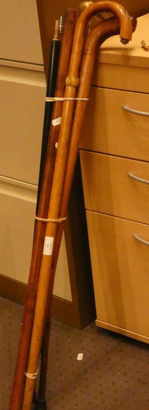 A bone handled walking stick together with a collection of various walking sticks/canes (7)