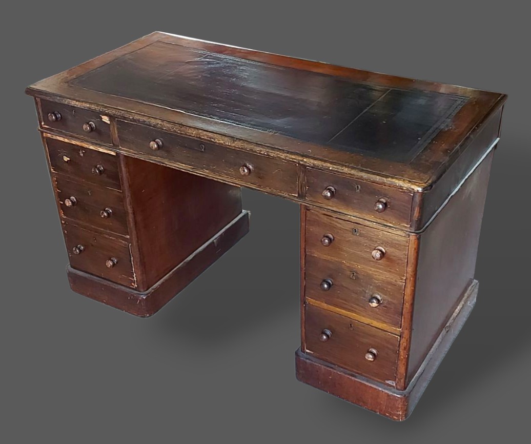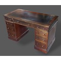 A Victorian twin pedestal desk, the tooled leather inset top above nine drwers with knob handles, 121cms wide, 60cms deep and 71cms tall