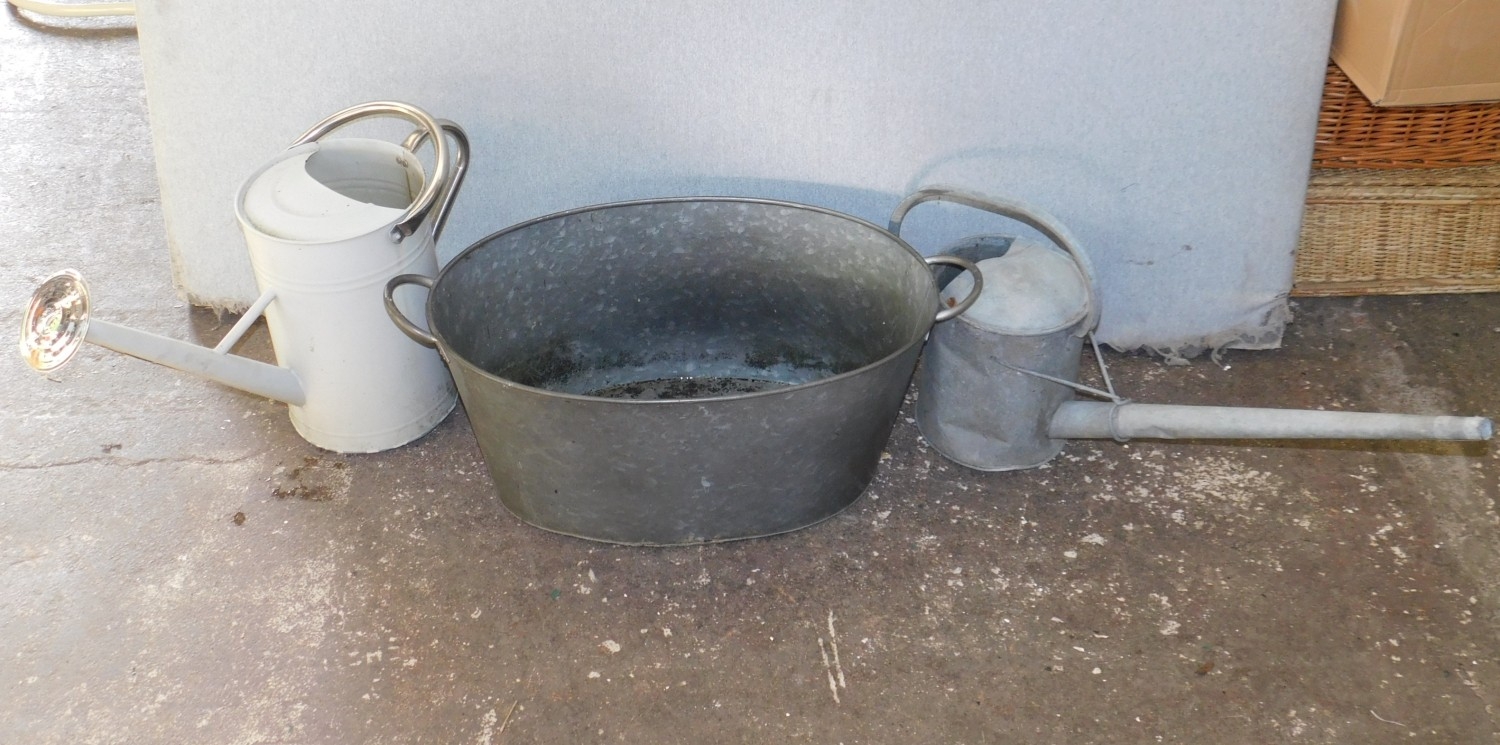 Galvanised tub and two watering cans