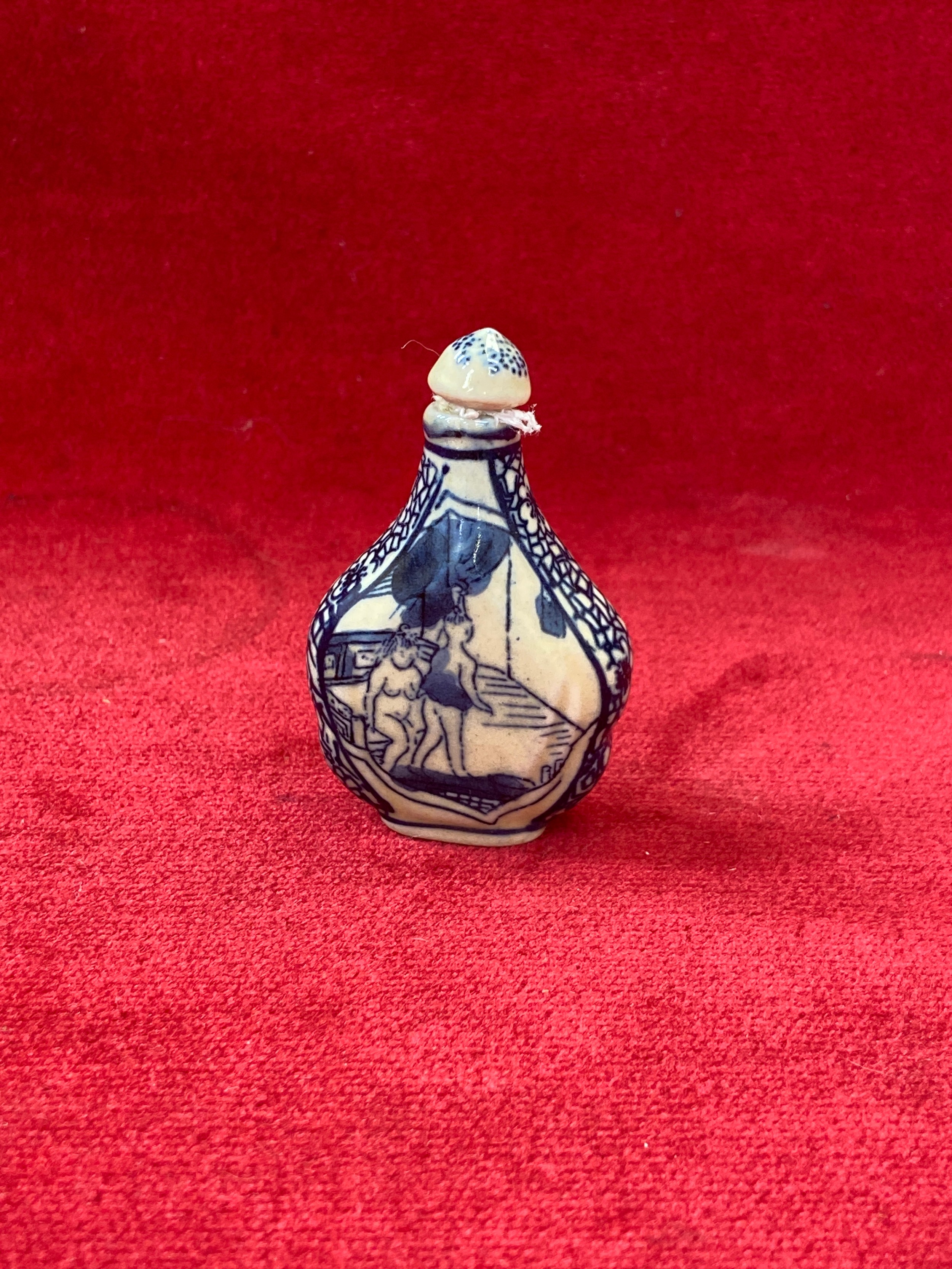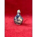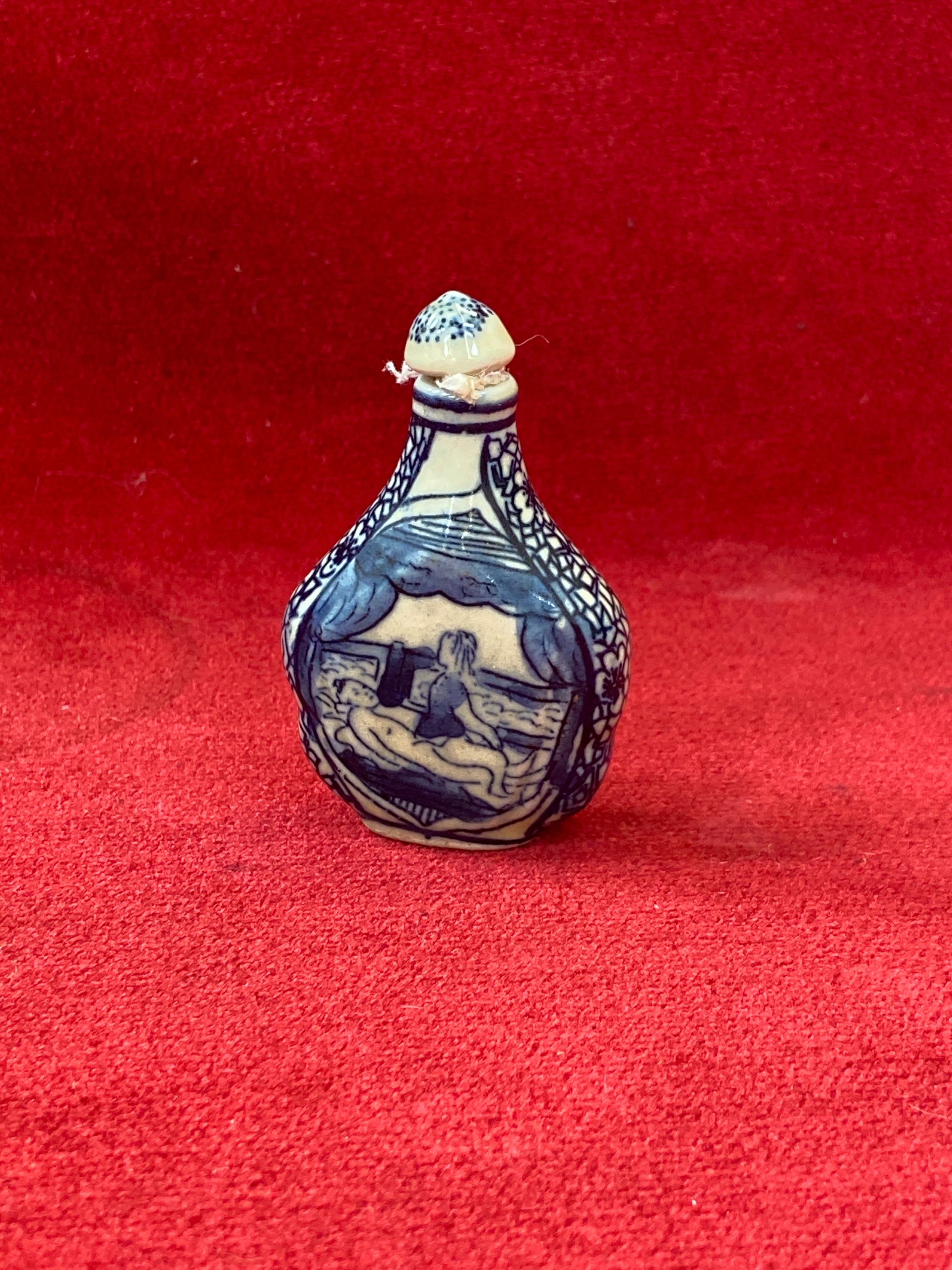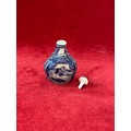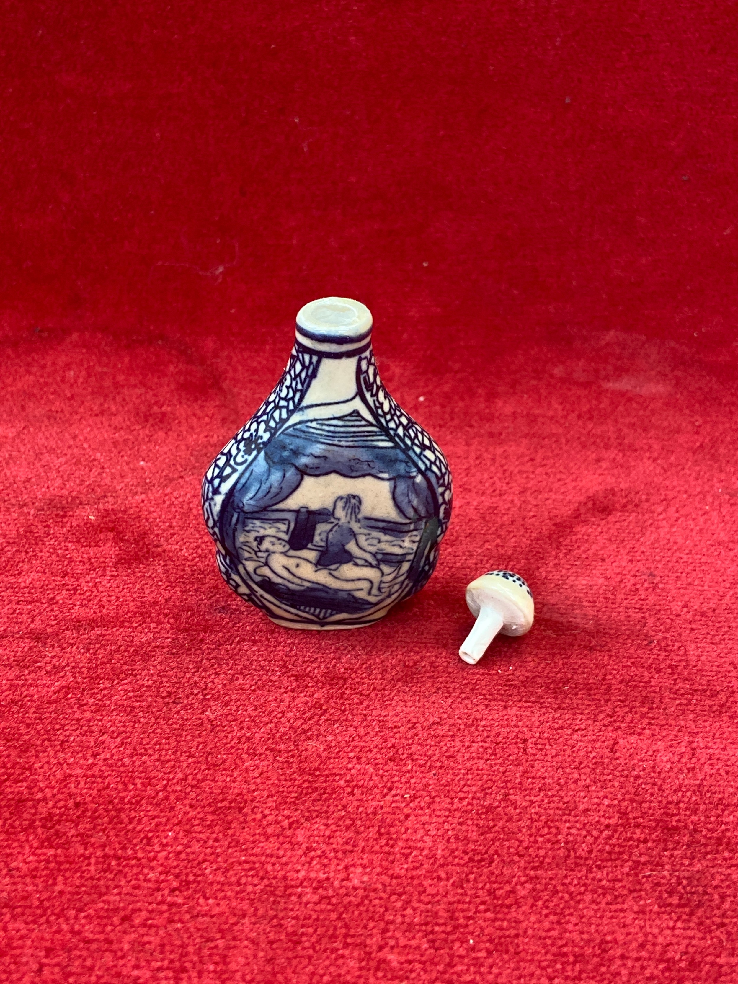 Chinese porcelain blue and white snuff bottle, decorated with erotic scenes on each side and complete with the original stopper. Approx 6.5cm tall.