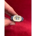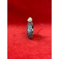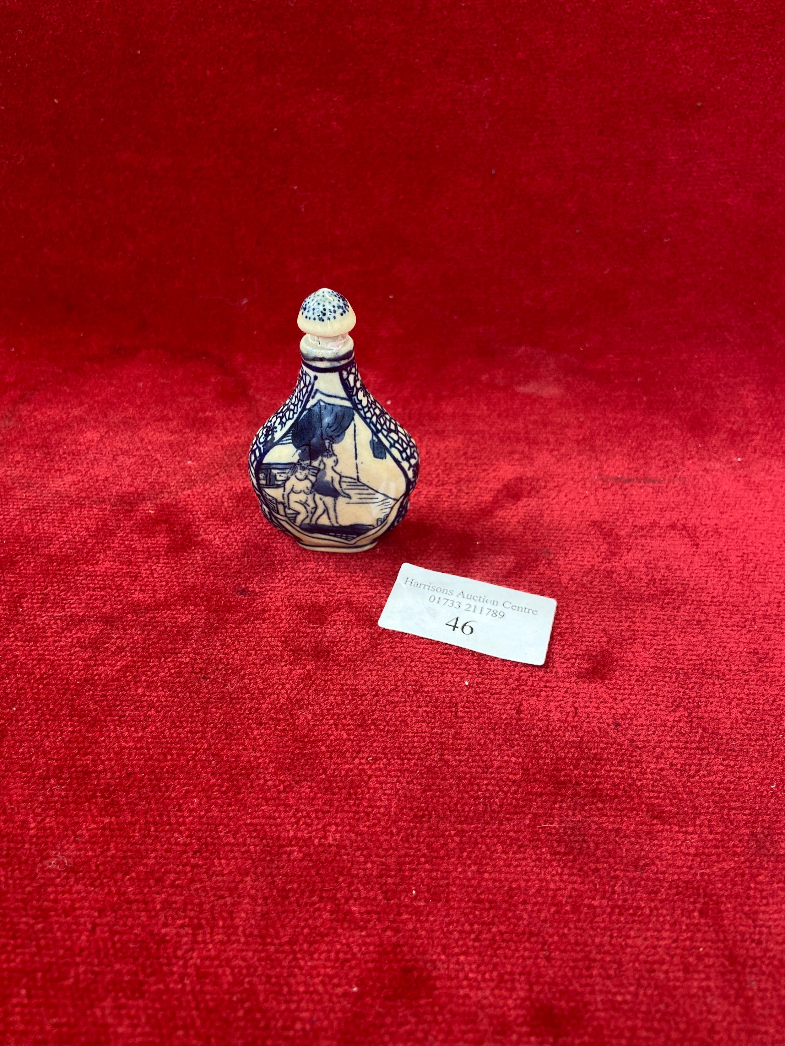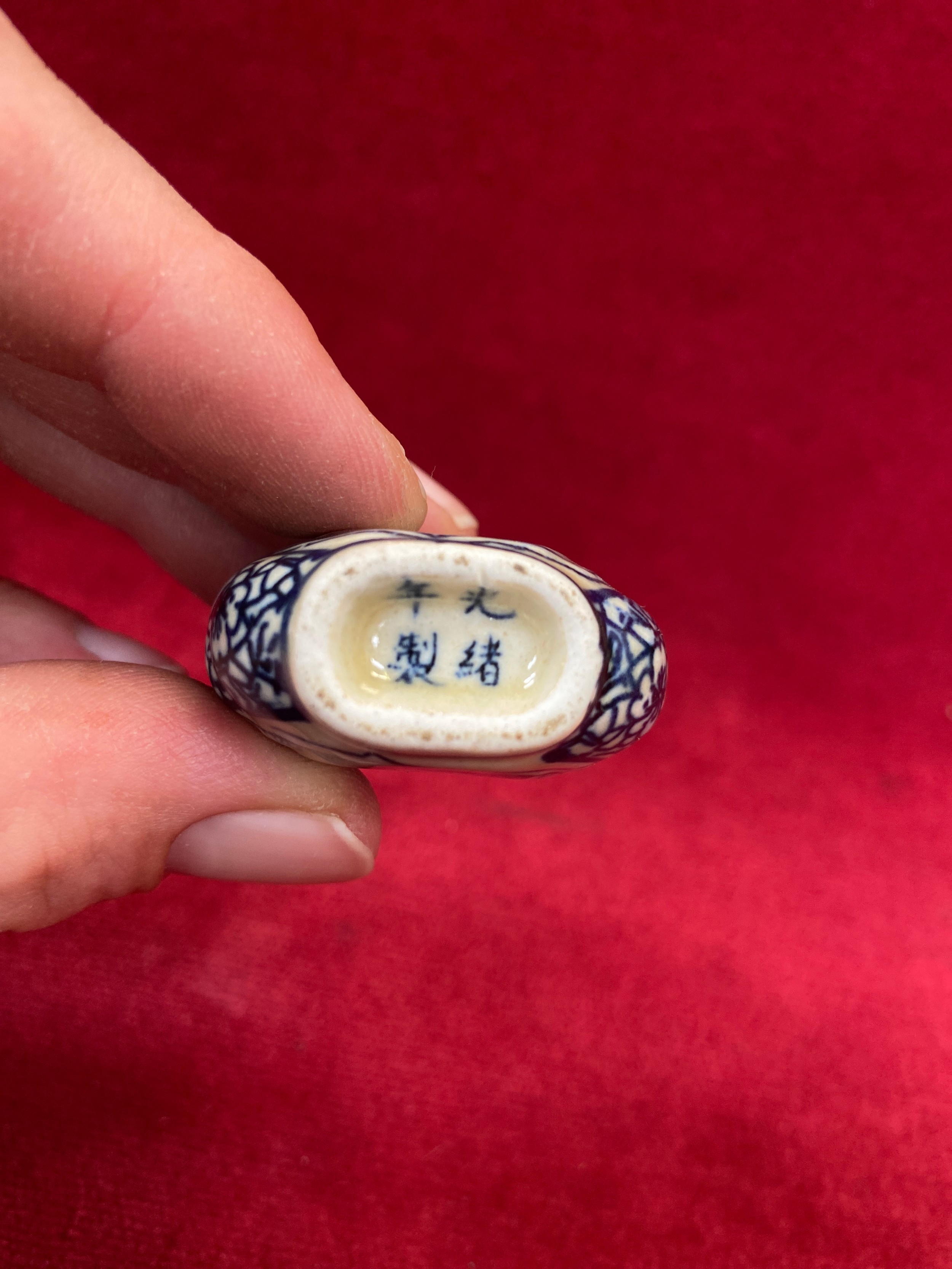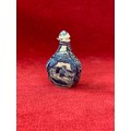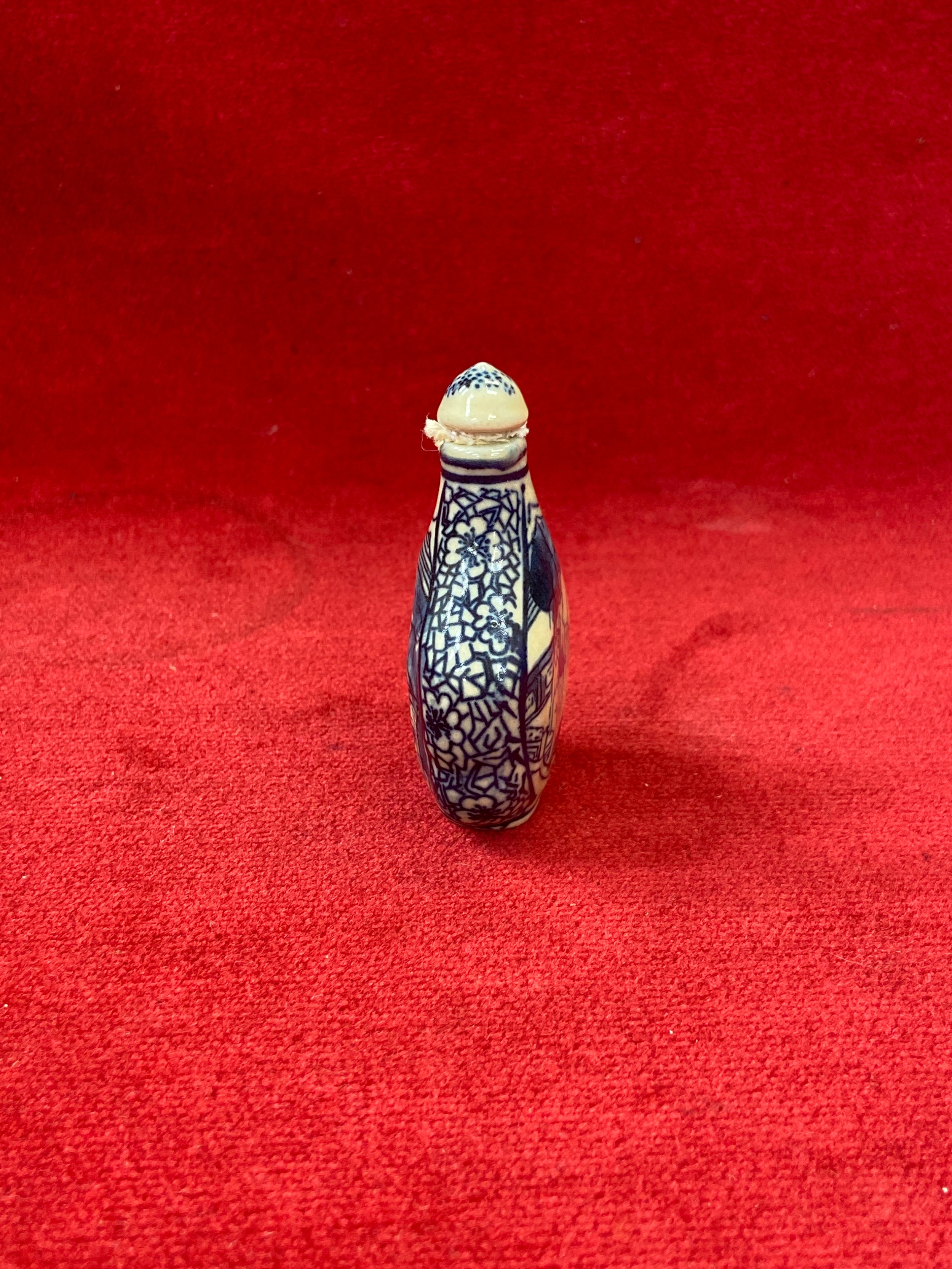 Chinese porcelain blue and white snuff bottle, decorated with erotic scenes on each side and complete with the original stopper. Approx 6.5cm tall.