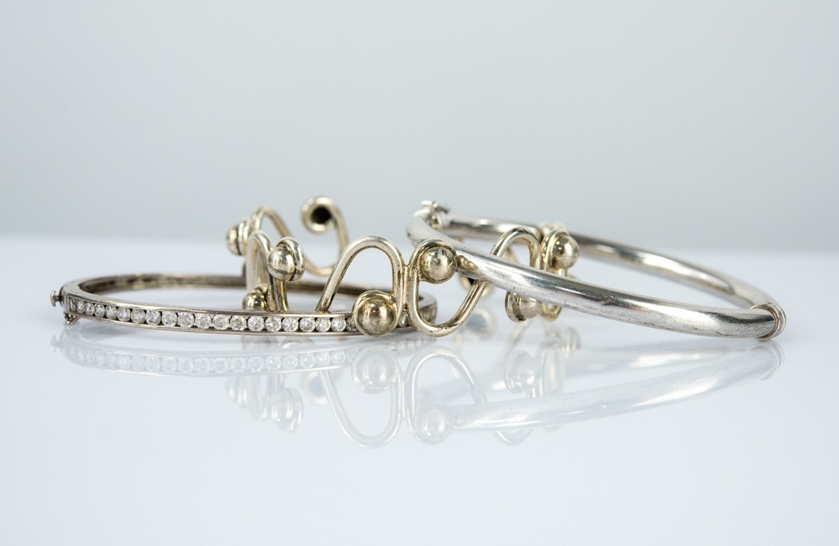 STERLING SILVER WAVE DESIGN CUFF with beads, silver and channel set cubic zirconia hinged bangle, another plain silver hinged bangle, 1.54oz (3)