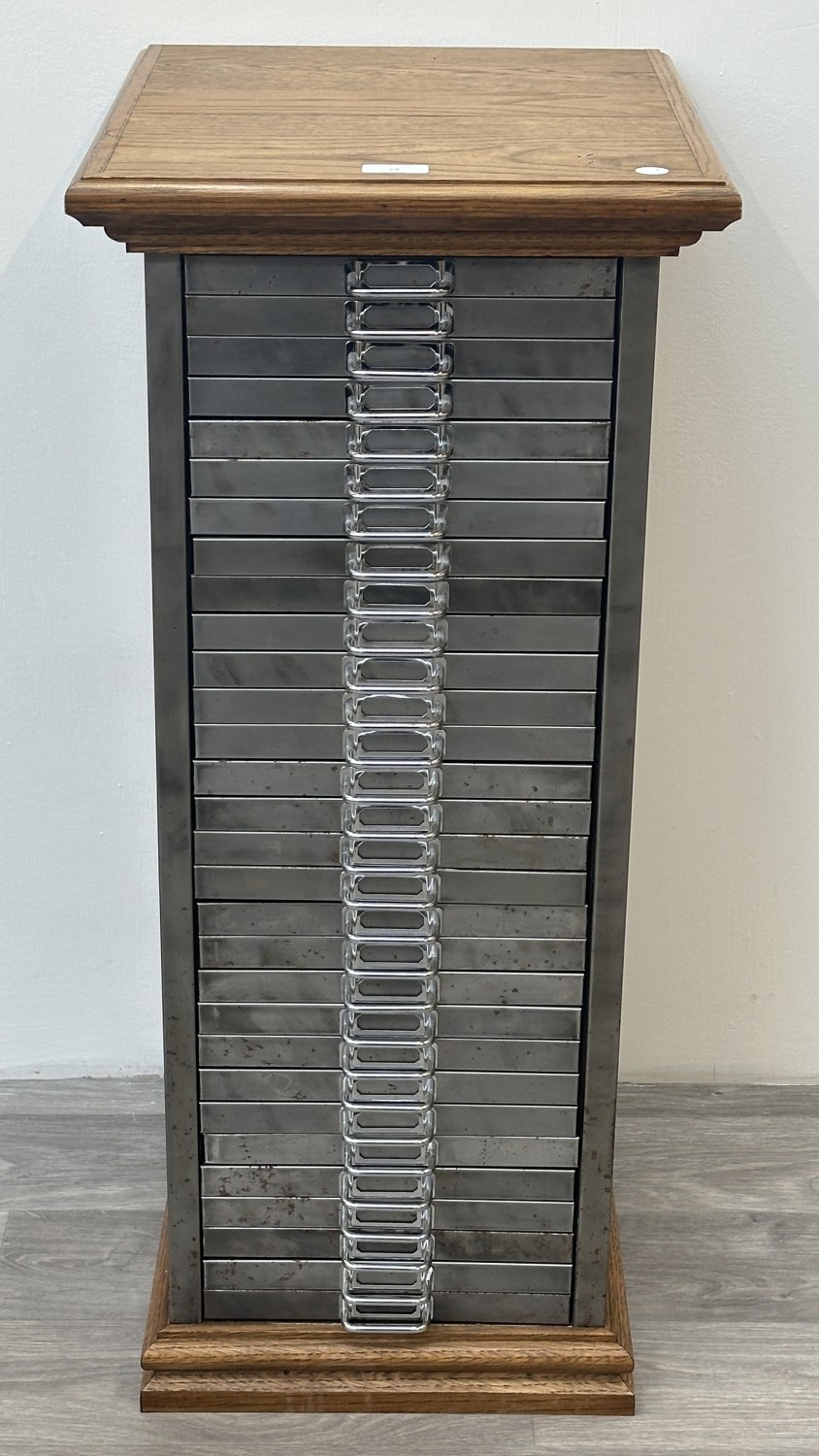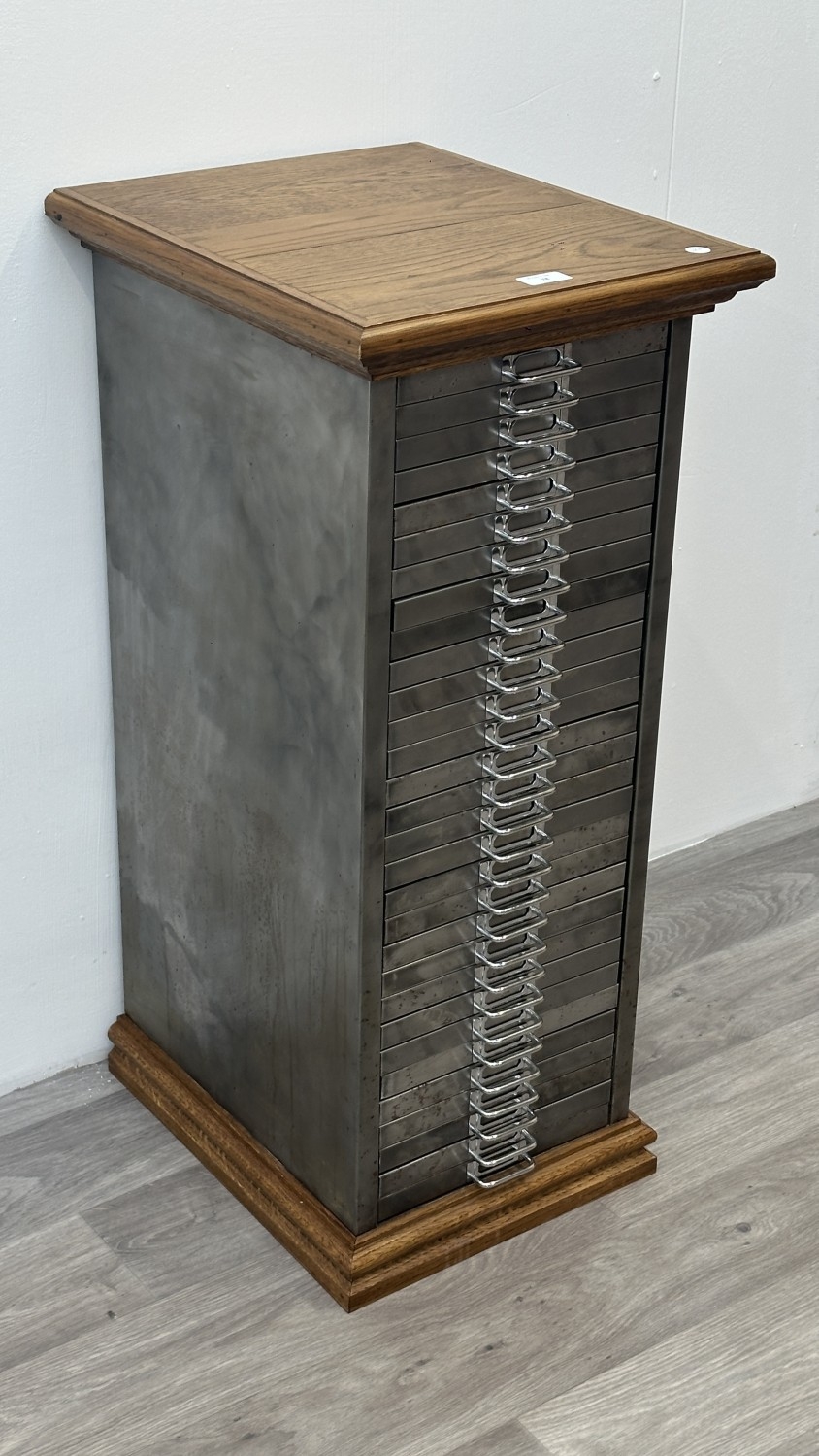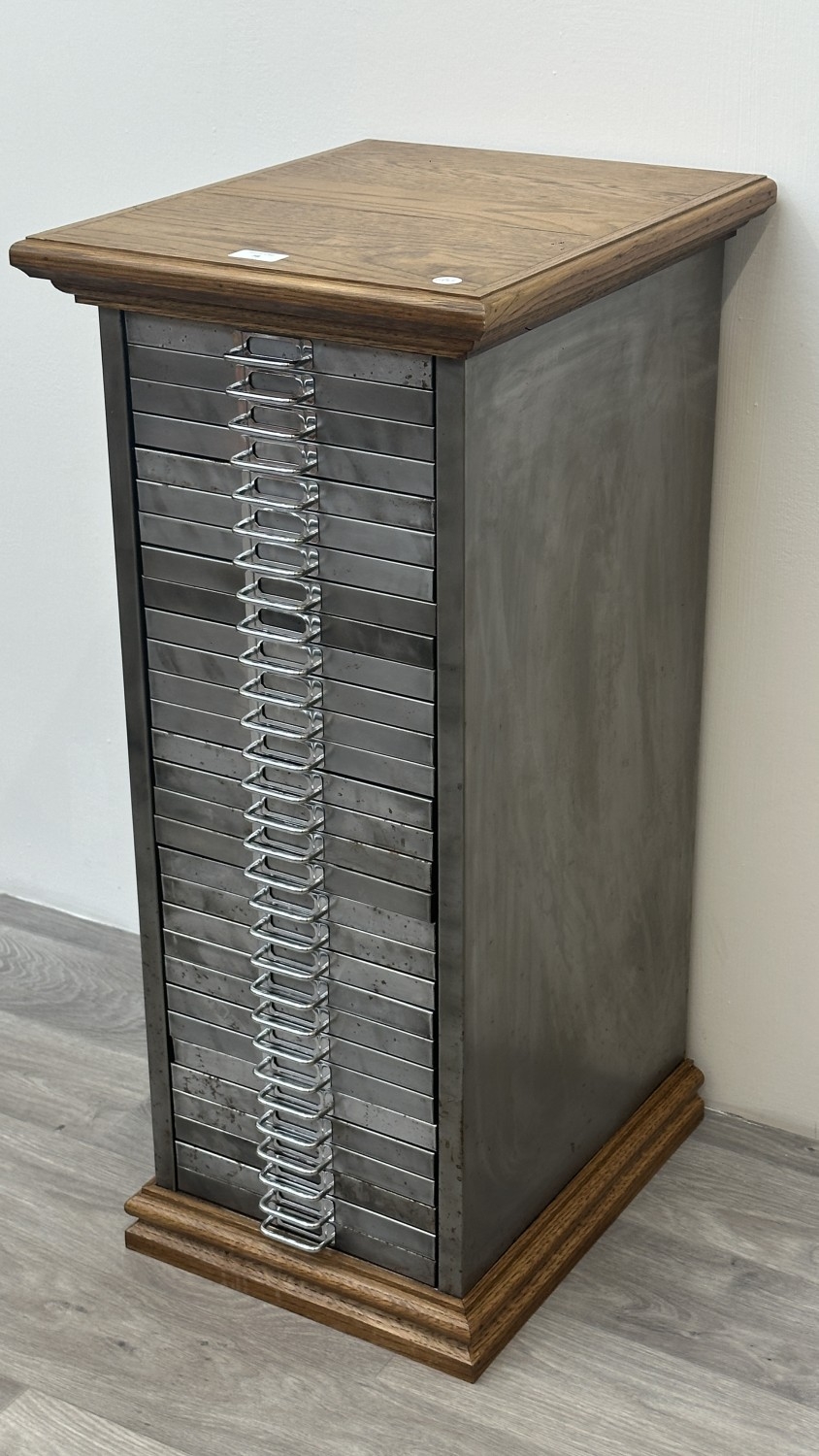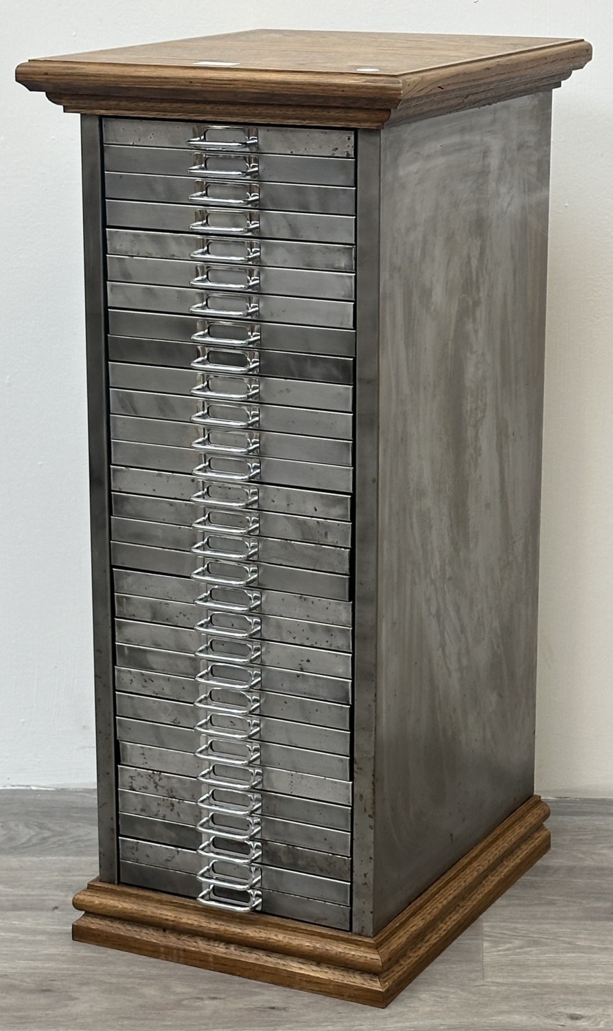 A 1930s upcycled metal thirty drawer filing cabinet with later oak top and base - approx. 88cm high x 38cm wide x 46cm deep