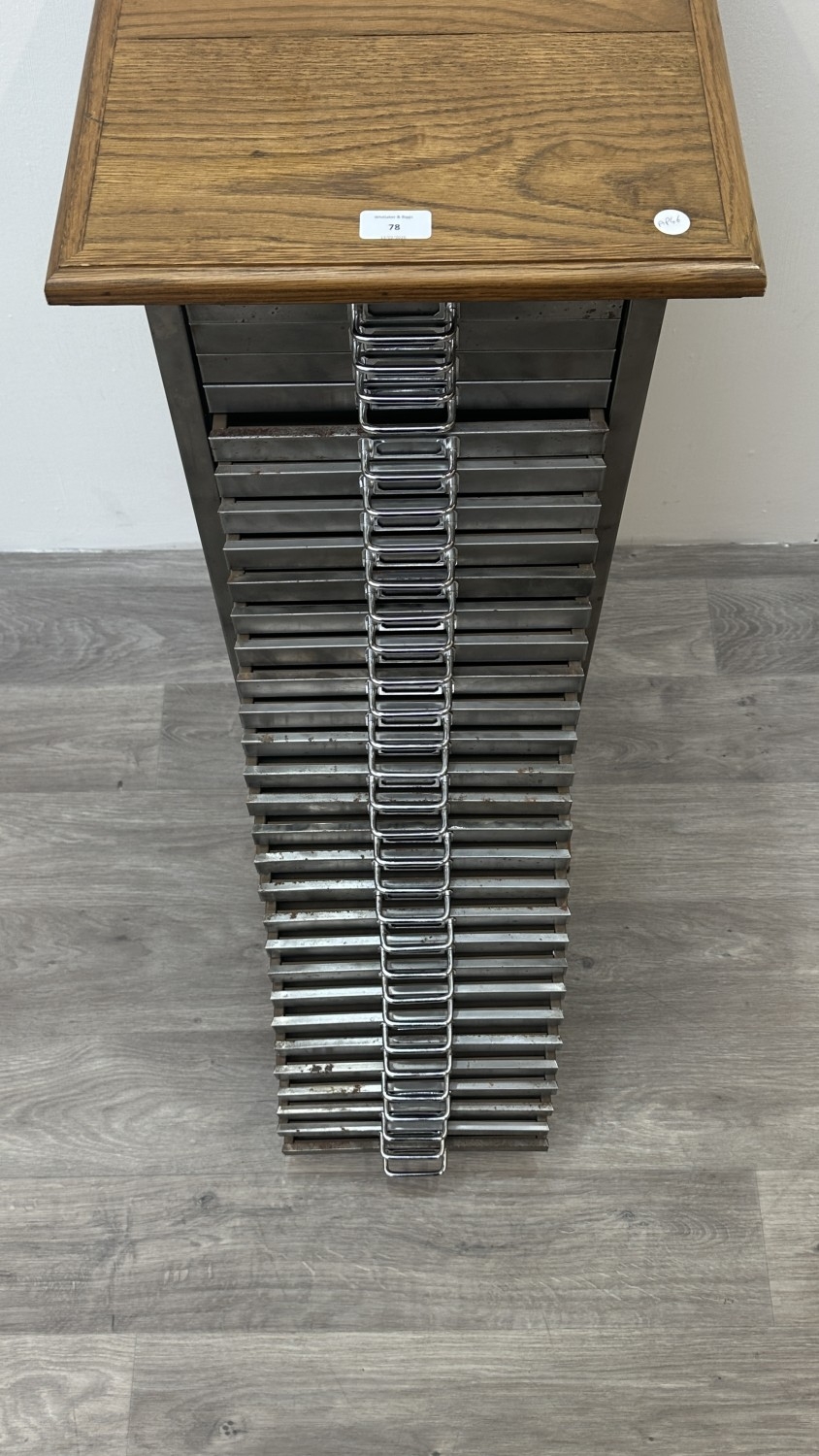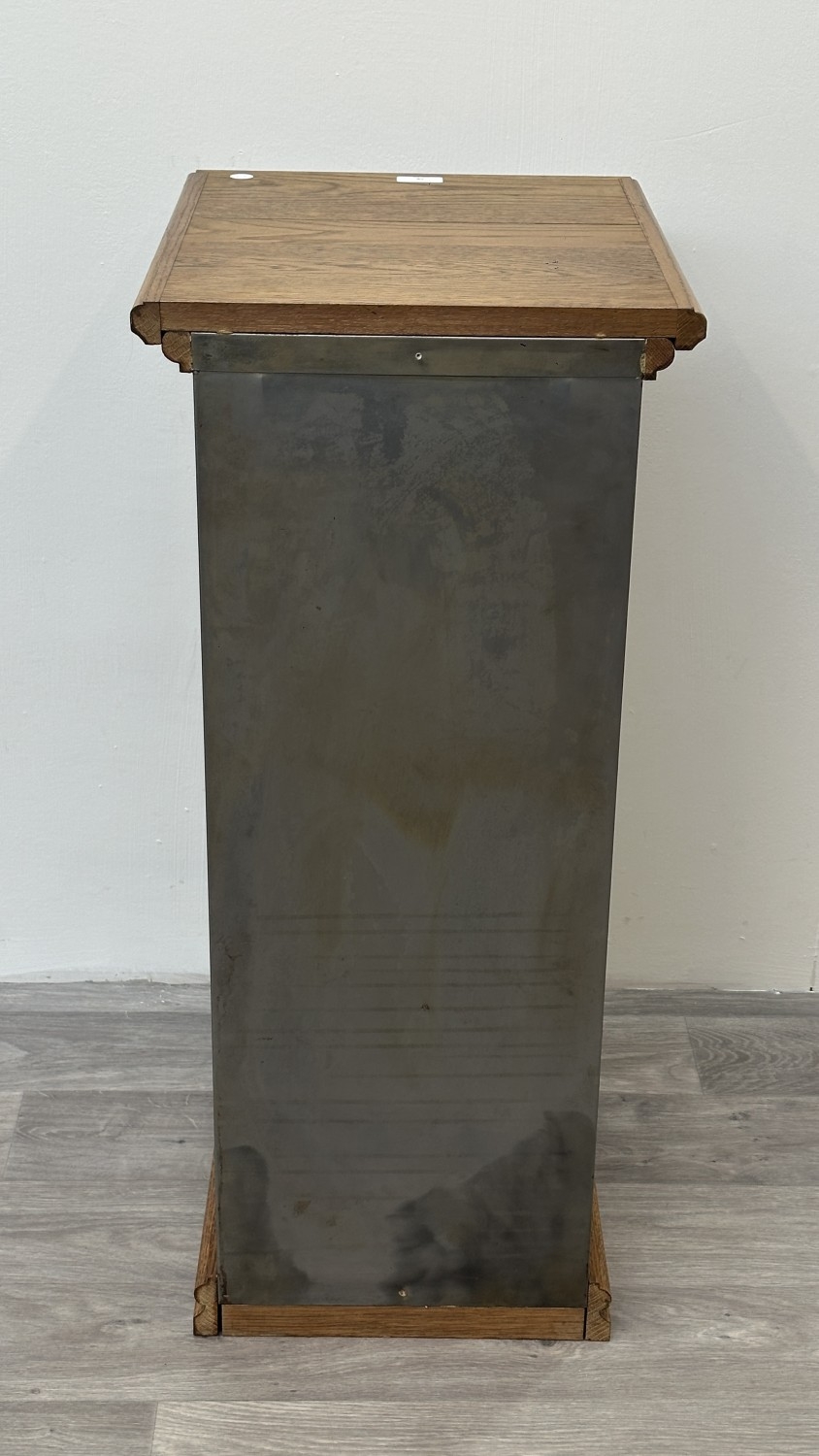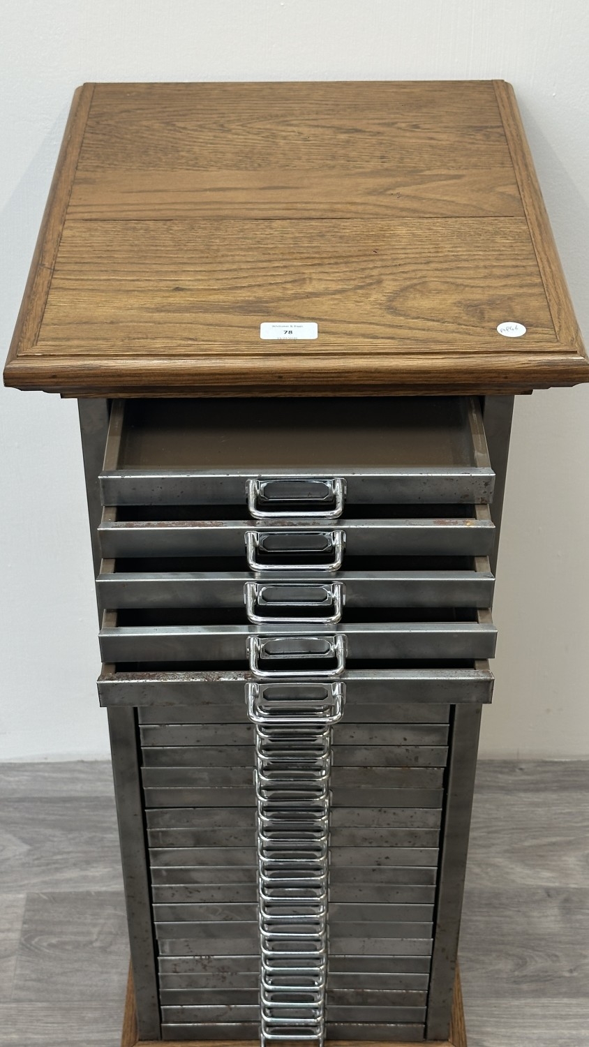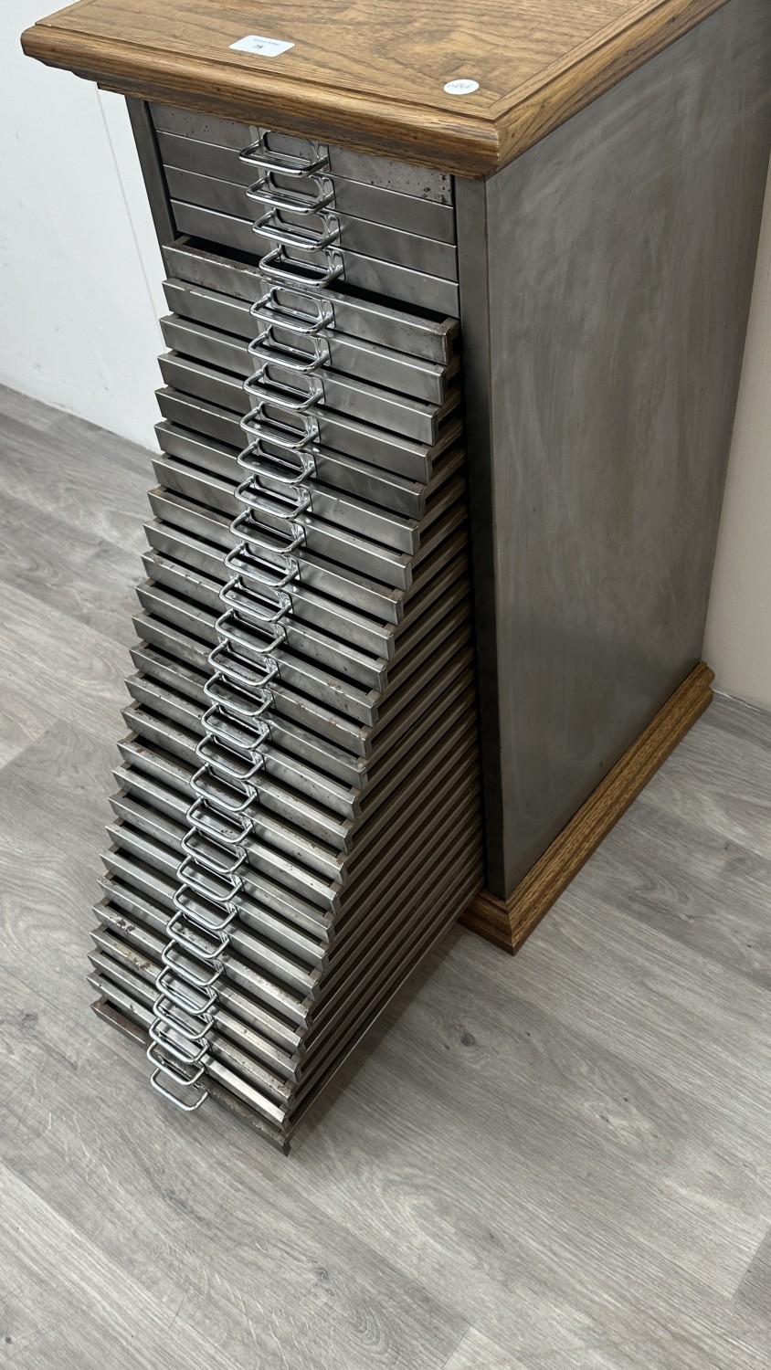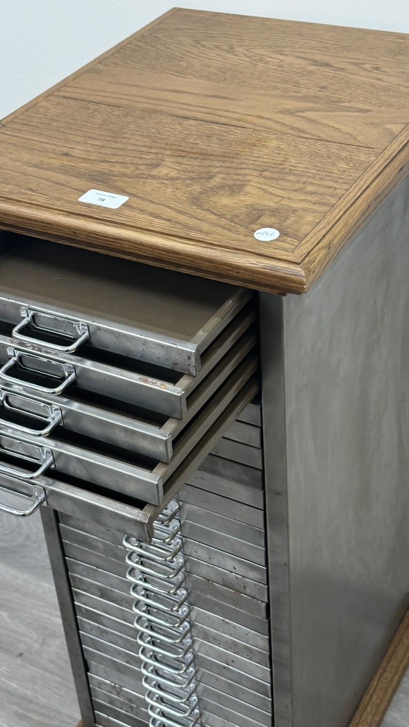 A 1930s upcycled metal thirty drawer filing cabinet with later oak top and base - approx. 88cm high x 38cm wide x 46cm deep