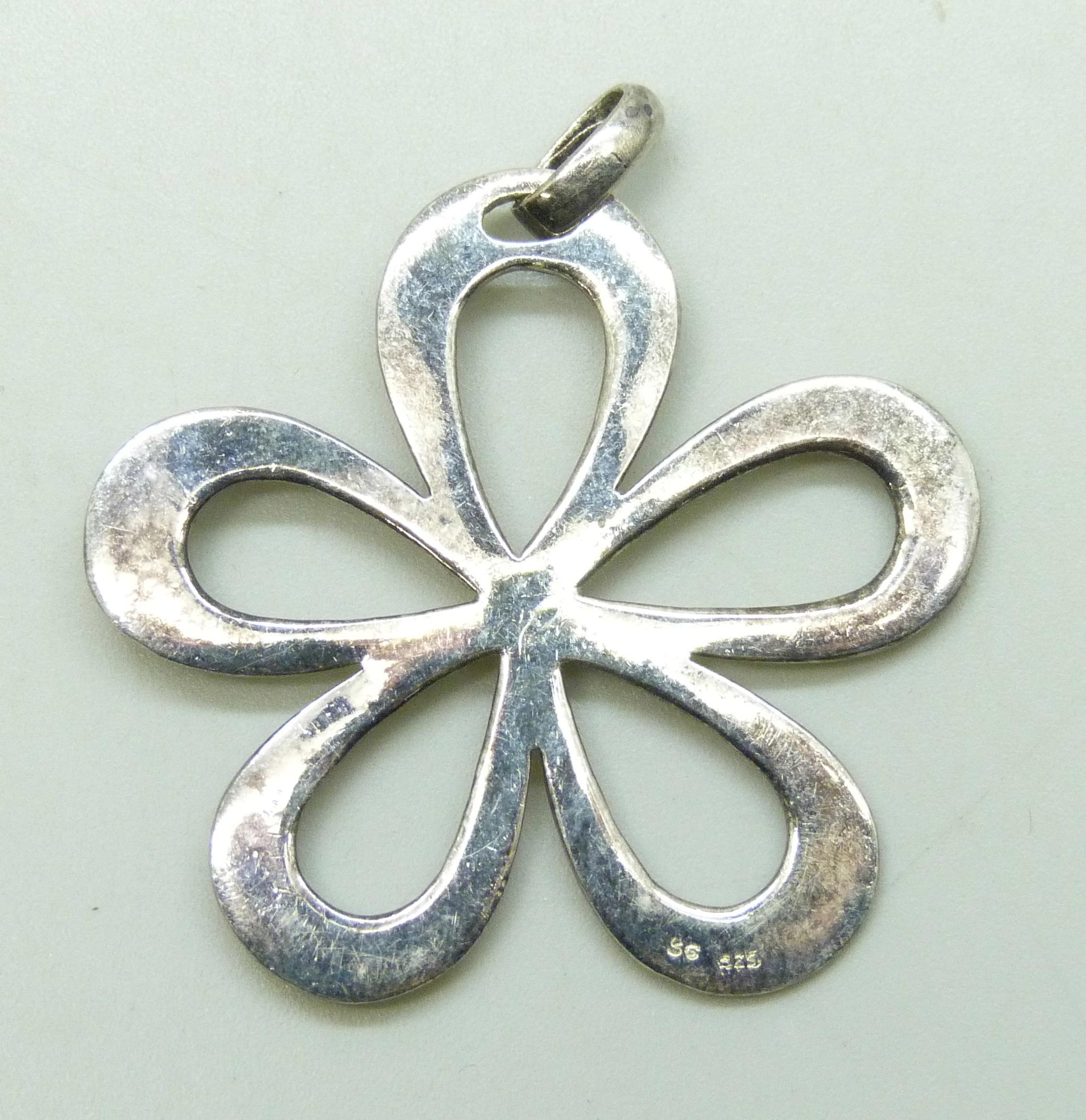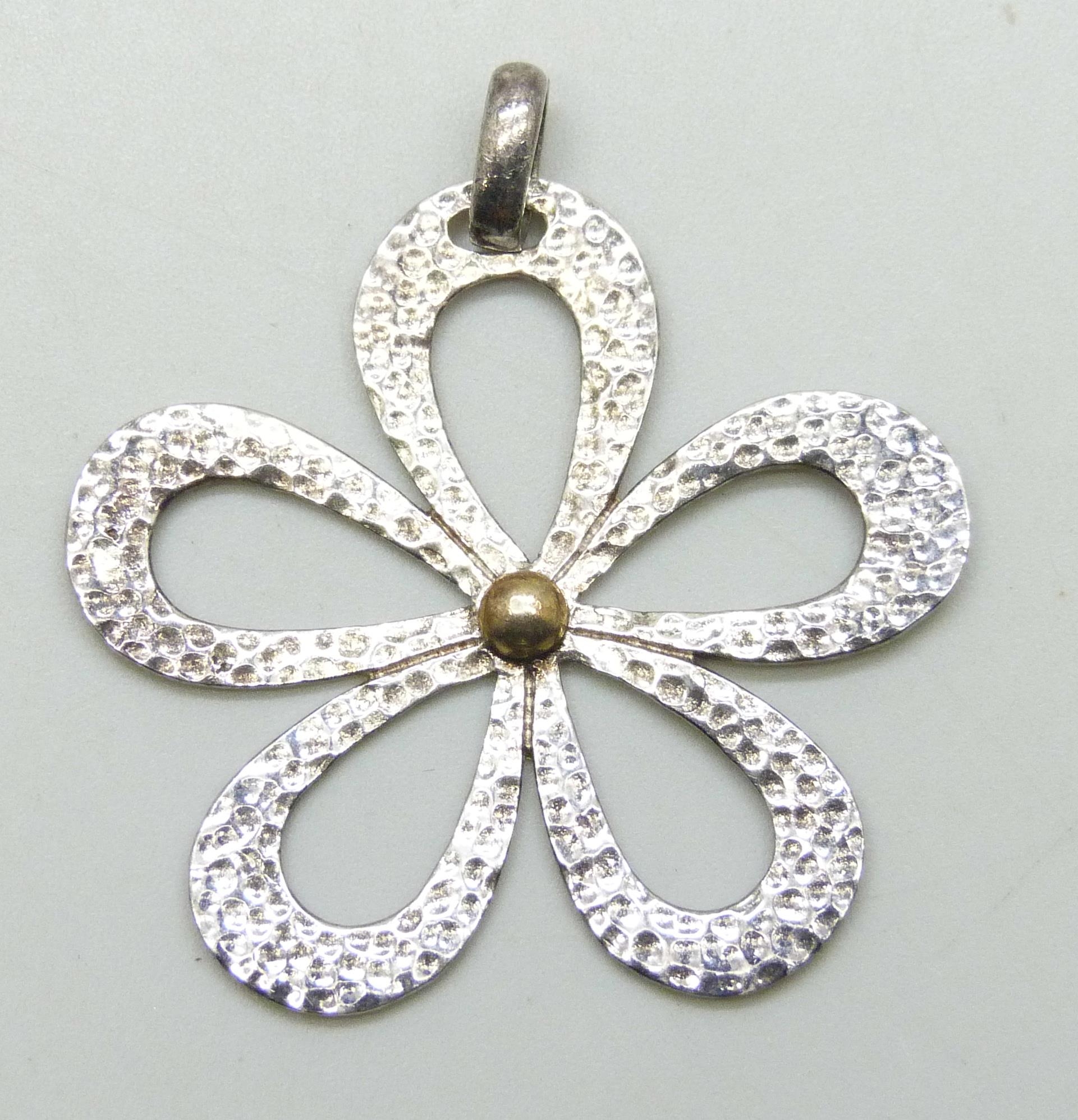 A silver hammered texture necklace pendant in the form of a flower, 4.5cm