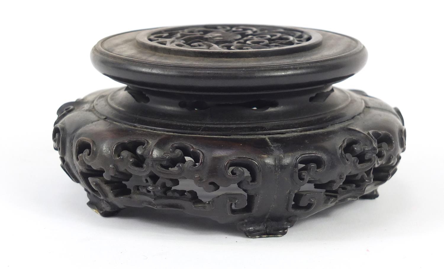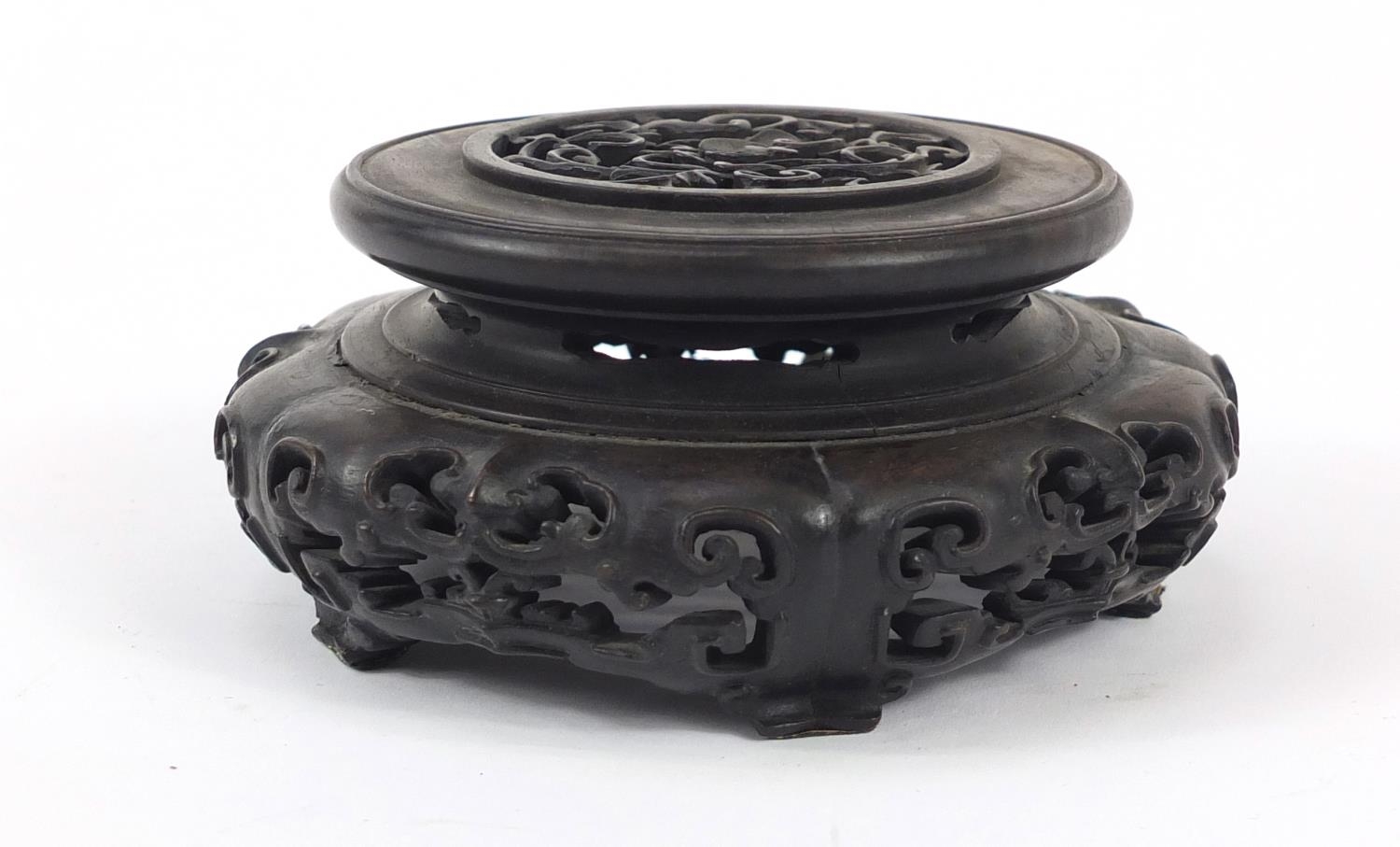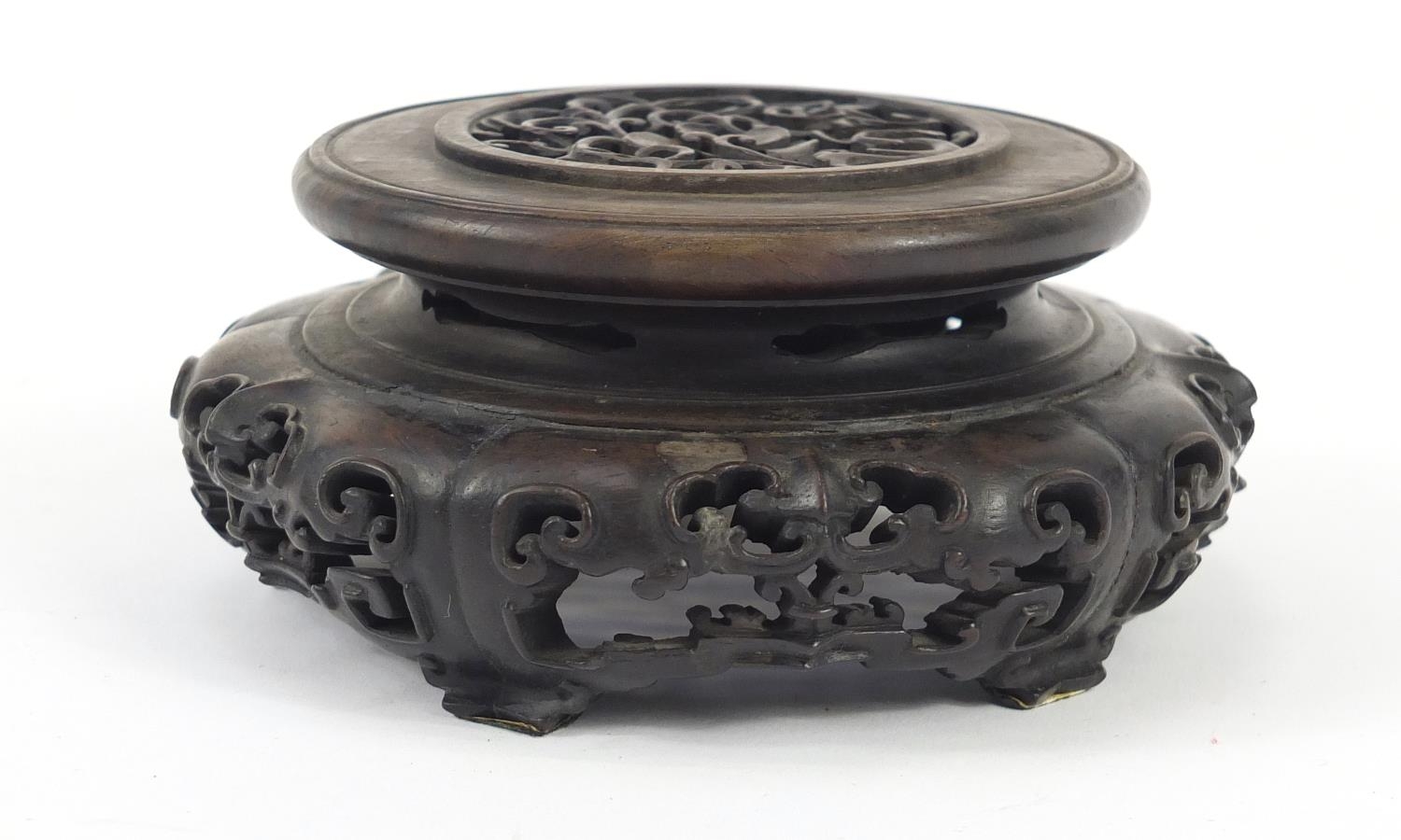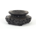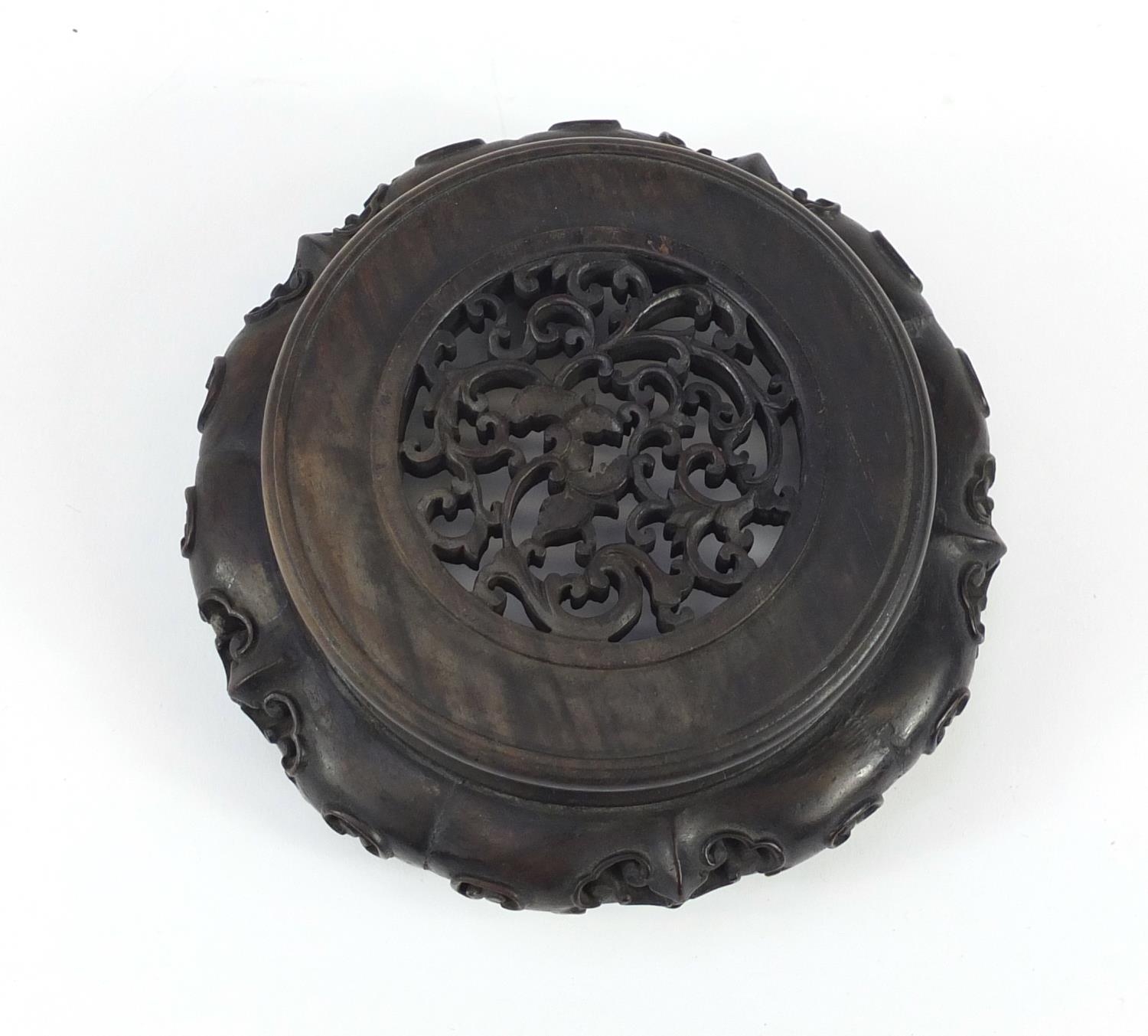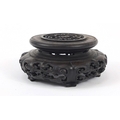 Good Chinese carved hardwood stand carved and pierced with flowers, 12cm in diameter