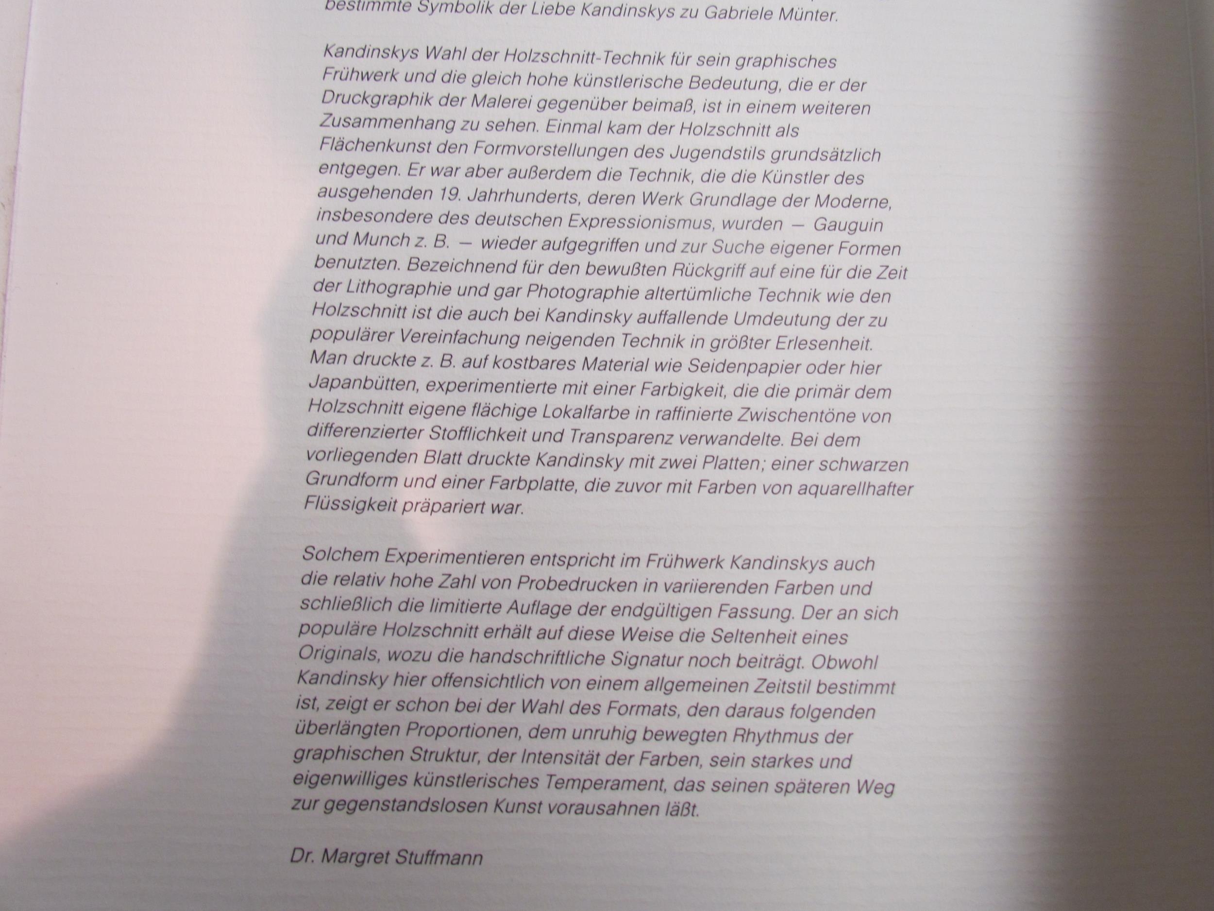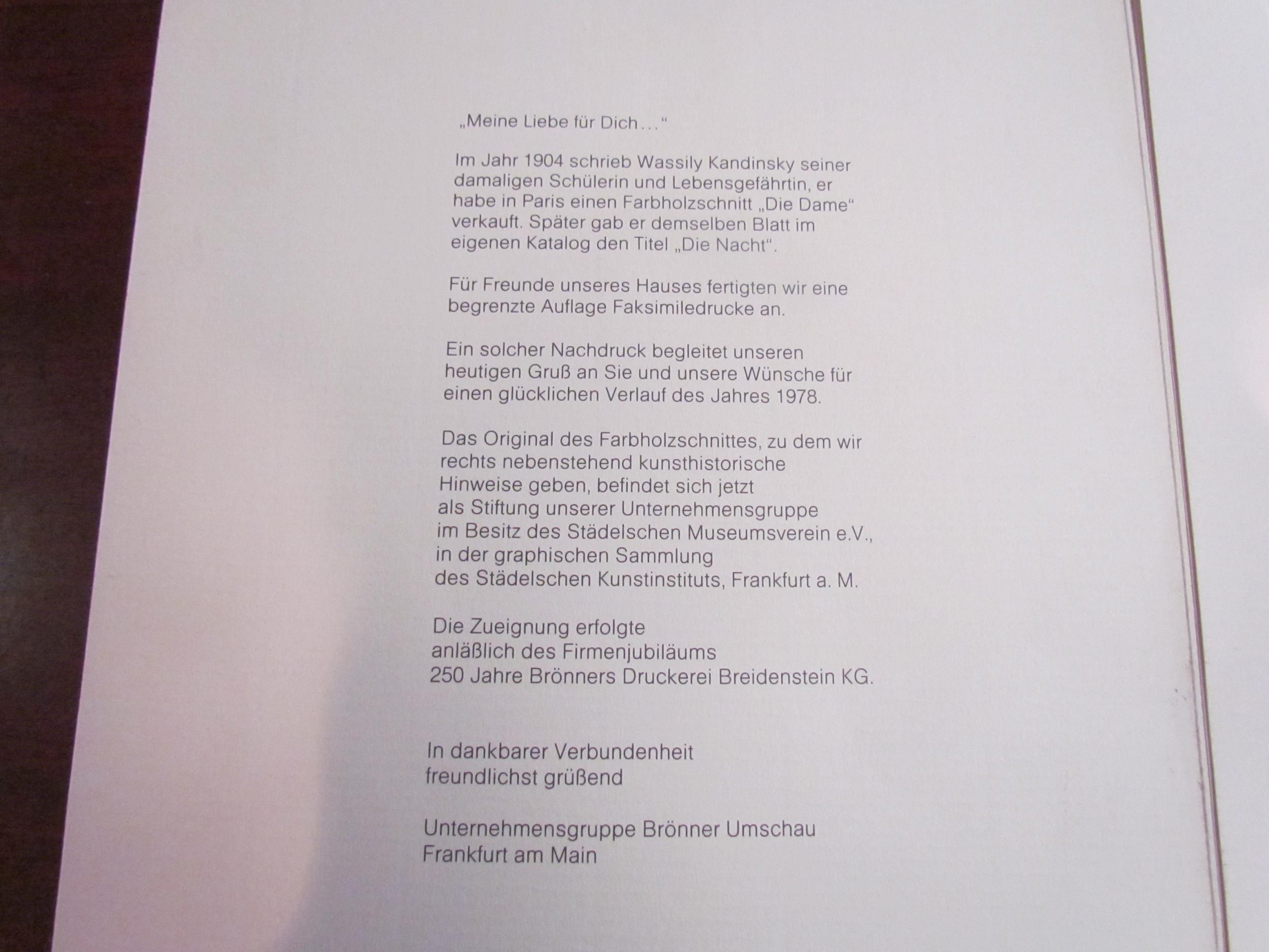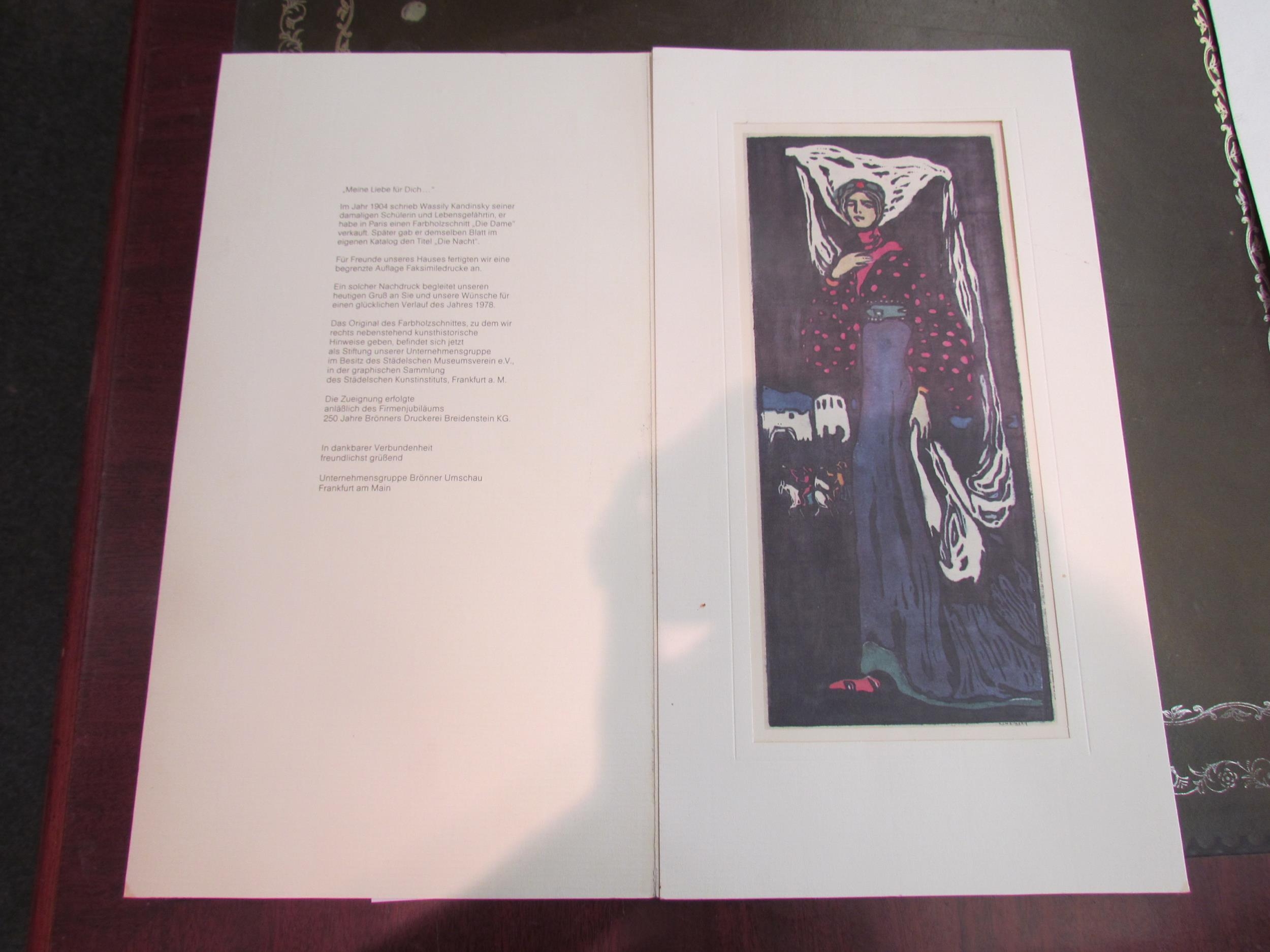 A 1978 facsimile print after the colour woodcut by Wassily Kandinsky 'The Night'. In folder as printed, Brönner Changeover Group. Image 30cm x 13cm (E) £50-70