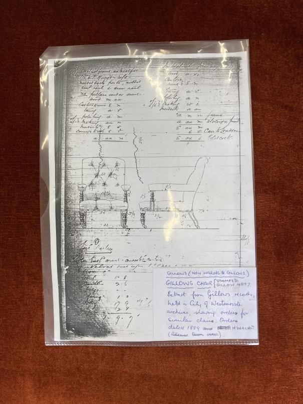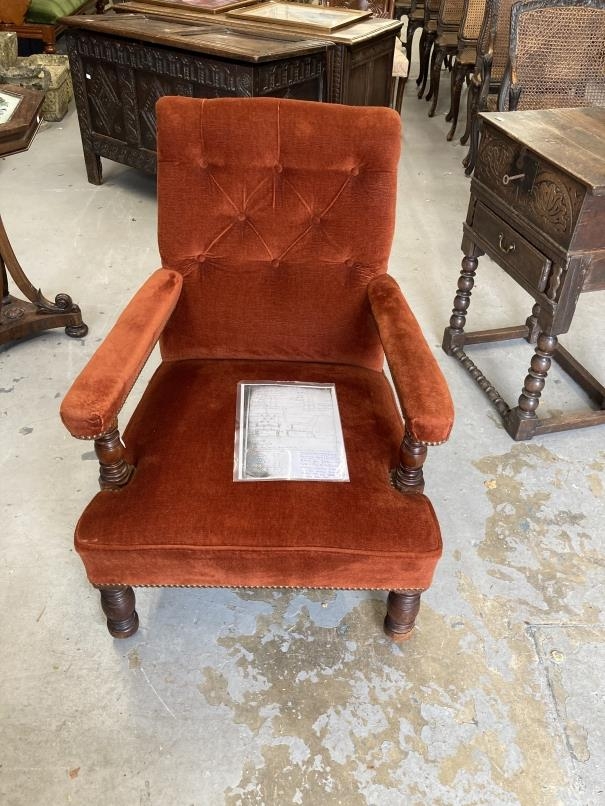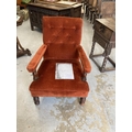 Gillows: Late Victorian walnut framed button back library stuff over arms armchair, rear leg stamped Gillow 14897 which dates it to 1889.